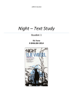 LORETO COLLEGE Night – Text Study Booklet 1 Ms Paine 8 ENGLISH 2014 Night by Eli Wiesel – Pre-Reading Webquest PART 1: Instructions: Working with a partner, carefully research each topic listed below. You must only use the resources available through the Webquest website (address below). Make sure that your notes are extensive and detailed, as you will need some knowledge of the Holocaust and World War 2 to truly understand Eli Wiesel’s memoir, Night. You are required to write at least five dot points of useful information under each topic. Use the five questions contained in the text box to help guide your notetaking. The answers are to be handwritten in your workbooks. They must not be typed. You will need them in lesson. Website: http://zunal.com/webquest.php?w=166419 It can also be accessed through a link Ms Paine’s blog at www.painejulieta.edublogs.org . (Note: Please ignore any reference to assessment in the Webquest. You are only required to do the work on this handout.) 1. Adolf Hitler 2. Nazi Party 3. Third Reich 4. World War 2 5. SS 6. Kristallnacht 7. Warsaw Ghetto 8. Resistance 9. Final Solution 10. Concentration Camp 11. Auschwitz 12. Death Marches 13. Holocaust 14. Eli Wiesel PART 2: Choose one of the videos that you watched during the WEBQUEST and explain why it moved you. 1. 2. 3. 4. 5. 6. 7. Title of video chosen. Describe the content of your chosen video. Why did you choose the video? What images did you find powerful? Was there anything memorable about the sound or dialogue? What other elements stood out for you? Now, can you explain why you found this video so emotionally potent? Give at least three reasons for your answer. 1 2 Night - Reading Journal Instructions: Complete these questions as you read the memoir in your English workbooks. CHAPTERS 1 AND 2 PERSONAL RESPONSE 1. What is your reaction to Moché the Beadle? What do you think about his treatment by the villagers after his return from Poland? Moche, despite his poverty, he is very religious and works in the temple. The villagers refuse to listen Moche’s warnings about the Nazis, after he returns, because he is considered to be of a very lowly social status and has no authority. They also don’t believe that what happened to the other Jews could happen to them. ANALYZING LITERATURE Recall and Interpret 2. Describe Wiesel’s community at the beginning of the story. How does young Elie view the world and his place in it? Wiesel’s village, Sighet, is a small village community in Rumania. The people are supportive of each other and there is a strong sense of community and being good neighbours. They see the war and the Nazi threat as something distant and far away from them. Wiesel at this stage of his life, sees his purpose as the only son, is to focus on his religious studies. He has a very strong faith in God. 3. What are some incidents that suggest or foreshadow the coming danger to the Sighet Jews? Why doesn’t the community believe it is in danger? Moshe the Beadle returns after being deported by the Nazis and describes how he and the other Jewish deportees were massacred. German officers from the Gestapo visiting the ghetto Elie’s father saying that the wearing of the stars weren’t that bad, followed in brackets by the statement “Poor father! Of what then did you die!”. Night before they were to be deported, a police officer and friend of the family knocked at one of their windows and tried to warn them. Madame Schacter’s prophetic warning of seeing a “fire”, that hints at the gas chambers and crematoriums of the concentration camps. Famiy maid offer Elie’s family a place to stay. Elie’s father refues to sell-up and immigrate to Palestine. 4. What are the conditions on the Jews’ train journey? How do the Jews react to Madame Schäcter’s behavior? What does this reveal about human nature? On their train journey to the concentration camps, the Jewish people exist in cramped, dirty condition with almost nowhere to sit or lie down and little or no food or water. The other Jews believe that Madame Schacter has gone mad and try to ignore her warnings about the “fire” and focus solely on themselves and their own family’s survival. 3 Evaluate and Connect 5. What connection might there be between Madame Schäcter’s treatment on the train and possible future events in the concentration camp? What are some other ways that Wiesel foreshadows, or hints at, the horrors ahead? Foreshadowing is a technique where a writer hints at what is to come in a text, so as to increase tension and suspense. Madame Schacter’s cry of “fire” foreshadows the fires in the crematorium. Weisel’s distant cousin asking for information about his family, which highlight that people are disappearing (being killed) with no explanation. Eventually, many people will become more interested in looking after themselves than others. Moche the Beadle’s warnings about what the Nazis are doing to the Jews, as he survived a massacre. The attempt by the Hungarian police officer to warn Wiesel’s family about what is to come. 6. Even though it was 1944, and Nazi extermination of Jews had begun years earlier, the Sighet Jews had very few facts about it. Do you think it is possible in today’s world for a community to know so little, to be so unprepared? Explain. In today’s western society, it would almost impossible for a community not to know about any potential threats due to widespread access to the internet and news reports via television and radio that almost instantaneous. There is also the use of mobile phone networks and social media to warn people about potential disasters. CHAPTERS 3 TO 5 PERSONAL RESPONSE 1. When he arrives at Auschwitz and then at Buna, Wiesel describes scenes he will never forget. What scenes, ideas, or feelings from the memoir do you find unforgettable? Lining people up to go to the gas chambers then the crematorium. Using babies target price “Men to the left, women to