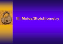 III. Moles/Stoichiometry A compound is a substance composed of two or more different elements that are chemically combined in a fixed proportion. A chemical compound can be broken down by chemical means (not physical means.) A chemical compound can be represented by a specific chemical formula and assigned a name based on the IUPAC system. (3.1cc) Compounds are electrically neutral. J Deutsch 2003 2 Regents Question: 08/02 #6 Which species represents a chemical compound? (1) N2 (2) Na (3) NH4+ A compound is made up of 2 or more different elements. A compound is electrically neutral. (4) NaHCO3 J Deutsch 2003 3 A chemical formula is both qualitative and quantitative. It tells which elements are in the compound with symbols and how many of each with subscripts The formula for sulfuric acid is H2SO4 Element Number of atoms H 2 S 1 O 4 The subscript 1 is never written in a formula J Deutsch 2003 4 Compounds have more than one capital letter in the formula Binary Compounds – Composed of just two elements (2 capital letters) •Water H2O 2 elements 3 atoms •Methane CH4 2 elements 5 atoms •Ammonia NH3 2 elements 4 atoms •Aluminum oxide Al2O3 2 elements 5 atoms Other Compounds -more than 2 elements (more than 2 capital letters) J Deutsch 2003 •Potassium hydroxide KOH 3 elements 3 atoms •Calcium sulfate CaSO4 3 elements 6 atoms •Ammonium phosphate (NH4)3PO4 4 elements 20 atoms 5 Regents Question: 06/03 #9 Which substance can be decomposed by a chemical change? (1) Co (2) CO (3) Cr (4) Cu J Deutsch 2003 6 Types of chemical formulas include empirical, molecular, and structural. (3.1ee) Molecular Formula Empirical Formula Structural Formula Which elements and how many of each in a molecule Which elements and the ratio of how many of each Shows the bonds and how the atoms are arranged C2H6 J Deutsch 2003 CH3 H H C H H C H H 7 The empirical formula of a compound is the simplest wholenumber ratio of atoms of the elements in a compound. It may be different from the molecular formula, which is the actual ratio of atoms in a molecule of that compound. (3.3d) Hydrogen peroxide molecular formula: H2O2 empirical formula: HO J Deutsch 2003 Sugar C6H12O6 CH2O 8 Regents Question: 06/03 #8 Which is an empirical formula? (1) P2O5 (2) P4O6 (3) C2H4 (4) C3H6 J Deutsch 2003 9 The molecular formula must be a whole number multiple of the empirical formula Molecular Formula H2O2 C3H6 C6H12O6 Hg2O2 J Deutsch 2003 Empirical Formula HO CH2 CH2O HgO Multiple 2 3 6 2 10 The formula mass must be a whole number multiple of the empirical mass Molecular Formula Mass H2O2 34 C3H6 42 C6H12O6 180 Hg2O2 434 J Deutsch 2003 Empirical Formula Mass HO 17 CH2 14 CH2O 30 HgO 217 Multiple 2 3 6 2 11 To find the formula of a compound, use the criss-cross method Write the symbol and oxidation state of the metal (lower electronegativiy if both are nonmetals) in the upper right hand corner of the symbol. Positive oxidation state is written first. Repeat for nonmetal (-) C4+ O2 Drop the sign C4 O2 Criss Cross C2 O4 Reduce if possible CO2 Although Carbon and Oxygen are both nonmetals, Carbon has a lower electronegativity and therefore uses a positive oxidation number J Deutsch 2003 12 When using the criss-cross method with polyatomic ions, use parenthesis ( ) Write the symbol and oxidation state of the metal (+ ion) J Deutsch 2003 in the upper right hand corner of the symbol. Repeat for nonmetal (- ion) (NH4) 1+ (PO4) 3Drop the sign (NH4) 1 (PO4) 3 Criss Cross (NH4) 3 (PO4) 1 Reduce if possible (numbers outside parenthesis only) If there is no number following the parenthesis, drop the parenthesis. (NH4)3 PO4 13 The oxidation states of the elements are available on the Periodic Table of the Elements J Deutsch 2003 14 Polyatomic ions are found on Reference Table E J Deutsch 2003 15 Naming Ionic Compounds Compounds between a metal and a nonmetal – Name the metal – Name the nonmetal with an IDE ending • Ammonium chloride • Barium sulfide Aluminum oxide Zinc fluoride If the negative ion is a polyatomic ion – Name the metal – Name the polyatomic ion • Sodium Nitrate J Deutsch 2003 Calcium phosphate 16 The Stock System Naming ionic compounds in which the metal has more than one oxidation state (polyvalent) Check the Periodic Table to see if the metal has more than one oxidation state if it does… Determine the oxidation state of the metal – Use the oxidation state of the nonmetal and the subscripts The oxidation state of the metal is written as a roman numeral in parenthesis after the name of the metal – CuSO4 Copper(II) Sulfate J Deutsch 2003 17 Finding the oxidation state of a polyvalent metal The net charge of a compound must be zero The number of + charges must equal the total number of – charges Multiply the oxidation state of the nonmetal by the subscript for the nonmetal Divide that number by the subscript of the metal – PbO2 the oxidation state of oxygen is –2 we multiply the 2 by the subscript 2 and get 4. Divide the 4 by the subscript for the lead (1) and get 4. The oxidation state for the lead is 4 and the name is Lead(IV)oxide J Deutsch 2003 18 Regents Question: 06/03 #19 Which formula correctly represents the composition of iron (III) oxide? (1) FeO3 (2) Fe2O3 (3) Fe3O (4) Fe3O2 J Deutsch 2003 19 Naming molecular compounds – compounds between nonmetals Use a prefix to indicate how many of each element mono 1 (never used for first element) di 2 tri 3 tetra 4 J Deutsch 2003 CO2 CO N2O4 BCl3 Carbon dioxide Carbon monoxide Dinitrogen tetraoxide Boron trichloride 20 In all chemical reactions there is a conservation of mass, energy, and charge. (3.3a) •Matter cannot be created nor destroyed, only changed from one form to another •Energy cannot be created nor destroyed, only changed from one form to another J Deutsch 2003 21 A balanced chemical equation represents conservation of atoms. The coefficients in a balanced chemical equation can be used to determine mole ratios in the reaction. (3.3c) •A 