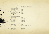 The Matter of England First Tetralogy Henry VI Part 1 Henry VI Part 2 Henry VI Part 3 Richard III 1592 1591 1591 1592-3 Second Tetralogy Richard II 1 Henry IV 2 Henry IV Henry V 1595 1596-97 1597-98 1598-99 King John Henry VIII 1596 1613 (with Fletcher) King Lear Cymbeline 1605-06 1610 YORK: Seek you to seize and gripe into your hands The royalties and rights of banished Hereford? Is not Gaunt dead? And doth not Hereford live? … Take Hereford’s rights away, and take from Time His charters and his customary rights Let not tomorrow then ensue today; Be not thyself, for how art thou a king But by fair sequence and succession? … KING RICHARD: Think what you will, we seize into our hands His plate, his goods, his money and his lands. Richard II, 2.1.190-200, 210-11. ****** RICHARD: I wasted time, and now doth time waste me. Richard II, 5.5.49 [Richard’s original ‘fault’? Action & Consequence] RICHARD: Northumberland, thou ladder wherewithal The mounting Bolingbroke ascends my throne, The time shall not be many hours of age More than it is ere foul sin, gathering head, Shall break into corruption. Thou shalt think, Though he divide the realm and give thee half, It is too little helping him to all. He shall think that thou, which know’st the way To plant unrightful kings, wilt know again, Being ne’er so little urged another way, To pluck him headlong from the usurpèd throne. The love of wicked friends converts to fear, That fear to hate, and hate turns one or both To worthy danger and deserved death. NORTHUMBERLAND: My guilt be on my head and there an end. (Richard II, 5.1.55-69) KING HENRY: ’Tis not ten years gone Since Richard and Northumberland, great friends, Did feast together; and in two year after Were they at wars. It is but eight years since This Percy was the man nearest my soul, Who like a brother toiled in my affairs, And laid his love and life under my foot, Yea, for my sake, even to the eyes of Richard Gave him defiance. But which of you was by, You, cousin Neville, as I may remember, When Richard, with his eye brimful of tears, Then checked and rated by Northumberland, Did speak these words, now proved a prophecy? – ‘Northumberland, thou ladder by the which My cousin Bolingbroke ascends my throne’ – Though then, God knows, I had no such intent, But that necessity so bowed the state That I and greatness were compelled to kiss – ‘The time shall come’ – thus did he follow it – ‘The time shall come that foul sin, gathering head, Shall break into corruption’; so went on, Foretelling this same time’s condition, And division of our amity. (Henry IV Part 2, 3.1.52-74) WARWICK: There is a history in all men’s lives Figuring the natures of the times deceased; The which observed, a man may prophesy, With a near aim, of the main chance of things As yet not come to life, who in their seeds And weak beginnings lie intreasurèd. Such things become the hatch and brood of time; And by the necessary form of this King Richard might create a perfect guess That great Northumberland, then false to him, Would of that seed grow to a greater falseness, Which should not find a ground to root upon Unless on you. Henry IV Part 2 3.1.75-85 ‘what’s past is prologue’ (Antonio, The Tempest, 2.1.248) KING HENRY: Had I so lavish of my presence been So common-hackneyed in the eyes of men, So stale and cheap to vulgar company, Opinion, that did help me to the crown, Had still kept loyal to possession, And left me in reputeless banishment, A fellow of no mark nor likelihood. By being seldom seen, I could not stir But like a comet I was wondered at, That men would tell their children, ‘This is he.’ Others would say, ‘Where, which is Bolingbroke?’ And then I stole all courtesy from heaven, And dressed myself in such humility That I did pluck allegiance from men’s hearts, Loud shouts and salutations from their mouths, Even in the presence of the crownèd King. Thus did I keep my person fresh and new, My presence like a robe pontifical – Ne’er seen but wondered at – and so my state, Seldom but sumptuous, showed like a feast, And won by rareness such solemnity. Henry IV Part 1, 3.2.39-59 [Compare Richard II, 5.2.7-21, ‘great Bolingbroke/ Mounted upon a hot and fiery steed…/Bare-headed, lower Than his proud steed’s neck, / Bespake them thus: “I thank you countrymen”.’] KING HENRY: The skipping King, he ambled up and down With shallow jesters and rash bavin wits, Soon kindled and soon burnt, carded his state, Mingled his royalty with cap’ring fools, Had his great name profaned with their scorns, And gave his countenance, against his name, To laugh at gibing boys and stand the push Of every beardless vain comparative; Grew a companion to the common streets, Enfeoffed himself to popularity, That, being daily swallowed by men’s eyes, They surfeited with honey, and began To loathe the taste of sweetness, whereof a little More than a little is by much too much. So when he had occasion to be seen, He was but as the cuckoo is in June, Heard, not regarded, seen but with such eyes As, sick and blunted with community, Afford no extraordinary gaze Such as is bent on sun-like majesty When it shines seldom in admiring eyes, But rather drowsed and hung their eyelids down, Slept in his face, and rendered such aspect As cloudy men use to their adversaries, Being with his presence glutted, gorged, and full. Henry IV Part 1, 3.2.60-84 HOTSPUR: Shall it for shame be spoken in these days, Or fill up chronicles in time to come, That men of your nobility and power Did gage them both in an unjust behalf, As both of you, God pardon it, have done: To put down Richard, that sweet lovely rose, And plant this thorn, this canker, Bolingbroke? Henry IV Part I, 1.3.168-174 History is ‘ago’. About ‘them’. History is ‘now’. About ‘us’. Cf. soliloquy, direct address + making the audience ‘vulgar’ ‘opinion’ ‘popularity’ ‘community’ ‘common’