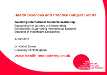 Health Sciences and Practice Subject Centre Teaching International Students Workshop Supporting the Journey to Independent Scholarship: Supervising International Doctoral Students in Healthcare Disciplines 17/02/2011 Dr. Catrin Evans University of Nottingham www.health.heacademy.ac.uk Supporting the Journey to Independent Scholarship: Supervising International Doctoral Students in Healthcare Disciplines Dr. Catrin Evans HEA, February 2011 Transitions and Challenges in International Doctoral Study in the Healthcare Disciplines 1. Transition to life in the UK 2. Transition from Masters to Doctoral level study 3. Engagement with UK academic culture & practices (including supervision practice) 4. Understanding of UK healthcare context 5. (For some) learning in a second language Objectives of the Presentation 1. To explore the meaning of doctoral supervision from the perspective of international doctoral nursing students: – expectations of the doctorate & of supervision – the evolving supervision relationship – the contradictions of supervisory guidance in supporting autonomous scholarship 2. To identify good practice in supporting and supervising international doctoral students 3. In the context of the doctorate, to explore ways in which doctoral students engage with practice contexts & make suggestions for facilitating knowledge transfer Background • Nursing faces a critical human resource crisis, including a shortage of educators and researchers • A key strategy to develop nursing capacity in many countries is to support nurses to obtain doctoral degrees. • Rationale for the PhD will vary depending on the national context of nursing careers (practice/policy/education/administration) • Currently, only 32 countries offer doctoral programmes in nursing (INDEN, 2005) • Many nurses need to go overseas for a PhD • UK is a popular destination UK Context • 124 out of 692 doctoral nursing students are ‘international’ (EU & Non-EU) - approx. 15% of the total (HESA 2007/08) • Majority of international students undertake the ‘traditional’ PhD – research focused, self-directed, no mandatory taught courses, dual supervision, substantial dissertation, emphasis on development of transferable skills • Massive financial investment: minimum of £56,700 – (£10,500 per year tuition fees + £8,500 per year subsistence). • Duration is usually 3-4 years, so also massive personal investment. • Lack of evidence on the learning experiences of international doctoral nursing students in the UK & lack of evidence on what they do when they return home QAA (2008): What are the Outcomes of Doctoral Level Study? • • • • • • • the creation and interpretation of new knowledge, through original research or other advanced scholarship, of a quality to satisfy peer review, extend the forefront of the discipline, and merit publication; a systematic acquisition and understanding of a substantial body of knowledge which is at the forefront of an academic discipline or area of professional practice; the general ability to conceptualise, design and implement a project for the generation of new knowledge, applications or understanding at the forefront of the discipline, and to adjust the project design in the light of unforeseen problems; a detailed understanding of applicable techniques for research and advanced academic enquiry. make informed judgements on complex issues in specialist fields, often in the absence of complete data, and be able to communicate their ideas and conclusions clearly and effectively to specialist and non-specialist audiences; continue to undertake pure and/or applied research and development at an advanced level, contributing substantially to the development of new techniques, ideas, or approaches; and will have: the qualities and transferable skills necessary for employment requiring the exercise of personal responsibility and largely autonomous initiative in complex and unpredictable situations, in professional or equivalent environments. Autonomy, criticality, problem solving, new applications, working in a context of uncertainty Doctoral Training Context Factors that support doctoral study……. • • • • Research training Transferable skills training Peer support Research environment – socialisation, formation of disciplinary identity, role modelling, formation of key networks • Supervision – the ‘black box’ Key Question for Supervisors……. • How to teach and guide whilst simultaneously supporting the development of autonomous scholarship? Presentation Focus • How do international doctoral nursing students experience doctoral supervision? Insights/Reflections Based on 2 Research Studies + Personal Experience 1. Qualitative interviews (in 2008/09) with 17 international doctoral nursing students from 6 different universities across the UK (perspectives of the current PhD journey) 2. Qualitative interviews (in 2009/10) with 16 graduates from UK nursing PhD programmes, now all working in Jordan (looking back at the PhD & perspectives on knowledge transfer back home) 3. 5 years experience running a PhD programme (95 students, approximately one third are international) 4. Personal experience of being a supervisor to 8 international PhD students Expectations of the Doctorate Taught Programmes When I came and start doing my PhD I never thought it would become purely dependent on the student, and the supervisor just will give you headings, or guidelines, I thought it was like, just a total programme……... I didn’t think it would be pure research, just by learning by yourself . I was expecting research courses, nursing courses…….(Mona, Jordan) Professional Focus This is the problem we all have now. If we go back to our country someone will say ‘what is UK healthcare system’? We don’t know, because we don’t have a chance to go into the field, we didn’t have a chance to observe. It will be very useful because we are l