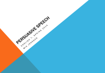 PREPARED SPEECH Speech/presentation One-way communication where you produce language actively in front of an audience. It can be neatly planned speech performed with an exact wording from a well-rehearsed script, (like a weeding speech) or it can be any situation in which you present a topic to an audience. Debate A situation in which you argue a point of view according to a fixed procedure. There are one or more opponents who do not share your views and the point is either to try and reach an agreement or to convince the audience of your point of view. ARGUMENTATIVE SPEECH - Goal: to make people believe in your ideas! - Often political (taxes, education etc.) or emotional/ethical topic (animal testing, death penalty etc.) - Showing that you are passionate about your idea while not getting too carried away is the key to success! - Clear structure and preparations needed. - Let body language reinforce your message. - Same outline as an argumentative essay: Thesis statement + three main ideas - Use of rhetorical devices such as metaphors and similes. RHETORIC - The art of persuasion! - Three cornerstones: * Ethos (Greek for character): using character, credibility and ethics to persuade. * Pathos (Greek for suffering or experience): using emotions and passion to persuade. * Logos (Greek for word): using logical reasoning and evidence to persuade. DEFINING ETHOS, PATHOS, LOGOS ”I was not born a rich man, but I am an honest man, and I am a man of morals. The rich have us plough their fields, feed and care for their cattle, and reap their harvest – for their profits, not for our own. What do we get? A roof over our heads, true, but what else? We hardly even have any food on our plates! Just last year, my youngest died of starvation in the field, working for the benefit of the rich farmer. He faded in my arms pleading to me to save him, but I could not. All this while I could see the rich people’s house gleaming of candle light over the dinner party that was given that night! We see so many riches go through our hands each day, only to end up in the hands of our masters who give us nothing in return. How is this fair? My brothers; the rich are but a handful in number, but look at us; we are scores! We are strong! We are angry! Let us fight back and over through the people threatening our very existence and lives! I see around me, honest working men who strive to feed their families, just as I do, and I see them suffer, just like I do. Come with me! We are the power of this land, let us take what is rightfully ours by labor and sweat – let us claim our lives back from the ones who are holding us back!” RHETORICAL DEVICES #1 Metaphors #2 Similes #3 Personification #4 Hyperbole #5 Alliteration #6 Triad #7 Repetition #8 Parallelism #9 Rhetorical question #10 Emotional language RHETORICAL DEVICES #1 METAPHORS A figure of speech in which a term or phrase is applied to something to which it is not literally applicable in order to suggest a resemblance. Implied rather than introduced by ”like” or ”as”. Example1 His hair was a lion’s mane (to describe someone’s look and compare him/her to a powerful beast) Example 2 The pile of dirt is high, but we have many shovels (to show that a problem can be solved even if it looks hard) RHETORICAL DEVICES #2 SIMILES A”milder” form of a metaphor; a comparison is usually introduced with the words as or like. By making a comparison you emphasize the content of your own words and produce a strong picture in your audience’s mind. Example1: You are as beautiful as a rose. Example2: His arms were weak and felt like noodles. RHETORICAL DEVICES #3 PERSONIFICATION A particular way of using a metaphor or simile to emphasize an idea. To make a personification, you take a ”dead” object and give it life by describing it as if it were alive. Thereby you have a stronger chance of gaining empathy from your audience. Example 1: His hat sat on his head like a curled-up animal. Example 2: Racism in our society is spreading like wildfire (to describe a societal problem and its severity). RHETORICAL DEVICES #4 HYPERBOLE An exaggeration that you use to illustrate just how grave you consider your point to be. Example 1 I will love you till the starts stop shining. Example 2 There are at least ten thousands reasons why we need more solar energy. RHETORICAL DEVICES #5 ALLITERATION The repetition of a letter or a sound at the beginning of a word or a phrase. Alliterations make ut easier for a listener to remember, and also to believe in your idea. Example 1 They are part of the finest fighting force that the world has ever known. Example 2 The have served tour after tour of duty in distant, different and difficult places. RHETORICAL DEVICES #6 TRIAD Three of something. A very compelling device when used in the right place. Example 1 (triad of words) Our main objectives are: Progress, Proceeds and Production! Example 2 (triad of phrases) Everyone’s goal in life is to prosper; to lead a long and healthy life, and finally; to be free! RHETORICAL DEVICES #7 REPETITION By repetition of one word or phrase you can make the audience remember your message more easily. Example 1 Our nation needs this debate, we want this debate, we will win this debate! Example 2 We shall fight on the beaches, we shall fight on the landing grounds, we shall fight in the fields and in the streets, we shall fight in the hills, we shall never surrender. RHETORICAL DEVICES #8 PARALLELISM In parallel structures you build your sentences in a particular way. The idea is to introduce two lines of thought at the same time and emphasize one by opposing it to the other. This creates a rhythm and a feeling that they belong together. Example 1 To show empathy is good, to show hatred is evil. Example 2 They enjoy giving money to the rich without handing any money out to the poor. RHETORICAL DEVICES #9 RHETORICAL QUESTION Simply put, a rhetorical question is one where you do not expect an answer. 