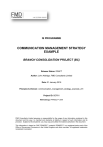 IS PROGRAMME COMMUNICATION MANAGEMENT STRATEGY EXAMPLE BRANCH CONSOLIDATION PROJECT (BC) Release Status: DRAFT Author: John Aldridge, FMD Consultants Limited Date: 01 January 2016 Filename & Version: communication_management_strategy_example_v01 Project ID: BCP01 Methodology: PRINCE2™ 2009 FMD Consultants Limited assumes no responsibility for the usage of any information contained in this document and the way it is handled and disclaims all liability in respect of such information and its provision. Subject to this disclaimer, you may copy and utilise the material contained in the document. This information is based on OGC PRINCE2™ material. PRINCE2™ is a registered trade mark of the Office of Government Commerce in the United Kingdom and other countries. All registered trademarks recognised & accepted. 1 Document History 1.1 Location This document is stored in the following location: communication_management_strategy_example_v01 Filename Location www.fmdconsultants.co.uk\web 1.2 Revision History This document has been through the following revisions: Version No. V01 Revision Date 01/01/2016 Filename/Location stored: XXXXXXXXXX Brief Summary of Changes First draft 1.3 Authorisation This document requires the following approvals: AUTHORISATION Executive Senior User Senior Supplier Name Signature Date XXXXXXX XXXXXXX XXXXXXX 1.4 Distribution This document has been distributed to: Name Title Version Issued Date of Issue XXXXXXXXXX Project Assurance V01 01/01/2016 Project ID:BCP01 Communications Management Strategy Example Doc Ref:XXXXXXXXXX Page 2 of 9 Date of Issue:01/01/2016 1.5 Related Documents Summary of filenames and locations of related documents: Document Type Filename/Location stored: Project Brief XXXXXXXXXX Lessons Log XXXXXXXXXX Risk Register XXXXXXXXXX Project ID:BCP01 Communications Management Strategy Example Doc Ref:XXXXXXXXXX Page 3 of 9 Date of Issue:01/01/2016 2 Contents 1 DOCUMENT HISTORY ................................................................................................ 2 1.1 1.2 1.3 1.4 1.5 LOCATION ......................................................................................................................2 REVISION HISTORY ..........................................................................................................2 AUTHORISATION .............................................................................................................2 DISTRIBUTION.................................................................................................................2 RELATED DOCUMENTS .....................................................................................................3 2 CONTENTS ................................................................................................................ 4 3 INTRODUCTION ........................................................................................................ 5 3.1 3.2 3.3 3.4 3.5 4 PURPOSE .......................................................................................................................5 OBJECTIVES ....................................................................................................................5 SCOPE ...........................................................................................................................5 DERIVATION ...................................................................................................................5 QUALITY CRITERIA ...........................................................................................................5 REPORTING .............................................................................................................. 6 4.1 4.2 4.3 4.4 4.5 4.6 4.7 4.8 4.9 RATIONALISATION PROGRAMME (RP) ................................................................................6 EXECUTIVE PROJECT BOARD (EPB) ....................................................................................6 PROJECT ASSURANCE TEAM (PAT) ....................................................................................7 QUALITY ASSURANCE TEAM (QAT) ....................................................................................7 PROJECT TEAM ...............................................................................................................7 STAFF ............................................................................................................................7 USER/SPECIAL INTEREST GROUPS ......................................................................................8 SUPPLIERS......................................................................................................................8 OTHER STAKEHOLDERS .....................................................................................................8 5 ROLES AND RESPONSIBILITIES ................................................................................... 8 6 STAKEHOLDER ANALYSIS........................................................................................... 9 Project ID:BCP01 Communications Management Strategy Example Doc Ref:XXXXXXXXXX Page 4 of 9 Date of Issue:01/01/2016 3 Introduction 3.1 Purpose A Communication Management Strategy contains a description of the means and frequency of communication to parties both internal and external to the project. It facilitates engagement with stakeholders through the establishment of a controlled and bi-directional flow of information. 3.2 Objectives The objective of this Communication Management Strategy is to provide an agreed and clearly understood method of communication throughout the project which gives consistency of communications where practical across all interested parties. 3.3 Scope The scope is restricted to all aspects of the Branch Consolidation Project which are encompassed in the Business Case, and communications to all approved interested parties. The scope excludes communications within the Rationalisat