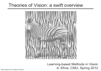 Theories of Vision: a swift overview Most slides from Steve Palmer Learning-based Methods in Vision A. Efros, CMU, Spring 2012 What is a Theory? Theory An integrated set of related hypotheses about underlying mechanisms or principles that organize, explain, and predict facts about the phenomena of a given domain. © Stephen E. Palmer, 2002 What is a Theory? Three important functions of a theory: Integrate “old” facts Predict “new” facts Lead to “understanding” Three criteria for evaluating a theory: Logical consistency Empirical adequacy Parsimony (“Occam’s razor”) © Stephen E. Palmer, 2002 Categorization of Theories of Vision “Why do things looks as they do?” -- Kurt Koffka (1935) Nativism vs. Empiricism • “Because we were born (evolved) to see them that way” vs. • “Because we have learned to see them that way” Atomisn vs. Holism • “because of the way each pixel appears” vs. • “because of the way the entire scene appears” Organism vs. Environment • “Because we are the way we are” vs. • “Because the world is the way it is” Structuralism THEORY NATIVISM vs. EMPIRICISM ATOMISM vs. HOLISM ORGANISM vs. ENVIRONMENT PRINCIPAL ANALOGY METHOD Structuralism Gestaltism Ecological Optics Constructivism © Stephen E. Palmer, 2002 Structuralism Structuralism: Perception results from the association of basic sensory atoms in memory via repeated, prior joint occurrences. Derived from philosophy of British Empiricists (e.g., Locke, Berkeley, Hume, and Mills). Proposed by Wilhelm Wundt, the father of modern Psychology. © Stephen E. Palmer, 2002 Structuralism Sensory Atoms Redness at (x1,y1) Yellowness at (x2,y2) Greenness at (x3,y3) Retinal mosaic © Stephen E. Palmer, 2002 Structuralism Perceptual Complexes Retinal mosaic © Stephen E. Palmer, 2002 Structuralism Perceptual Complexes Red apple at (x0,y0) Retinal mosaic © Stephen E. Palmer, 2002 Structuralism Perceptual Complexes Red apple at (x0,y0) Association Retinal mosaic © Stephen E. Palmer, 2002 Structuralism Chemical Analogy Perceptions are made of basic sensory experiences just as molecules are made of basic atoms. © Stephen E. Palmer, 2002 Structuralism THEORY NATIVISM vs. EMPIRICISM ATOMISM vs. HOLISM ORGANISM vs. ENVIRONMENT PRINCIPAL ANALOGY METHOD Structuralism Empiricism Atomism Organism Chemistry Trained Introspection Gestaltism Ecological Optics Constructivism © Stephen E. Palmer, 2002 Gestaltism Gestaltism: Perception results from the interaction between the intrinsic structure of the stimulus and the intrinsic structure of the brain. Max Wertheimer Wolfgang Köhler Kurt Koffka © Stephen E. Palmer, 2002 Gestaltism The Gestalt movement in perceptual theory was primarily a reaction against Structuralism: Rejected atomism Rejected empiricism Rejected associationism Successful in arguing against Structuralism, but less successful in promoting its own theoretical agenda. © Stephen E. Palmer, 2002 Gestaltism Principles of Gestalt Theory Holism: The whole is different from the sum of its parts. Prägnanz: The percept will be as “good” as the prevailing conditions allow, I.e. simplest explanation Nativism: Not a total rejection of learning, but rejection of Its primacy. Gestaltism Prägnanz: the percept will be as “good” as the prevailing conditions allow What is this? ? square & circle? ? square & pacman? etc…. ? squigit & pacman? © Stephen E. Palmer, 2002 Gestaltism Holism: The whole is different from the sum of its parts. Emergent properties: Features of a configuration that are not features of its components, e.g.: • length • orientation • curvature • closure • connectedness © Stephen E. Palmer, 2002 The Problem of Organization The problem of grouping: “I stand at the window and see a house, trees, sky.” Theoretically, I might say that there were 327 brightnesses and nuances of color. Do I have “327”? No. I have sky, house, and trees. (Wertheimer, 1923) © Stephen E. Palmer, 2002 Perceptual Grouping Wertheimer’s “laws” of grouping Rows Columns © Stephen E. Palmer, 2002 Perceptual Grouping 14.20 Proximity Rows Columns © Stephen E. Palmer, 2002 14.21 Perceptual Grouping Color Similarity Rows Columns © Stephen E. Palmer, 2002 14.22 Perceptual Grouping Size Similarity Rows Columns © Stephen E. Palmer, 2002 14.23 Perceptual Grouping Orientation Similarity Rows Columns © Stephen E. Palmer, 2002 14.24 Perceptual Grouping Similarity of texture Rows Columns © Stephen E. Palmer, 2002 14.26 Perceptual Grouping Common Fate Columns © Stephen E. Palmer, 2002 14.27 Perceptual Grouping Good Continuation Rows Columns © Stephen E. Palmer, 2002 14.28 Perceptual Grouping Closure Rows Columns © Stephen E. Palmer, 2002 14.29 Perceptual Grouping Common Region Rows Columns © Stephen E. Palmer, 2002 14.30 Perceptual Grouping Element Connectedness Rows Columns © Stephen E. Palmer, 2002 Perceptual Grouping 14.32 Past Experience © Stephen E. Palmer, 2002 Gestaltism Field Theoretic Analogy Field of a single positive charge Field of a pair of positive charges Field of a positive & a negative charge Repulsion Attraction © Stephen E. Palmer, 2002 Gestaltism THEORY NATIVISM vs. EMPIRICISM ATOMISM vs. HOLISM Structuralism Empiricism Atomism Gestaltism Nativism Holism ORGANISM vs. ENVIRONMENT PRINCIPAL ANALOGY METHOD Organism Chemistry Trained Introspection Organism EM Fields Naive Introspection Ecological Optics Constructivism © Stephen E. Palmer, 2002 Ecological Optics Ecological Optics: Perception is the direct apprehension of the visible environment by extracting invariants in the dynamic ambient optic array and the affordances of objects. James J. Gibson: Ask not what’s inside your head, but what your head’s inside of! (Ecological optics is a theory of stimulus structure.) © Stephen E. Palmer, 2002 Ecological Optics Direct Perception: Perception is not mediated by processes like unconscious thinking Perception of the 3-D world is NOT ambiguous for an a
