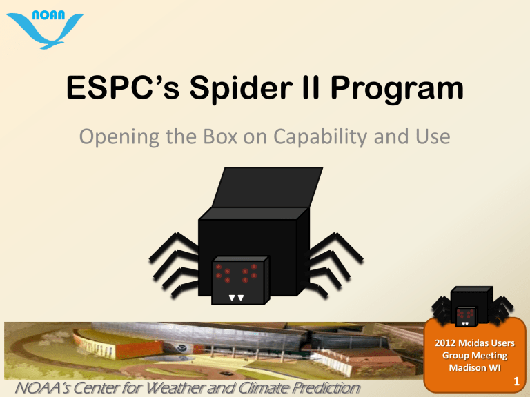 NOAA ESPC’s Spider II Program Opening the Box on Capability and Use 2012 Mcidas Users Group Meeting Madison WI NOAA’s Center for Weather and Climate Prediction 1 NOAA What is SPider? • Satellite Product Information Distribution EnviRonment • Expands on concepts of Core Mcidas commands concepts – ADDE, DATALOC, DSSERVE, PT/GRD/IMGLIST, PT/GRD/IMGDISP, PT/GRD/IMGCOPY, SKL, etc. • Consists of two programs: Spider Server (SPS) and Spider Client (SPC) 2012 Mcidas Users Group Meeting Madison WI NOAA’s Center for Weather and Climate Prediction 2 NOAA Pros and Cons • Benefits: – Automatic loading without duplication of images – Reduces task loading of server/workstations • Numerous pings to server but fewer downloads – Run from command line environment (typically SKL) on all platforms • Leads to distribution system effectiveness – Timely, based on user needed requirements (set to any refresh rate) • Weaknesses: – “Addictive” Nature • Become too reliant on the program working • Leads to lack of CORE Mcidas knowledge for users – Produces text output into active text window; can be annoying – Doesn’t work as well with full swath polar images 2012 Mcidas Users Group Meeting Madison WI NOAA’s Center for Weather and Climate Prediction 3 NOAA • User Two Types of SPider Spider Client (SPC) – Resides on Workstation – Keeps Request File of user defined loop(s) specifications and polls it against the Server Availability File – Pulls “area” files from server and loads it into predetermined frame SPC Spider Server (SPS) • Host – Resides on Server – Integrated into “Area generator” that creates products on the server – Keeps and up to date Availability List of these products SPS 2012 Mcidas Users Group Meeting Madison WI NOAA’s Center for Weather and Climate Prediction 4 NOAA SPC CYcle “Handshake” w/SPS Spider Server Database: Dataset Do you have anything NEW for me? Yes! Here are your Requested files. GER/GENHEM GER/GECONS GER/GESHEM GWR/GWPACU MTS/MTGLOB MTS/VOLASH Last Image 18:15Z 18:32Z 18:22Z 18:15Z 18:32Z 18:32Z SPS SPC GER/GECONS 37N 100W last= 18:15z MTS/VOLASH 16.5N 145E Last= 17:32z 2012 Mcidas Users Group Meeting Madison WI NOAA’s Center for Weather and Climate Prediction 5 NOAA SPS Commands • Install - Initializes server’s database & creates Availability File • Create - Provides the initial parameters of hosted dataset(s) on a server • Set - Updates the parameters when needed of dataset(s) • Invoke - Compares and updates corresponding information in the Availability File when there is a match. Typically, command is embedded at the end of a product generation script to notify Availability File of the new image/file. • List - Provides list of each instance in Availability File • Suspend - Changes status of entry to suspend • Release - Changes status of entry to active 2012 Mcidas Users Group Meeting Madison WI NOAA’s Center for Weather and Climate Prediction 6 NOAA SPS Create/Set Provides the initial (create) or changes to (set) parameters of hosted dataset(s) on a particular server • • • • • • • • • • • • RANGE - Beginning and ending file range MACH - Machine name GROUP - Name of the ADDE group (for organization purposes, part of the dataset name) NAME - ADDE name or descriptor (other portion of dataset name) SOURCE - Name of the satellite or data/product origin SATE - Set to same as SOURCE (for backward campatibility) RES - Image Resolution SCAN - Amount of Scan lines for the particular AREA file EOF - End of File Flag for an AREA file STATUS - State of the loop; Active or Suspended FNAME - File name of TEXT type document FPATH - Path for the files in the dataset 2012 Mcidas Users Group Meeting Madison WI NOAA’s Center for Weather and Climate Prediction 7 NOAA SPS LIST Example – “Availability File” ***** Server Records Listing: Record 1 -- 120 *********************** -----------------------------------------------------------------------------------------------------------# STA BAREA EAREA CAREA DATE TIME SCAN EOF RES SRC GRP ADDE -----------------------------------------------------------------------------------------------------------4 A 5000 5049 5006 2012121 123000 100 0 0 RDA DPD 1KMBREF 11 A 100 123 110 2012101 142000 100 0 1 DPD GA-SDPI-CTPX 12 A 200 223 210 2012101 142000 100 0 1 DPD GA-SDPI-LIX 13 A 300 323 310 2012101 142000 100 0 1 DPD GA-SDPI-PWX 14 A 400 423 410 2012101 142000 100 0 1 DPD GA-SDPI-SKX 15 A 150 173 158 2012101 144600 100 0 1 DPD GE-SDPI-CTPX 16 A 250 273 258 2012101 144600 100 0 1 DPD GE-SDPI-LIX 17 A 350 373 369 2012101 144600 100 0 1 DPD GE-SDPI-PWX 18 A 450 473 459 2012101 144600 100 0 1 DPD GE-SDPI-SKX 19 A 500 523 522 2012101 140100 100 0 1 DPD GW-SDPI-CTPX 20 A 600 623 620 2012101 140100 100 0 1 DPD GW-SDPI-LIX 21 A 700 723 704 2012101 140100 100 0 1 DPD GW-SDPI-PWX 22 A 800 823 806 2012101 140100 100 0 1 DPD GW-SDPI-SKX 23 A 550 573 569 2012101 142400 100 0 1 DPD GP-SDPI-CTPX 24 A 650 673 654 2012101 142400 100 0 1 DPD GP-SDPI-LIX 25 A 750 773 754 2012101 142400 100 0 1 DPD GP-SDPI-PWX 26 A 850 873 854 2012101 142400 100 0 1 DPD GP-SDPI-SKX 27 A 9100 9123 9109 2012101 140000 100 0 1 DPD SDPI-PWX 28 A 9200 9223 9216 2012101 140000 100 0 1 DPD SDPI-LIX 29 A 9300 9323 9320 2012101 140000 100 0 1 DPD SDPI-SKX 30 A 9400 9423 9415 2012101 140000 100 0 1 DPD SDPI-CTPX Variables Listed STA: Status BAREA & EAREA: Begin/End Areas on Server CAREA: Current Area to be created DATE & TIME: a bit obvious SCAN: # of lines on image EOF: End of File Flag RES: Resolution ‘0’ denotes Magnification GRP & ADDE: Dataset entry names called by SPC Cycle request 2012 Mcidas Users Group Meeting Madison WI NOAA’s Center for Weather and Climate Prediction 8 NOAA SPC Commands One instance or less useful ones • • • • Install/Uninstall – Initializes/Removes client’s database Data – Provides an image listing for the particular loop on the server D