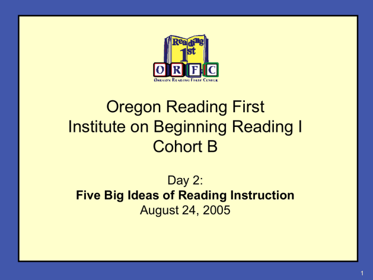 Oregon Reading First Institute on Beginning Reading I Cohort B Day 2: Five Big Ideas of Reading Instruction August 24, 2005 1 Oregon Reading First Institutes on Beginning Reading Content developed by: Edward J. Kame’enui, Ph. D. Deborah C. Simmons, Ph. D. Professor, College of Education Professor, College of Education University of Oregon University of Oregon Michael D. Coyne, Ph. D. University of Connecticut Beth Harn, Ph. D University of Oregon Prepared by: Patrick Kennedy-Paine University of Oregon Katie Tate University of Oregon 2 Cohort B, IBR 1, Day 2 Content Development Content developed by: Tricia Travers Amanda Sanford Jeanie Mercier Smith Carol Dissen Additional support: Deni Basaraba Julia Kepler Katie Tate 3 Copyright • All materials are copy written and should not be reproduced or used without expressed permission of Dr. Carrie Thomas Beck, Oregon Reading First Center. Selected slides were reproduced from other sources and original references cited. 4 Open Court: Phonological Awareness 5 Advantages of Implementing a Core Program Increasing communication and learning • Improving communication – Teachers within and across grades using common language and objectives • Improving learning – Provides students a consistent method or approach to reading which is helpful for all students – Provides teachers an instructional sequence of skill presentation and strategies to maximize student learning – Provides more opportunity to differentiate instruction when necessary 6 Essential Instructional Content 1. Phonological Awareness: The ability to hear and manipulate sounds in words. 2. Alphabetic Principle: The ability to associate sounds with letters and use these sounds to read words. 3. Automaticity and Fluency with the Code: The effortless, automatic ability to read words in connected text. 4. Vocabulary Development: The ability to understand (receptive) and use (expressive) words to acquire and convey meaning. 5. Comprehension: The complex cognitive process involving the intentional interaction between reader and text to extract meaning. 7 Changing Emphasis of Big Ideas K 1 2 3 Phonological Awareness Alphabetic Principle Letter Sounds & Combinations Multisyllables Automaticity and Fluency with the Code Vocabulary Comprehension Listening Reading Listening Reading 8 Design and Delivery Features of well-designed programs include: – Explicitness of instruction for teacher and student – – – – • Making it obvious for the student Systematic & supportive instruction • Building and developing skills Opportunities for practice • Modeling and practicing the skill Cumulative review • Revisiting and practicing skills to increase strength Integration of Big Ideas • Linking essential skills 9 Phonological Awareness 10 Objectives • To define phonological awareness • To become familiar with the research behind phonological awareness • To identify high priority skills of phonological awareness • To review the scope and sequence of phonological awareness instruction in Open Court. • To identify and implement phonological components within daily Open Court lessons. 11 Phonological Awareness The ability to hear and manipulate sounds in words. 12 Critical Elements in Phonological Awareness • The National Reading Panel report (2000) identifies the following elements as essential in Phonological Awareness instruction: A critical component but not a complete reading program Focus on 1 or 2 types of PA Teach in small groups Teach explicitly & systematically Teach to manipulate sounds with letters 13 Definitions • • • • • • • • • Continuous sounds Stop sounds Onset-rime Phoneme Phoneme Blending Phoneme Segmentation Phonemic Awareness Phonics Phonological Awareness 14 Activity • Please take out your Phonological Awareness Definitions activity sheet • Partner up! • Read the examples and definitions. Find the idea that matches the definition or example from the word bank. Write it in the box next to the definition or example. • Use your definitions sheet to help you if you get stuck 15 Word A. A. Stop sound B. B. Onset-Rime C. C. Phonics D. D. Phoneme E. E. Phoneme segmentation F. F. Continuous sound G. G. Phonological awareness H. H. Phonemic awareness I. I. Phoneme blending Definition or Example A. /t/ /t/ A. B. /r/-/ipple/ B. /r/-/ipple/ C. mapping sounds to print C. mapping sounds to print D. The smallest unit of sound D. The smallest unit of sound E. taking a word apart into all of its E. taking a word apart into all of it’s sounds sounds F. /mmm/ F. /mmm/ G. The understanding that words are composed of sounds, and ability G. The understanding thatthe words areto hear and manipulate those sounds composed of sounds, and the ability hear and manipulate those sounds H. to The awareness of the individual sounds comprise words H. The that awareness of the individual soundssounds that comprise I. putting togetherwords to make a word I. putting sounds together to make a word 16 Phonemic Awareness: Research The best predictor of reading difficulty in kindergarten or first grade is the inability to segment words and syllables into constituent sound units (phonemic awareness). Lyon 1995 Poor phonemic awareness at four to six years of age is predictive of reading difficulties throughout the elementary years. Torgesen and Burgess 1998 More advanced forms of phonemic awareness (such as the ability to segment words into component sounds) are more predictive of reading ability than simpler forms (such as being able to detect rhymes). Nation and Hulme 1997 17 High Priority Skills for Kindergarten • Students should be taught to orally blend separate phonemes starting in mid-kindergarten. • Students should be taught to identify the first sound in one-syllable words by the middle of kindergarten at a rate of 25 sounds per minute. • Students should segment individual sounds in words at the rate of 35 sounds per minute by the end of kindergarten. 