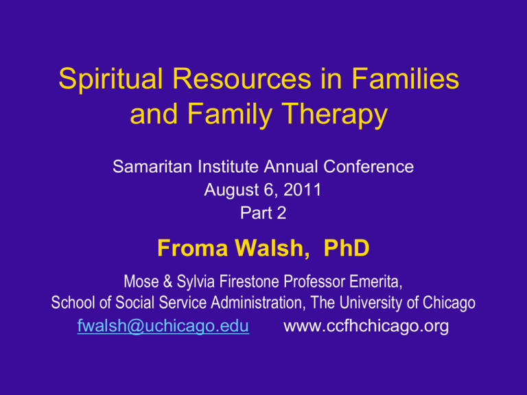Spiritual Resources in Families and Family Therapy Samaritan Institute Annual Conference August 6, 2011 Part 2 Froma Walsh, PhD Mose & Sylvia Firestone Professor Emerita, School of Social Service Administration, The University of Chicago fwalsh@uchicago.edu www.ccfhchicago.org Spiritual Resources In Suffering, Healing, and Resilience Resilience: Overcoming Adversity Ability to rebound from life crises and disruptive life challenges, strengthened and more resourceful Rugged Individual Invulnerable Self-Reliant Relational Resilience Lifelines of Connection H u m a n – A n i m a l B o n d s Guardian Angel Perhaps they are not stars in the sky But rather openings Where our loved ones shine down To let us know they are happy And to light our way …..Native American Strengthening Family Resilience: Relational Lifelines ~~~~~~~ Facilitate coping, adaptation, healing, and positive growth Through family, community, cultural, and spiritual connections Facilitating Resilience Identify, build resources that help clients to: – Recover from Crisis, Trauma, Loss – Cope with Multiple, Persistent Stresses • e.g. chronic illness, poverty conditions – Navigate Disruptive Life Transitions • e.g. job loss, separation, divorce, migration – Overcome Barriers to Thrive • e.g. At-risk, vulnerable youth KEYS TO FAMILY RESILIENCE Belief Systems 1. Making Meaning of Crisis & Challenge 2. Positive Outlook: Hope 3. Transcendence & Spirituality Organizational Resources 4. Flexibility / Stability 5. Connectedness; Leadership 6. Kin, Social, & Economic Resources Communication Processes 7. Clear, consistent messages 8. Emotional Sharing; Humor / respite 9. Collaborative Problem-solving / Proaction Belief Systems The Heart and Soul of Resilience Rooted in family history, culture, religion Influence our world view, response to adversity 1. Meaning Making 2. Positive Outlook: Hope; Mastery 3. Transcendence -- Transformation Seeing is believing Western Scientific perspective We must believe in something To be able to see it Native American perspective We do not see things as they are -We see them as we are. The Talmud 1. Meaning Making • Relational View of Resilience • Connection, "Lifelines" vs. “rugged individual” • Contextualize, Humanize, Depathologize Distress • Gain Sense of Coherence: – View challenges as: • Meaningful, Comprehensible, Manageable • Facilitative Appraisal of Situation; Options – Explanatory, causal; Why me / Us? – Future expectations / catastrophic fears/ Agency 2. Positive Outlook • Instill Hope – “Oxygen for the Spirit” • Encouragement; Build Confidence: "Can Do" Spirit • Focus on Strengths, Abilities; Potential • Active Initiative & Perseverance • Master the Art of the Possible -Accept what can't be changed Tolerate uncertainty Master the Art of the Possible: Do all you can With what you have In the time you have In the place you are Serenity Prayer in Addictions Recovery God grant me the serenity to accept the things I cannot change The courage to change what I can And the wisdom to know the difference Reinhold Niebuhr 3. Transcendence • Larger Values, Purpose • Spirituality: Faith, Practices, Rituals, Community • Inspiration / aspirations: – Envision new possibilities; Life dreams – Creative expression • Transformation: Learning, Change, & Growth – Appreciate life, loved ones; deepen / repair bonds – Reassess, redirect life priorities – Service, Social activism to benefit others / all One by one, day by day, Move on from setbacks; Refuse to give up; Go confidently towards your dreams. Buddhist saying Let Nothing Dim the Light that Shines from Within --Maya Angelou Every blade of grass has its Angel that bends over it and whispers 'Grow, grow' -- The Talmud Do all the good you can By all the means you can In all ways you can In all places you can To all the people you can As long as ever you can. -- John Wesley, founder of Methodists Our country demonstrated that there are ways other than violence to deal with difference and conflict: the way of forgiveness, the way of reconciliation. Archbishop Desmond Tutu, Nobel Prize Winner Resilience of the human spirit: The capacity to bring out the best In the worst of times In strengthening resilience, We strive to integrate the experience of crisis and adversity -- and our resilient response – Into the fabric of our individual and collective identity, Influencing how we go on to live our lives. Part 3. Traumatic Loss, Recovery, & Resilience www.wttw.com/shop/justice Jay Shefsky Producer Family Resilience Meta-Framework for Practice • Shift Focus from Family Deficits, Limitations to Strengths, Resources, Potential • Developmental, Systemic Perspective •Bio-Psycho-Social-Spiritual Influences •Family Challenged by Adversity -- timeline: events •Family Response: Facilitates Adaptation of all Members, Relationships • Relational View of Human Resilience • Use genogram: identify kin, social, community, & spiritual resources • Recruit models, mentors for at-risk youth • Build life-lines, teams, networks Family Resilience Meta-Framework for Practice (2) • Stresses impact family; Family coping influences adaptation of all members, relationships, and family unit • Contextual View of Distress, Wellbeing, & Adaptation: Larger systems: workplace, healthcare, schools; social structures, access to resources all important • Varied Challenges and Pathways in Resilience: • No single model fits all families, resources & challenges • Prevention: By strengthening resilience, families and children become more resourceful to meet future challenges. Facilitating Family Resilience: Practice Guidelines • Core Conviction in Strengths, Potential of all Youth & Families, alongside Vulnerabilities, Limitations • Language, Framing to Depathologize, Humanize • Contextualize Distress; Decrease Shame, Blame • Compassion for Suffering, Struggle, Disappointments, Losses • Focus on 
