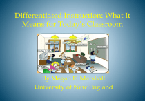 Differentiated Instruction: What It Means for Today’s Classroom By Megan E. Marshall University of New England Definition • Differentiated instruction is an approach to teaching and learning that gives students multiple options for taking in information and making sense of ideas (Hall, Strangman, and Meyer, 2003) • Differentiated instruction “provides different avenues to acquiring content, to processing or making sense of ideas, and to developing products so each student can learn effectively” (Tomlinson, 2001, p. 1) • Carol Ann Tomlinson discusses the rationale behind differentiation: http://www.youtube.com/watch?v=lqCjzNA57V4&feature=related Basically, “In a differentiated classroom, the teacher proactively plans and carries out varied approaches to content, process and product in anticipation of and response to student differences in readiness, interest, and learning needs.” (Tomlinson, 2001, p. 7) Classroom Elements to Differentiate • Content – the same content can be taught to all students, but the complexity should vary according to the student’s needs • Process or Sense-Making – the activities the students engage in to learn the content should be varied through interest, intelligence, grouping, graphic organizers, independent studies, role-playing, and much more • Product – the unit ‘exam’ should be varied so each student can demonstrate their learning in a unique way • Learning Environment – the way the classroom looks and feels should contain areas for quiet learning, partnered/group learning, varied materials, cultural centers, etc., and reflect safety and positivity (Hall, Strangman, and Meyer, 2003; Tomlinson, 2001) • Teaching through Readiness – the task is intended to extend a student’s knowledge, understanding and skills just beyond their current ability • Teaching through Interest – providing tasks and topics that are genuinely interesting to the student or piques his/her curiosity • Teaching through Learning Needs/Profiles – creating tasks based on the mode of learning that best suits the student (Tomlinson, 2001) Theories Behind the Differentiation Movement • Howard Gardner’s Theory on Multiple Intelligences http://www.infed.org/thinkers/gardner.htm • Anthony Gregorc’s Thinking Styles http://web.cortland.edu/andersmd/learning/Gregorc.htm • David A. Kolb’s Learning Style Model http://www.infed.org/biblio/b-explrn.htm • Dunn and Dunn’s Learning Style Model http://0- search.ebscohost.com.lilac.une.edu/login.aspx?direct=true&db=eric &AN=EJ385281&site=ehost-live • Lev Vygotsky’s Zone of Proximal Development http://www.simplypsychology.org/Zone-of-ProximalDevelopment.html Teach within the Zone of Proximal Development (ZPD) • The ZPD is “the distance between the actual developmental level as determined by independent problem solving, and the level of potential development as determined through problem solving under adult guidance, or in collaboration with more capable peers" (McLeod, 2010). • In other words, do not frustrate the student with something too hard, do not bore the student with something too easy, but be sure they are challenged enough to embrace the task with some assistance. Howard Gardner’s Theory of Multiple Intelligences: 8 Ways of Being Smart – It is not how smart you are, but how you are smart. A Brief Definition of the Eight Intelligences • Linguistic intelligence - "word smart" • Logical-mathematical intelligence “number/reasoning smart" • Visual-Spatial intelligence - "picture smart" • Bodily-Kinesthetic intelligence - "body smart" • Musical intelligence - "music smart" • Interpersonal intelligence - "people smart" • Intrapersonal intelligence - "self smart" • Naturalist intelligence - "nature smart“ (Armstrong, 2010) How do you learn best? Click on the picture to take an intelligence test! How Do You Begin to Differentiate? • The most important part of differentiation is assessing the students. You must understand their interests, habits, learning styles, and personalities in order to create tasks appropriate for each individual student. • ASSESS, ASSESS, ASSESS!! • “The primary purpose of assessment is for the teacher to analyze student progress for the purpose of modifying and refining the teaching/learning cycle to better meet student needs“ (DiGesu, 2011). Pre-assessment or Diagnostic Assessment • Pre-assessment allows the teacher to figure out what a student knows about an upcoming topic or skill. Once the teacher gathers this knowledge he/she can address the student’s strengths and needs throughout a unit. (Chapman and King, 2005, p. 64) Strong pre-assessments reveal the following: • Knowledge base and background experience • Interests and talents • Attitudes, likes and dislikes • Feelings and emotions • Entry point for new information (Chapman and King, 2005, p. 65) Strategies for Pre-assessment • Observation –observe the students and take detailed notes • Varied Response Cards – the student can rate their knowledge through number scales, verbal scales, or facial expression scales • Questionnaires and Surveys – the students answer questions based on the upcoming topic • Pretests – formal tests for assessment • Details and other information: http://daretodifferentiate.wikispaces.com/file/view/Preassessment+Techniques+Chart.pdf • Excellent PowerPoint detailing pre-assessment strategies: http://daretodifferentiate.wikispaces.com/file/view/diff+preassess.ppt (Chapman and King, 2005; Preassessment, 2011) Continuous Assessment, Formative Assessment, or Assessing During Learning • “Continually assess students’ readiness to identify the next steps in a procedure, to move to the next level, or to approach new skills or concepts” (Chapman and King, 2005, p. 64). • “He who would learn to fly one day must first learn to stand and walk and run and climb and dance; one cannot fly into flying.” (Friedric