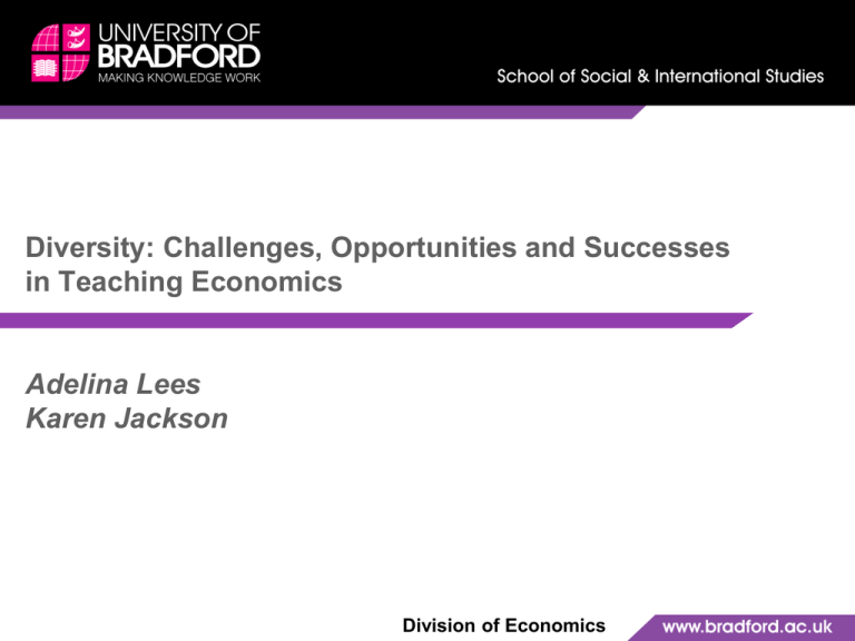 Diversity: Challenges, Opportunities and Successes in Teaching Economics Adelina Lees Karen Jackson Division of Economics Introduction and Aims Economics teaching has a history of ‘chalk and talk’ out-lasting many other disciplines The ‘maths issue’ is also well documented alongside the general perception that an economics degree is ‘difficult’ The education literature contains a vast number of studies regarding student performance However there are very few published studies that specifically analyse the performance of economics students in UK Higher Education Division of Economics Introduction and Aims Economics teaching at the University of Bradford provides an ideal case study given the diverse student body, in terms of the UK widening participation agenda as well as attractiveness for students coming to study from outside the UK. Despite attempts to tailor provision for a diverse study body there continues to exist differences in performance This study aims to provide a number of key conclusions that may prove helpful for economics departments/divisions with a more homogenous cohort but where they seek to support students from diverse backgrounds. Division of Economics Context Sample size of 134 includes country of birth in the following proportions (with 37 countries of birth in the sample): - 25%: England - 23%: China - 10%: Nigeria - 9%: Lithuania 4 cohorts beginning their studies between 2005-2008 Gender breakdown: M: 70% F: 30% Students who begin each academic year with exactly 120 credits Division of Economics Student Views What are the main barriers to your learning? • Language • Culture and social integration What are the main factors that have assisted your learning? • Helpful and high quality staff • VLE • Social environment What was most helpful when you first arrived? • Induction • Personal Tutor • Study Skills Module What could have been done to improve your learning? • Social integration across year groups • More interactive teaching What are the positive aspects of diversity in the student body? • Observing different learning techniques across diverse study body What are the negative aspects of diversity in the student body? • Language • Dealing with diversity within group assessment Division of Economics Literature Review attendance socio economic background motivation class size ethnicity educational and cultural background peer effects pre entry qualification s learning support Determinants of Performance assessment s and feedback physical environment first year experience curriculum design diabilities age language skills and communicati on skills gender Division of Economics Brief survey of literature: factors which determine learning and performance • • • • • • • • • • • • • • • Student effort and study time does not always improve performance (Siegfried and Fels 1979) Mathematics was the key school subject which influenced learning: (Attiyeh and Lumsden 1972) Gender differences: (Siegfried 1979) Physical environment: (Reid 1983) Excessive absenteeism: (Romer 1993) Cultural and institutional Settings: Tay 1994) Pre university qualifications Durden and Ellis (1995) Personality temperaments: (Zeigert 2000) Attendance and excessive absenteeism (Durden and Ellis 2000) Social class and family background (Smith and Naylor 2001 Curriculum design of assessments (Krieg and Uyar 2001) Class size: (Becker and Powers (2001) Ethnicity and Race: (Marburger 2001) Race and Gender: (Borg and Stranaham 2002) Age and ethnicity and geographic background: (Barrow, Reilly and Woodfield (2009) Literature Review UK studies typically use USR and HESA data Few studies utilise institutional data Very limited number of published studies focusing on studying economics 1984-98 Naylor and smith (2005) Economics students studying in the UK (USR and HESA) Gender bias in favour of women getting a 'good degree'; + Previous maths study; + Prior qualifications; + Parental occupation and education; -Independent schooling; Black/white ethnic origin Division of Economics Empirical Analysis Dependant variable: average mark in stage 2 Coef. start2 -0.82 start3 0.96 start4 3.00 gender 3.70 country2 -5.89 country3 -4.93 country4 6.91 age2 3.75 age3 0.90 maths 0.00 _cons 53.07 R-squared = 0.1879 Adj R-squared = 0.1219 Std. Err. 2.73 2.38 2.29 1.82 2.82 2.47 3.19 2.04 2.92 0.00 2.42 t -0.30 0.40 1.31 2.04 -2.09 -2.00 2.17 1.83 0.31 -0.91 21.93 P>|t| 0.77 0.69 0.19 0.04 0.04 0.05 0.03 0.07 0.76 0.37 0.00 [95% Conf. -6.21 -3.74 -1.53 0.11 -11.46 -9.83 0.59 -0.30 -4.88 -0.01 48.28 Interval] 4.58 5.66 7.54 7.30 -0.31 -0.04 13.23 7.79 6.67 0.01 57.86 Division of Economics Note: 1. No issues regarding hetroscedascity 2. A significant number of students born in Nigeria have attended UK schools/colleges Country 1: UK (base) Country 2: Nigeria Country 3: China Country 4: Lithuania Country 5: omitted Age1: 17/18/19 (base) Age2: 20/21/22 Age3: 22+ Gender: M=0 F=1 Empirical Analysis Superior results when dependant variable is stage 2 average mark, rather than stage 1/3, or weighed average of stage averages Use of dependant variable is sensible given settling in effect in stage 1 and stage 3 students do not have core modules across degree paths Women perform significantly better than men Students born in China or Nigeria perform less well than students born in the UK Students born in Lithuania perform better that students born in the UK Students aged 20-22 perform better than those aged 17-19 Robust results when re-basing the data Division of Economics Empirical Analysis Difference of average stage 3-2 results Over-performing: cohort 4 vs.cohort 1 (**catching-up**) Falling behind: China vs. UK Division of Economics Empirical Analysis Difference of average stage 2-1 results Over-performing: cohort 3 & 4 vs. cohort 1 (**catching-up**) women vs. men Lithuanian vs. UK aged 20-22 vs.17-19 Falling behind: Nigeria vs. UK Division of Economics Key Findings We ha