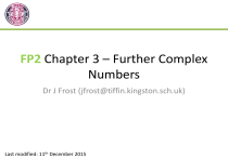 FP2 Chapter 3 – Further Complex Numbers Dr J Frost (jfrost@tiffin.kingston.sch.uk) Last modified: 11th December 2015 OVERVIEW This chapter is divided up into two main sections. You are pretty much guaranteed one exam question on each of the two halves: 1 Different forms of a complex number: • Cartesian π§ = π₯ + ππ¦ • Modulus-Argument Form π§ = π cos π + π sin π and • NEW! Exponential form π§ = ππ ππ Multiplying, dividing and raising to a power of complex numbers (the last using De Moivre’s Theorem) Uses of De Moivre’s Theorem (trig identities, roots) Loci with Complex Numbers e.g. “Draw π§ − 2π = 9 on an Argand diagram.” 2 2 -1 RECAP :: Modulus-Argument Form Im[z] (π₯, π¦) If π = π + ππ (and suppose in this case π§ is in the first quadrant), what was: π Re[z] modulus ? argument ? Then In terms of π and π: π = π ππ¨π¬?π½ π = π π¬π’π§?π½ π = π ππ¨π¬ π½ +? π π¬π’π§ π½ π= π§ = ππ +? ππ π = arg π§ = π ? π πππ§−π When −π < π < π it is known as the principal? argument. This is known as the modulus-argument form of π§. ? RECAP :: Modulus-Argument Form π + ππ −1 π π 1 ? 1 1+π ?2 − 3+π 2 1−π 3 2 ? −1 − π ?2 ? ? π½ Mod-arg form π π§ = cos π? + π sin π ? π π π π§ = cos ? + π sin ? 2 2 2 π π π π§ = 2 cos? + π sin ? 4 4 4 5π 5π 5π ? π§ = 2 cos ? + π sin 6 6 6 π π π −? π§ = 2 cos − ? + π sin − 3 3 3 3π 3π 3π π§ = 2 cos − ? + π sin − −? 4 4 4 Exponential Form We’ve seen the Cartesian form a complex number π§ = π₯ + π¦π and the modulus-argument form π§ = π(cos π + π sin π). But wait, there’s a third form! In the later chapter on Taylor expansions, you’ll see that you that you can write functions as an infinitely long polynomial: cos π₯ = 1 π₯2 − 2! π₯4 + 4! π₯6 − 6! +β― π₯3 π₯5 sin π₯ = π₯ − + −β― 3! 5! π₯2 π₯3 π₯4 π₯5 π₯6 π₯ π = 1+π₯+ + + + + + 2! 3! 4! 5! 6! It looks like the cos π₯ and sin π₯ somehow add to give π π₯ . The one problem is that the signs don’t quite match up. But π changes sign as we raise it to higher powers. ππ 2 ππ 3 ππ 4 π = 1 + ππ + + + +β― 2! 3! 4! π 2 ππ 3 π 4 = 1 + ππ − − + +β― 2! 3! 4! π2 π4 π6 π3 π5 = 1− + − +β― +π π− + −β― 2! 4! 6! 3! 5! = cos π + π sin π ? iπ ? ? Holy smokes Batman! ? Exponential Form ! Exponential form π§ = ππ ππ You need to be able to convert to and from exponential form. π + ππ −1 Mod-arg form π§ = cos π?+ π sin π ? π§ =? π ππ ? −0.98π π§ = 13π 2 − 3π −1 + π Exp Form π π 2 cos + π sin 10 10 3π 3π 2 cos ?+ π sin 4 4 3π 3π 2 cos ? + π sin 5 5 π§= ππ 2π 10 ? π§= 3ππ 2π 4 π§= 23ππ 2π 5 πππ + π = π This is Euler’s identity. It relates the five most fundamental constants in maths! To get Cartesian form, put in modulusargument form first. Notice this is not a principal argument. A Final Example 1 2 Use π ππ = cos π + π sin π to show that cos π = (π ππ + π −ππ ) π ππ = cos π + π sin π π −ππ = cos −π + π sin −π = cos π − π sin π ? ∴ π ππ + π −ππ = 2 cos π 1 ∴ cos π = (π ππ + π −ππ ) 2 Exercise 3A Multiplying and Dividing Complex Numbers FP1 recap: If π§1 = π1 cos π1 + π sin π1 and π§2 = π2 cos π2 + π sin π2 Then: π§1 π§2 = ππ ππ (ππ¨π¬ π½π + π½π + π?π¬π’π§(π½π + π½π )) π§1 ππ = (ππ¨π¬ π½π − π½π + π π¬π’π§(π½π − π½π )) π§2 ππ ? i.e. If you multiply two complex numbers, you multiply the moduli and add the arguments, and if you divide them, you divide the moduli and subtract the arguments. Similarly if π§1 = π1 π ππ1 and π§2 = π2 π ππ2 Then: ?π π§1 π§2 = ππ ππ ππ π½π +π½ π§1 ππ π π½ −π½ = π π ?π π§2 ππ Examples 5π 5π π π 3 cos + π sin × 4 cos + π sin 12 12 12 12 π π = ππ ππ¨π¬ + π πππ π? π = ππ π + π π = πππ 2 cos π π 2π 2π + π sin × 3 cos − π sin 15 15 5 5 π π 2π 2π = 2 cos + π sin × 3 cos − + π sin − 15 15 5 5 π π = π ππ¨π¬ − + π πππ − π ? π =π−π ππ π π 2 cos 12 + π sin 12 π ππ ππ = ππ¨π¬ − + π π¬π’π§ − 5π 5π π π π 2 cos + π sin ? 6 6 π π =− − π π π Test Your Understanding FP2 June 2013 Q2 π§ = 5 3 − 5π Find (a) |π§| (b) arg(π§) in terms of π π π π€ = 2 cos + π sin 4 4 Find (c) π€ π§ (d) arg (1) (2) ? ? (1) π€ π§ ? (2) ? Exercise 3B De Moivre’s Theorem We saw that: π§1 π§2 = ππ ππ (ππ¨π¬ π½π + π½π + π π¬π’π§(π½π + π½π )) Can you think therefore what π§ π is going to be? ππ = ππ ππ¨π¬?ππ½ + π π¬π’π§ ππ½ This is known as De Moivre’s Theorem. FP2 June 2013 Q4 Prove by induction that π§ π = π π cos ππ + π sin ππ ? They so went there... Secret Alternative Way ? De Moivre’s Theorem for Exponential Form If π§ = ππ ππ then ππ = π ππ½ ππ = ππ?ππππ½ Examples Simplify 9π 9π 5 cos +π sin 17 17 2π 2π 3 cos 17 − π sin 17 ππ ππ π πππ + π πππ ππ ππ = ππ ππ πππ − + π πππ − ππ ππ = ππ¨π¬ ππ + π π¬π’π§ ππ = ππ¨π¬ π + π π¬π’π§ π = −π Express 1 + 3 π 7 πππ πππ + π π¬π’π§ ππ ππ = π ππ ππ ? πππ − ππ + π πππ − ππ ππ¨π¬ in the form π₯ + ππ¦ where π₯, π¦ ∈ β. π π π + π π = π(ππ¨π¬ + π π¬π’π§ ) π π π ππ ππ Therefore π + π π = ππ ππ¨π¬? + π π¬π’π§ π π π π = πππ ππ¨π¬ + π π¬π’π§ = ππ + ππ π π π π Exercise 3C Applications of de Moivre #1: Trig identities Express cos 3π in terms of powers of cos π Is there someway we could use de Moivre’s theorem to get a cos 3π term? ππ¨π¬ π