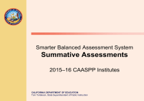 Smarter Balanced Assessment System Summative Assessments 2015–16 CAASPP Institutes CALIFORNIA DEPARTMENT OF EDUCATION Tom Torlakson, State Superintendent of Public Instruction Learning Goals TOM TORLAKSON State Superintendent of Public Instruction Participants understand: • The purpose of summative assessments, including those in the CAASPP System and those planned for future introduction. • The connection between the summative assessment claims, the assessment targets, and California’s new standards. 2 Learning Goals (cont.) TOM TORLAKSON State Superintendent of Public Instruction Participants understand: • How to access and use summative results to support improved teaching and learning for all students, including students with disabilities (SWDs) and English learners (ELs). • The difference between universal tools, designated supports, and accommodations and the students 3 eligible for each. Success Criteria TOM TORLAKSON State Superintendent of Public Instruction Participants can: • Use summative assessment results to prioritize short- and long-term goals that support teaching and learning for all students, including SWDs and ELs. • Explain the connection between the claims, assessment targets, and California’s new standards; and read and understand the value and use of the test blueprints. 4 Success Criteria (cont.) TOM TORLAKSON State Superintendent of Public Instruction Participants can: • Determine which students qualify for designated supports and accommodations. • Make connections between the use of accessibility supports for all students, including SWDs and ELs, on the assessments and in daily classroom use. 5 Assessment Cycles by Purpose: Where Does Summative Assessment Fit In? TOM TORLAKSON State Superintendent of Public Instruction Adapted from Herman and Heritage (2007) The ELA/ELD Framework was adopted by the California State Board of Education on July 9, 2014. The ELA/ELD Framework has not been edited for publication. © 2014 by the California Department of Education. 6 TOM TORLAKSON State Superintendent of Public Instruction 7 Purpose of Summative Assessments TOM TORLAKSON State Superintendent of Public Instruction • Annual measurement of student performance and progress (i.e., growth, beginning in 2015−16 after two years of data) in relation to the standards. – What have my students learned? – Have my students met the performance standard? – What are the strengths and weaknesses of individual students or groups of students? Citation: “Formative Assessment: Making it Happen in the Classroom” (Heritage, 2010) 8 Purpose of Summative Assessments (cont.) TOM TORLAKSON State Superintendent of Public Instruction Useful in program evaluation, as part of accountability systems, and to inform decisions designed to improve teaching and learning. – What can the results tell us about strengths and weaknesses in curriculum, instruction, and programs? – What are the relative strengths in teaching and learning? Citation: “Formative Assessment: Making it Happen in the Classroom” (Heritage, 2010) 9 Summative Assessments in the CAASPP System TOM TORLAKSON State Superintendent of Public Instruction 10 TOM TORLAKSON State Superintendent of Public Instruction Activity: How are Smarter Balanced Assessments Different? • Take a few minutes with your table group to talk about the following question: – In what ways are the Smarter Balanced Summative Assessments fundamentally different from the California Standards Tests? 11 TOM TORLAKSON State Superintendent of Public Instruction Smarter Balanced Summative Assessment Results 12 Type of Reports TOM TORLAKSON State Superintendent of Public Instruction • Individual Student Reports • Summary Reports • Provide: – Overall scale score by content area – Overall achievement levels by content area – Claim-level achievement level – Include Early Assessment Program (EAP) results for grade 11. 13 Overall Scores at a Glance TOM TORLAKSON State Superintendent of Public Instruction • Scale scores – Range between approximately 2000 and 3000 • Achievement levels – Four levels that categorize a range of scale scores 14 Claim Level Information TOM TORLAKSON State Superintendent of Public Instruction ELA: Mathematics: Reading Writing Listening Problem Solving & Data Analysis Concepts & Procedures Communicating Reasoning Research/Inquiry 15 Claim Level Information (cont.) TOM TORLAKSON State Superintendent of Public Instruction Reported at three levels because there are fewer items within each claim (compared to number of items for overall test). • Below Standard • At or Near Standard • Above Standard 16 TOM TORLAKSON State Superintendent of Public Instruction Interpreting and Using Smarter Balanced Summative Assessment Results 17 Understanding Scale Scores TOM TORLAKSON State Superintendent of Public Instruction • A grade 5 student received a scale score of 2550 on the ELA assessment. What can you say about this student’s performance? • What other observations did you have after looking at the scale score ranges? ELA and Mathematics Scale Score Ranges are located at http://www.cde.ca.gov/ta/tg/ca/sbscalerange.asp 18 Understanding Scale Scores (cont.) TOM TORLAKSON State Superintendent of Public Instruction The grade 5 student score of 2550 means that the student achieved “Standard Met” for grade 6. True or False 19 ELA Summary Results – Overall TOM TORLAKSON State Superintendent of Public Instruction 20 ELA Summary Results – Student Group TOM TORLAKSON State Superintendent of Public Instruction 21 ELA Summary Results – Claim Level TOM TORLAKSON State Superintendent of Public Instruction 22 Activity: School/District Report TOM TORLAKSON State Superintendent of Public Instruction Overall and by Claim: • In which area(s) is the school performing particularly well? What is the evidence? • Which area(s) appear to be the school’s biggest challenge(s)? What is the evidence? 23