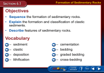 Formation of Sedimentary Rocks Objectives • Sequence the formation of sedimentary rocks. • Explain the formation and classification of clastic sediments. • Describe features of sedimentary rocks. Vocabulary – sediment – cementation – clastic – bedding – deposition – graded bedding – lithification – cross-bedding Formation of Sedimentary Rocks Formation of Sedimentary Rocks • Much of Earth’s surface is covered with sediments. • Sediments are pieces of solid material that have been deposited on Earth’s surface by wind, water, ice, gravity, or chemical precipitation. • When sediments become cemented together, they form sedimentary rocks. • The formation of sedimentary rocks begins when weathering and erosion produce sediments. Formation of Sedimentary Rocks Weathering • Wherever Earth’s crust is exposed at the surface it is subject to weathering. • Weathering is a set of physical and chemical processes that break rock into smaller pieces. – Chemical weathering occurs when the minerals in a rock are dissolved or otherwise chemically changed. – Minerals remain chemically unchanged during physical weathering. Formation of Sedimentary Rocks Weathering Formation of Sedimentary Rocks Weathering • Clastic describes rock and mineral fragments produced by weathering and erosion. • Clastic sediments range in size from huge boulders to microscopic particles. Formation of Sedimentary Rocks Erosion and Transport • After rock fragments have been weathered out of outcrops, they are transported to new locations. • Erosion is the removal and movement of surface materials from one location to another. • The four main agents of erosion are wind, moving water, gravity, and glaciers. • Eroded materials are almost always carried downhill. Formation of Sedimentary Rocks Erosion and Transport Deposition – Deposition occurs when sediments are laid down on the ground or sink to the bottoms of bodies of water. – Sediments are deposited when transport stops. – As water or wind slows down, the largest particles settle out first, then the next-largest, and so on, so that different-sized particles are sorted into layers. – Since wind can move only small grains, sand dunes are commonly made of fine, well-sorted sand. – Sediment deposits from glaciers and landslides are not sorted because both move all materials with equal ease. Formation of Sedimentary Rocks Erosion and Transport Burial – Most sediments are ultimately deposited on Earth in depressions called sedimentary basins. – These basins may contain layers of sediment that together are more than 8 km thick. – As more and more sediment is deposited in an area, the bottom layers are subjected to increasing pressure and temperature which causes lithification. – Lithification includes the physical and chemical processes that transform sediments into sedimentary rocks. Formation of Sedimentary Rocks Lithification • Lithification begins as the weight of overlying sediments forces the sediment grains closer together, causing the physical changes. • Layers of mud shrink as excess water is squeezed out. Formation of Sedimentary Rocks Lithification • Sand resists additional compaction during burial. • Grain-to-grain contacts in sand form a supporting framework that helps maintain open spaces between the grains. Formation of Sedimentary Rocks Lithification • The temperature in Earth’s crust increases with depth by about 30°C per kilometer. • Sediments that are buried 3 to 4 km deep experience temperatures that are high enough to start the chemical and mineral changes that cause cementation. • Cementation occurs when mineral growth cements sediment grains together into solid rock. Formation of Sedimentary Rocks Lithification • There are two common types of cementation. – A new mineral, such as calcite (CaCO3) or iron oxide (Fe2O3) grows between sediment grains as dissolved minerals precipitate out of groundwater. – Existing mineral grains grow larger as more of the same mineral precipitates from groundwater and crystallizes around them. Formation of Sedimentary Rocks Features of Sedimentary Rocks • Bedding, or horizontal layering, is the primary feature of sedimentary rocks. • The type of bedding depends upon the method of transport. • The size of the grains and the material within the bedding depend upon many factors. Formation of Sedimentary Rocks Features of Sedimentary Rocks • Graded bedding is bedding in which the particle sizes become progressively heavier and coarser towards the bottom layers. • Graded bedding is often observed in marine sedimentary rocks that were deposited by underwater landslides. Formation of Sedimentary Rocks Features of Sedimentary Rocks • Cross-bedding is formed as inclined layers of sediment move forward across a horizontal surface. Formation of Sedimentary Rocks Features of Sedimentary Rocks • Small-scale cross-bedding can be observed at sandy beaches and along sandbars in streams and rivers. • Most large-scale cross-bedding is formed by migrating sand dunes. • Small sedimentary features such as ripple marks are also preserved in sedimentary rocks. • If a rippled surface is buried gently by more sediment without being disturbed, it might later be preserved in solid rock. Formation of Sedimentary Rocks Features of Sedimentary Rocks Evidence of Past Life – Fossils are probably the best-known features of sedimentary rocks. – Fossils are the preserved remains, impressions, or any other evidence of once-living organisms. – Fossils are of great interest to Earth scientists because fossils provide evidence of the types of organisms that lived in the distant past, the environments that existed in the past, and how organisms have changed over time. Formation of Sedimentary Rocks Section Assessment 1. Match the following terms with their definitions. ___ C clastic ___ D deposition ___ B lithification ___ A bedding A. horizontal layerin