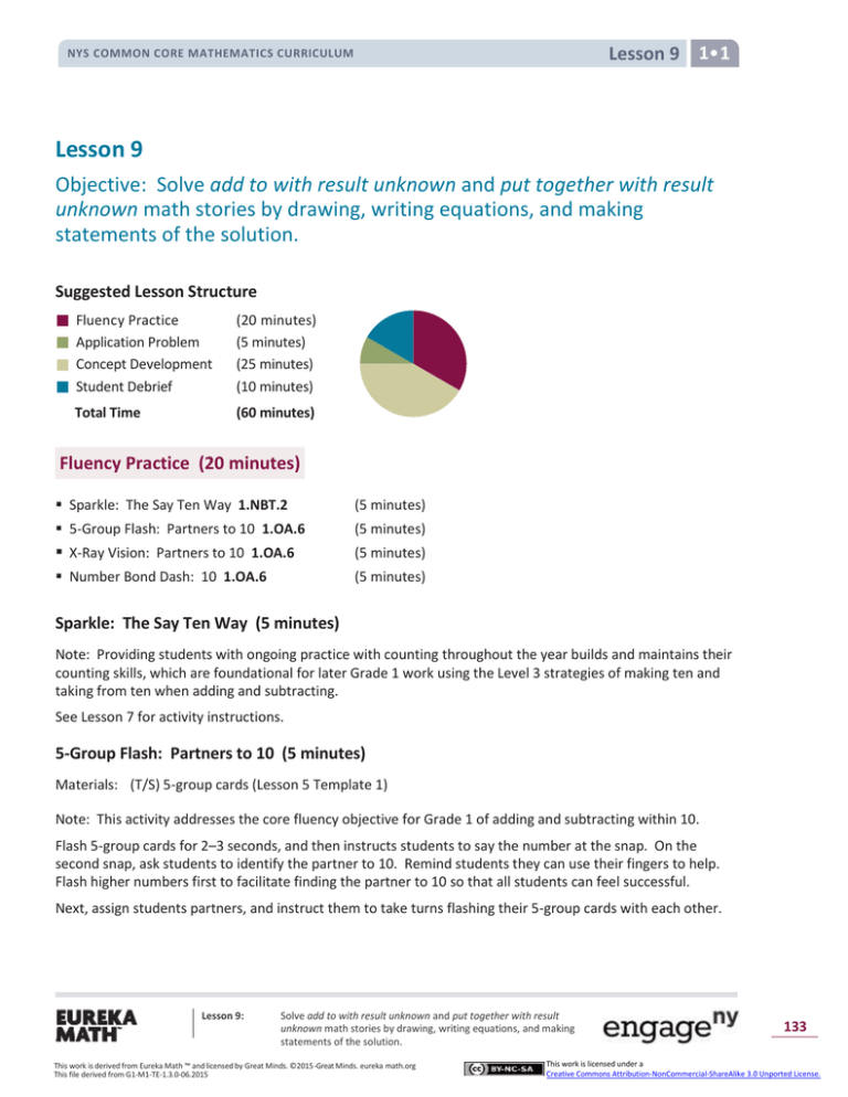 Lesson 9 1 NYS COMMON CORE MATHEMATICS CURRICULUM Lesson 9 Objective: Solve add to with result unknown and put together with result unknown math stories by drawing, writing equations, and making statements of the solution. Suggested Lesson Structure Fluency Practice Application Problem Concept Development Student Debrief Total Time (20 minutes) (5 minutes) (25 minutes) (10 minutes) (60 minutes) Fluency Practice (20 minutes) Sparkle: The Say Ten Way 1.NBT.2 (5 minutes) 5-Group Flash: Partners to 10 1.OA.6 (5 minutes) X-Ray Vision: Partners to 10 1.OA.6 (5 minutes) Number Bond Dash: 10 1.OA.6 (5 minutes) Sparkle: The Say Ten Way (5 minutes) Note: Providing students with ongoing practice with counting throughout the year builds and maintains their counting skills, which are foundational for later Grade 1 work using the Level 3 strategies of making ten and taking from ten when adding and subtracting. See Lesson 7 for activity instructions. 5-Group Flash: Partners to 10 (5 minutes) Materials: (T/S) 5-group cards (Lesson 5 Template 1) Note: This activity addresses the core fluency objective for Grade 1 of adding and subtracting within 10. Flash 5-group cards for 2–3 seconds, and then instructs students to say the number at the snap. On the second snap, ask students to identify the partner to 10. Remind students they can use their fingers to help. Flash higher numbers first to facilitate finding the partner to 10 so that all students can feel successful. Next, assign students partners, and instruct them to take turns flashing their 5-group cards with each other. Lesson 9: Solve add to with result unknown and put together with result unknown math stories by drawing, writing equations, and making statements of the solution. This work is derived from Eureka Math ™ and licensed by Great Minds. ©2015 -Great Minds. eureka math.org This file derived from G1-M1-TE-1.3.0-06.2015 133 This work is licensed under a Creative Commons Attribution-NonCommercial-ShareAlike 3.0 Unported License. Lesson 9 1 NYS COMMON CORE MATHEMATICS CURRICULUM X-Ray Vision: Partners to 10 (5 minutes) Materials: (T) 10 counters, container Note: This activity addresses the core fluency objective for Grade 1 of adding and subtracting within 10. 1. Tell students there is a rumor that some of the children in the class are superheroes, and some of them may have x-ray vision. Place 10 counters on the floor next to a container. 2. Tell students to close their eyes. 3. Put 1 of the items into the container 4. Tell students to open their eyes and identify how many counters were put inside it. 5. When a student figures it out, deem her a superhero with x-ray vision! 6. Continue the game, eliciting all partners to 10. Number Bond Dash: 10 (5 minutes) Materials: (T) Stopwatch or timer (S) Number bond dash 10 (Fluency Template), marker to correct work Note: By using the same system repeatedly, students can focus on the mathematics alone. The activity addresses the core fluency objective for Grade 1 of adding and subtracting within 10. Follow the procedure for the Number Bond Dash (see Lesson 5 Fluency Practice). Application Problem (5 minutes) Kira was making a number bracelet with a total of 10 beads on it. She has put on 3 red beads so far. How many more beads does she need to add to the bracelet? Explain your thinking in a picture and number sentence. Extension: If Kira wants to use 5 red beads and 5 yellow beads for her bracelet, how many red beads and how many yellow beads does she need to add? Note: This problem is designed to serve as a bridge from the previous lesson’s focus on decompositions of 10. Lesson 9: Solve add to with result unknown and put together with result unknown math stories by drawing, writing equations, and making statements of the solution. This work is derived from Eureka Math ™ and licensed by Great Minds. ©2015 -Great Minds. eureka math.org This file derived from G1-M1-TE-1.3.0-06.2015 134 This work is licensed under a Creative Commons Attribution-NonCommercial-ShareAlike 3.0 Unported License. Lesson 9 1 NYS COMMON CORE MATHEMATICS CURRICULUM Concept Development (25 minutes) Materials: (S) Personal white board, number bond and two blank equations (Template) Have students sit in a large semicircle facing the front. Use students to act out the math stories. Draw a number bond on the board. Begin the lesson with add to story problems. T: S: T: T: S: T: S: T: T: S: T: S: T: S: T: S: T: S: Good morning, boys and girls. Welcome to Math Stories Theater! You will be watching some math stories and have a hand at solving them. First, close your eyes. When I tap you on the shoulder, quietly come up to the front. (Close eyes.) (Tap 5 students to come up. Have 1 of the students hide behind the bookcase.) Open your eyes. How many students do you see? 4 students. There are 4 students dancing at a party. After a little while, along came their dancing friend, [name of the hiding student]. How many students are dancing at the dance party now? 5 students. This is the total number of students at the party. Let’s show the total in the number bond. (Write 5 in the total portion of the number bond.) How many students were dancing at first? 4 students. (Record on the number bond.) How many more students came over to dance? 1 more student. (Record on the number bond.) Think about the math story you just watched. Turn and tell your partner the number sentence that tells how many students were dancing in all. (Turn and talk.) Say the number sentence. 4 + 1 = 5. (Write on the board below the completed number bond.) What is the total? 5. Lesson 9: NOTES ON MULTIPLE MEANS FOR ACTION AND EXPRESSION: When choosing numbers to use in a story, start at a simple level, and after students have solved it with easy numbers, change to harder numbers. Here is a suggested sequence starting from simple to more complex: Add within 5 (e.g., 4 + 1 = 5). Add adding 1 (e.g., 8 + 1 = 9). Add using 5 (e.g., 5 + 2 = 7). Add with the smaller addend fi