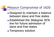 Missouri Compromise of 1820 Designed to maintain a balance between slave and free states Established the 36degree 30’N line for future admission of slave and free states Temporary solution Slavery’s extension questioned Wilmot Proviso: Popular Sovereignty: Stephen Douglas Compromise of 1850 1) 2) 3) 4) 5) California would be free. New Mexico, Utah decide themselves. Slave trade illegal in DC. Texas gave up claims to New Mexico. Fugitive Slave law Passed. Issue of Slave or Free “Great and Primary” issue is one of political power. The North and South are battling over control of the congress and the electoral college. Sectionalism is emotional. Dred Scott Decision 1857 Scott v. Sanford Roger Taney is Chief Justice. Court ruled 7-2 against Scott. “Slaves are not citizens and do not have rights.” Congress could not ban slavery. Lincoln / Douglas Debates 1858 senate Race Freeport Doctrine: It does not matter what the Supreme Court says slavery cannot exist in a territory if the local police do not support it. Stephan Douglas Freeport doctrine States decide Slavery. Not for racial equality The Causes of the Civil War Nationalism States Rights v/s National Rights Sectionalism (economics) Slave Owner Statistics According to the U.S. 1860 Census, one out of every four families in Virginia owned slaves. There were over 100 plantation owners who owned over 100 slaves. Population of Virginia 1860 1,596,318 people Number of slaves in the Lower South: 2,312,352 (47% of total population). Number of slaves in the Upper South: 1,208,758 (29% of total population). Number of slaves in the Border States: 432,586 (13% of total population). Fewer than one-third of all Southern families owned slaves at the peak of slavery prior to the Civil War. On a typical plantation of more than 20 slaves, the capital value of the slaves was greater than the capital value of the land and implements. Election of 1860 Abraham Lincoln – R- Freehomesteads, protective tariff, internal improvements, rail to pacific, preserve the union. Stephan Douglas – D- Popular Sovereignty. The Election of 1860 John Breckenridge – D – Pro Slavery John Bell – Constitutional Union Party Save the Union at all costs and no stance on slavery. Election of 1860 Lincoln was not on the ballot in the southern states. Lincoln received 40% of the vote. CSA formed South Carolina seceded 12-20-1860. CSA formed when Florida, Georgia, Alabama, Texas, Mississippi, Louisiana also secede from the Union. Before April of 1861. Jefferson Davis Elected President of Provisional CSA govt. Instituted a national conscription. First Fighting of the War Fort Sumter, South Carolina April 6, 1861 Shelled for 33 hours. Habeas Corpus Art. I, Sec. 9 of the Constitution says, “The Privilege of the Writ of Habeas Corpus shall not be suspended, unless when in Cases of Rebellion or Invasion the public Safety may require it.” Who is protected by habeas corpus? U.S. citizens? Persons in the U.S.? Person’s held by the U.S. government? Art. I outlines legislative, not executive power. Therefore, is this a limitation on legislative power? Can the executive unilaterally suspend habeas corpus? Ex parte Merryman (1861) In April 1861 Lincoln unilaterally and secretly suspended the writ of habeas corpus in Maryland. Among the pro-Confederates in the Maryland militia was Lieutenant John Merryman. He had recruited and trained soldiers for the Confederate army and was involved in cutting telegraph wires and burning railroad bridges. On May 25, Merryman was arrested and charged with treason. Merryman's lawyers appealed to the United States Circuit Court for the District of Maryland. At this time, Supreme Court Justices sat as circuit judges while the Supreme Court was not in session. Merryman's complaint was heard by Chief Justice Roger Taney. Taney promptly issued a writ of habeas corpus for Merryman and held that the President cannot suspend habeas corpus: “These great and fundamental laws, which congress itself could not suspend, have been disregarded and suspended, like the writ of habeas corpus, by a military order, supported by force of arms. Such is the case now before me, and I can only say that if the authority which the constitution has confided to the judiciary department and judicial officers, may thus, upon any pretext or under any circumstances, be usurped by the military power, at its discretion, the people of the United States are no longer living under a government of laws, but every citizen holds life, liberty and property at the will and pleasure of the army officer in whose military district he may happen to be found.” Lincoln, citing Andrew Jackson before him, disregarded the ruling. Lincoln also got an opinion supporting his suspension from Attorney General Bates. It formed the basis for Lincoln's July 4, 1861 speech to Congress in which he rhetorically asked "Are all the laws, but one, to go unexecuted, and the government itself go to pieces, lest that one be violated?" Lincoln subsequently expanded the zone within which the writ was suspended. Congress Responds Clement Vallandigham When Congress convened in special session on July 4, 1861, Lincoln sent them a message in which he defended his actions in suspending the writ of habeas corpus. Although he felt he had the right to expand his powers under the Constitution, he assured the members “that nothing has been done beyond the constitutional competency of Congress” and he expressed confidence that the legislature would “ratify” the extraordinary measures he had taken. Rep. Clement Vallandigham (D-OH) carried on a prolonged and futile fight against Lincoln’s acts of “usurpation,” and introduced seven resolutions censuring the President for the suppression of freedom of speech and press, the suspension of the writ of habeas corpus and the establishment of a naval blockade, among others. But by voice vote the House quickly tabled the resolutions and they never came to a vote. L