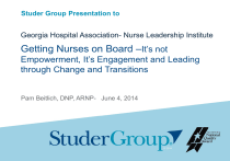Studer Group Presentation to Georgia Hospital Association- Nurse Leadership Institute Getting Nurses on Board –It’s not Empowerment, It’s Engagement and Leading through Change and Transitions Pam Beitlich, DNP, ARNP- June 4, 2014 Our Objectives 1. Examine the external changes in healthcare 2. Understand one model of successful change 3. Discuss the critical role every nurse plays in the future of healthcare Slide 2 COPYRIGHT © STUDER GROUP Please do not quote or disseminate without Studer Group authorization What are: Two things you can start tomorrow that will make you more effective in transitioning through healthcare change? Slide 3 COPYRIGHT © STUDER GROUP Please do not quote or disseminate without Studer Group authorization Slide 4 COPYRIGHT © STUDER GROUP Please do not quote or disseminate without Studer Group authorization So….How’s Your Day Going? Slide 5 COPYRIGHT © STUDER GROUP Please do not quote or disseminate without Studer Group authorization Slide 6 COPYRIGHT © STUDER GROUP Please do not quote or disseminate without Studer Group authorization Slide 7 COPYRIGHT © STUDER GROUP Please do not quote or disseminate without Studer Group authorization Slide 8 COPYRIGHT © STUDER GROUP Please do not quote or disseminate without Studer Group authorization Everything Starts Here.. Your Mission Your Vision Your Values Organizationally and Personally Slide 9 COPYRIGHT © STUDER GROUP Please do not quote or disseminate without Studer Group authorization Studer Group Mission and Vision Mission: To make healthcare a better place for employees to work, physicians to practice medicine and patients to receive care. Vision: To be the intellectual resource for healthcare professionals, combining passion with prescriptive actions and tools, to drive outcomes and maximize the human potential within each organization and healthcare as a whole. The Our Foundation Slide 11 COPYRIGHT © STUDER GROUP Please do not quote or disseminate without Studer Group authorization Execution Framework Evidence-Based LeadershipSM Page 12 COPYRIGHT © STUDER GROUP Please do not quote or disseminate without Studer Group authorization Healthcare Flywheel® Page 13 COPYRIGHT © STUDER GROUP Please do not quote or disseminate without Studer Group authorization Building a Culture of High Performance The External Environment Slide 14 COPYRIGHT © STUDER GROUP Please do not quote or disseminate without Studer Group authorization Significant Changes in Healthcare Over the Last Decade Transparency/Public reporting/Consumer Technology Research Integration Additional Market Changes Episodic vs. Continuous Change Page 15 COPYRIGHT © STUDER GROUP Please do not quote or disseminate without Studer Group authorization Healthcare over the Last Decade Disruptive Change – Payment Page 16 COPYRIGHT © STUDER GROUP Please do not quote or disseminate without Studer Group authorization Over the Next Decade, Hospital Margins Are Expected to Decline Sharply Hospital operating margins 2.2% 2011 2013 2015 With proposed reimbursement cuts, 2.2% will become a 16.8% deficit. Page 17 2017 2019 2021 -16.8% COPYRIGHT © STUDER GROUP Please do not quote or disseminate without Studer Group authorization The Value Equation - Slide 18 COPYRIGHT © STUDER GROUP Please do not quote or disseminate without Studer Group authorization What is Reform really about? Healthier population Lower Use Lower Prices Higher quality $/N 2013 Time Reference: Seeing Beyond Reform: Governance and the Emerging New Healthcare; James Orlikoff, President; Orlikoff & Associates, Inc.; 4800 S. Chicago Beach Drive; Suite 307N; Chicago Il 60615-2054; 773-268-8009; j.orlikoff@att.net Slide 19 Len Nichols, George Mason University COPYRIGHT © STUDER GROUP Please do not quote or disseminate without Studer Group authorization Being a leader in healthcare today is like continuously walking up a down escalator. If one stands still they go backwards. Slide 20 COPYRIGHT © STUDER GROUP Please do not quote or disseminate without Studer Group authorization The New Health Age - “We live in a moment of history where change is so speeded up that we begin to see the present only when it is already disappearing.” -R.D. Laing Slide 21 COPYRIGHT © STUDER GROUP Please do not quote or disseminate without Studer Group authorization Reimbursement changes, technology changes, procedures change, medications change, events and people change. The most important skill is to create a culture that has the agility and ability to adapt to the changes. Slide 22 COPYRIGHT © STUDER GROUP Please do not quote or disseminate without Studer Group authorization Change today happens Quickly.. No longer short periods of change, followed by long plateaus of stability Continual, unrelenting series of changes, with little time for self-renewal Keeping energized, optimistic and inspired in the face of change demands specific skills You need to learn how to respond quickly and flexibly to new demands Slide 23 COPYRIGHT © STUDER GROUP Please do not quote or disseminate without Studer Group authorization Myths Patients: They have unrealistic expectations Staff: Leaders job is to get everyone on board Physicians: It is impossible to get physicians aligned Leadership: Engagement of people and patient experience are soft skills Data: Low “n” – means the data isn’t useful Easy: Seems common sense so it is simple Slide 24 COPYRIGHT © STUDER GROUP Please do not quote or disseminate without Studer Group authorization Observations No victim thinking Control our own destiny People need you You not only save lives but you save healthcare Slide 25 COPYRIGHT © STUDER GROUP Please do not quote or disseminate without Studer Group authorization Execution Triangle Page 26 COPYRIGHT © STUDER GROUP Please do not quote or disseminate without Studer Group authorization Top Ten Challenges in Execution 1. Leaders / Others underperforming and still receiving a good evaluation 2. Change not connected to why 3. La