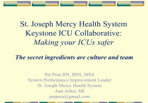St. Joseph Mercy Health System Keystone ICU Collaborative: Making your ICUs safer The secret ingredients are culture and team Pat Posa RN, BSN, MSA System Performance Improvement Leader St. Joseph Mercy Health System Ann Arbor, MI patposa@gmail.com Statewide initiative-75 Hospitals, 127 ICUs In Collaboration with Johns Hopkins’Quality and Research Institute Reduce errors and improve patient outcomes in ICUs Combination of evidence based medicine and quality improvement 5 interventions implemented over a 2 year Grant funded period Still going strong after 7 years!!!! Science of Safety(CUSP) BSI VAP Daily Goals Sepsis Oral Care Delirium and Progressive mobility Partnership between Johns Hopkins University and MHA Initiated with AHRQ Matching Grant Sustained with participant fees in 2005 and 2006 St. Joseph Mercy Hospital Story CUSP in the ICU and beyond Building on CUSP and CLABSI/CAUTI for other work Technical (evidence based practices) Adaptive (communication and teamwork) HAI infection prevention MDR with daily goals Sepsis identification and management Morning briefings/preprocedure briefings Intra-abdominal HTN Learn from defects Delirium Huddles Progressive mobility Crucial Conversations training Just Culture training Start with: Keystone ICU Team Denise Harrison RN, MSN, Director of Critical Care Christine Curran, MD, medical director, MICU Mary-Anne Purtill MD, medical director SICU Pat Posa RN, MSA, system performance improvement leader Marco Hoesel MD, surgical resident Amy Heeg RN, BSN CCULivingston Brian Kurylo RN, CCU Cathy Stewart RN, BSN, CCRN Resourse Pool Toy Bartley, RN, Clinical nurse leader, MICU Diane Jones PA, cardiac surgery David Holmes, cardiac surgery Sondra RN CCU-Livingston Andreea Sandu RN, MICU Nancy Payne RN, MICU Laura Buwalde, RN, SICU Emily McGee, RN, Clinical Nurse Leader, SICU Shikha Kapila, Pharm. D Cheryl Morrin MPH, infection control Chris Kiser, Pharmacy, Livingston Beverly Bay-Jones, RRT, Resp Therapy Tahnee Thibodeau., RD, MICU dietitican Wendy Nieman RN, Project Impact The “Secret Ingredient” Comprehensive Unit-Based Patient Safety Program Pre-CUSP work 1. 2. 3. 4. 5. Form a unit CUSP team Measure unit culture Educate staff on Science of Safety Identify defects using the Staff Safety Assessment; prioritize defects Executive adopts the unit Learn from one defect per quarter Implement team/communication tools Keep focus on this throughout the journey!!! What is a Culture? That’s not the way we do it here!!! Represents a set of shared attitudes, values, goals, practice & behaviors that makes one unit distinct from the next Measure culture at the unit level Pronovost, PJ et al. Clin Chest Med, 2009;30:169-179 Unit CUSP team/Culture measurement and action plan Unit teams meeting at least monthly? What are your challenges? What strategies have been successful? Developed action plan from culture survey result? What are some of interventions you have implemented? Understand system determines performance Use strategies to improve system performance Standardize Create Independent checks for key process Learn from Mistakes Apply strategies to both technical work and team work. Recognize that teams make wise decisions with diverse and independent input How we do this: • Educate all personnel in all the ICU—RN, RT, residents, PA/NP • Educate the attending---difficult but important • Part of orientation Medical errors most often result from a complex interplay of multiple factors. Only rarely Are they due to the carelessness or misconduct of single individuals Lucien L. Leape, MD Harvard School of Public Health Why do mistakes happen “Every system is perfectly designed to achieve the results it gets” Why Mistakes Happen? Variable input (diff pts) Inconsistency/variation Complexity Too many/complicated steps Human intervention Tight time constraints Hierarchical culture Fatigue Inattention/distraction Unfamiliar situations/new problem Using past solutions Equipment design flaws Communications errors Mislabeling/inadequate instructions Process Factors People Factors Communication is Key Effective communication amongst caregivers is essential for a functioning team The Joint Commission reports that ineffective communication is the most commonly cited cause for a sentinel event Observations of ICU teams have shown errors in the ICU to be concentrated after communication events (shift change, handoffs, ect) 30% of errors are associated with communication between nurses and physicians Reader, CCM 2009 Vol 37 No 5; Donchin CCM 1995 Vol 23 Effective Teamwork and Communication Requires: Structured Communication Assertion/Critical Language Psychological Safety Effective Leadership SBAR, structured handoffs Key words, the ability to speak up and stop the show An environment of respect Flat hierarchy, sharing the plan, continuously inviting other team members into the conversation, explicitly asking people to share questions or concerns, using people’s names Safety Issues Survey 1. 2. 3. Tell us about the last patient who would have been harmed without your intervention. How will the next patient be harmed? What steps can you do to prevent this harm? by either preventing the mistake, making the mistake visible or mitigating the harm should it occur This is a very important tool. Use this to identify some of the ‘whys’ mistakes are happening and what is impacting culture Taking an identified patient safety issue from the frontline staff and create an action plan to resolve this is an early win for this program and staff buy-in Science of Safety Education/Staff Safety Assessment Challenging to educate attending physicians What strategies have you used? Staff safety assessment is very important tool How many have done this- once? > 1 times? Have you utilized the LFD tool to help resolve issues identified? Executive Safety Partnerships Page 17 Best Practices: Humble Curiosity • Help your staff to feel heard – unheard staff find an ear elsewhere, a