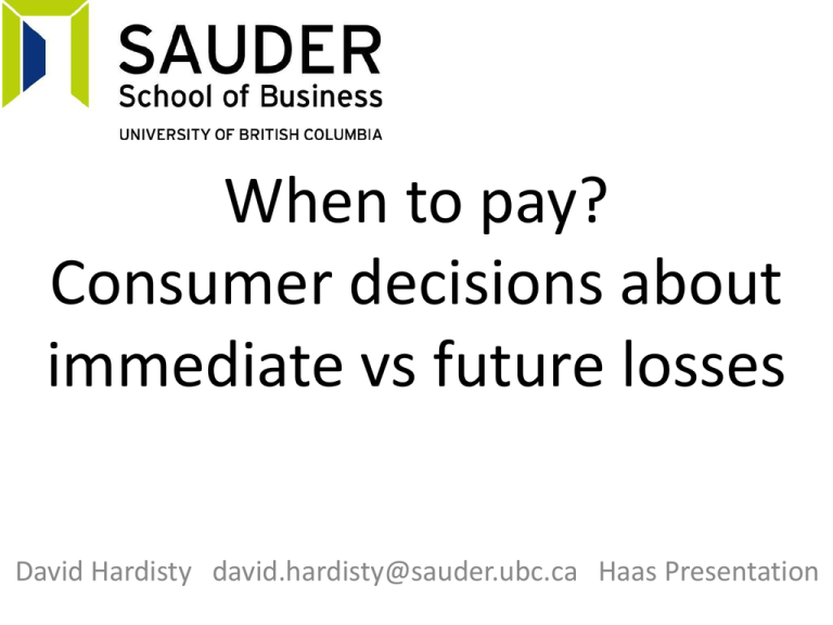 When to pay? Consumer decisions about immediate vs future losses David Hardisty david.hardisty@sauder.ubc.ca Haas Presentation When to pay? 60 watt incandescent 14 watt CFL 9 watt LED $0.87 now $443 later $3.29 now $109 later $17.50 now $61 later (Hardisty, Orlove, Krantz, Small, & Milch, 2012) 2 Some factors affecting time preference • Uncertainty (Bixter & Luhmann, 2013; Takahashi et al, 2007) • Interest on investment (Franklin, 1748; Read, Frederick, & Scholten, 2013) • Resource slack (Zauberman & Lynch, 2005) • Anticipation (Loewenstein 1987) 3 Discounting: definition • Humans, pigeons, and rats all discount hyperbolically (Mazur 1987) V=A/(1+kD) 1 0.8 Value • The higher the discount rate, the more consumers want gains now and losses later 0.6 0.4 0.2 0 0 10 20 30 40 50 Delay 4 The Discounting Bandwagon Count of new publications about delay discounting 200 180 160 140 120 100 80 60 40 20 0 1982 1987 1992 (Hardisty, Thompson, Krantz, & Weber, 2013) 1997 Year 2002 2007 2012 5 The “sign effect” • Losses are discounted less than gains (Mischel et al, 1969; Thaler, 1981) • People want gains now more strongly than they want to postpone losses • Receive $70 now or in a month? 100% choose now. • Pay $70 now or in a month? 47% choose to wait. 6 Talk Outline 1. The “sign effect” is quite robust 2. Trendy non-replication of famous finding 3. Why are losses discounted less than gains? 7 The sign effect: quite robust across domains Experimental Overview • 3 Studies • 477 US residents, recruited & run online • Hypothetical monetary, environmental & health scenarios • DV: discount rate (Hardisty & Weber 2009) Monetary Gain Scenario Imagine you just won a lottery, worth $250, which will be paid to you immediately. However, the lottery commission is giving you the option of receiving a different amount, paid to you one year from now. (Hardisty & Weber 2009) Indifference Point Elicitation • Please choose which option you prefer in each pair: [ ] Win $250 immediately [ ] Win $410 one year from now. [ ] Win $250 immediately [ ] Win $390 one year from now. [ ] Win $250 immediately [ ] Win $370 one year from now. ... ... • Please fill in the number that would make you indifferent between the following two options: A. Win $250 immediately. B. Win $ one year from now. (Hardisty & Weber 2009) Indifference Point Elicitation • Please choose which option you prefer in each pair: [ ] Win $250 immediately [x] Win $410 one year from now. [ ] Win $250 immediately [x] Win $390 one year from now. [x] Win $250 immediately [ ] Win $370 one year from now. ... ... • Please fill in the number that would make you indifferent between the following two options: A. Win $250 immediately. B. Win $ 380 one year from now. (Hardisty & Weber 2009) Discount Rate Computation [ ] Win $250 immediately [x] Win $410 one year from now. [ ] Win $250 immediately [x] Win $390 one year from now. [x] Win $250 immediately [ ] Win $370 one year from now. ... ... • V = A/(1+kD) • 250 = 380/(1+k*1) • k = .52 (Hardisty & Weber 2009) Monetary Loss Scenario Imagine you just got a parking fine for $250, which you must pay immediately. However, the city court is giving you the option of paying a different amount instead, one year from now. (Hardisty & Weber 2009) Air Quality Scenarios • Imagine the current air quality in your area is moderate • Temporary emissions regulation test will immediately improve [worsen] air quality for 3 weeks • Alternately, the test may be carried out one year from now, for a different length of time • We are interested in your preference, as someone who will be personally affected by it, between the two options of improved air now or in the future (Hardisty & Weber 2009) Indifference Point Elicitation • Please choose which option you prefer in each pair: [ ] Improved air quality immediately, for 21 days. [ ] Improved air quality one year from now, for 37 days. [ ] Improved air quality immediately, for 21 days. [ ] Improved air quality one year from now, for 35 days. [ ] Improved air quality immediately, for 21 days. [ ] Improved air quality one year from now, for 33 days. ... ... Please fill in the number that would make you indifferent between the following two options: A. Improved air quality immediately, for 21 days. B. Improved air quality one year from now, for ____ days. (Hardisty & Weber 2009) Mass Transit Scenario (Hardisty & Weber 2009) Garbage Scenario (Hardisty & Weber 2009) Study 1: Discount Rates 0.9 0.8 0.7 0.6 Mean k 0.5 0.4 0.3 0.2 0.1 0 -0.1 (Hardisty & Weber 2009) $- $+ Air- Air+ Garbage- Transit+ Study 2: Objectives • Replicate study 1, using a different measure of air quality & an experienced population • Health outcomes Monetary Scenarios • Gain and loss, same as study 1 Environmental Scenarios: the AQI Understanding the AQI • What is the AQI? The AQI is an index for reporting daily air quality that tells you how clean or polluted your air is... etc Good Moderate Unhealthy for Sensitive Groups Unhealthy Very Unhealthy Hazardous (Hardisty & Weber 2009) Health Scenarios • Used stimuli developed by Chapman (1996) • Imagine you are currently in poor [good] health • You can choose between two treatments [disorders] which will restore you to [cause you to lose your] full health for a limited amount of time (~12 weeks) • One would take effect immediately, the other one year from now Study 2: Results 0.9 0.8 0.7 0.6 Mean k 0.5 0.4 0.3 0.2 0.1 0 -0.1 $- $+ Air- Air+ Health- Health+ 25 (Hardisty & Weber 2009) Study 3: Results 1.6 1.4 1.2 mean k 1 0.8 0.6 0.4 0.2 0 $- (Hardisty & Weber 2009) $+ Air- Air+ Summary so far • Gains are discounted more than losses, across domains • What about when real money is on the line? Real Disco • • • • 60 Columbia students 2 experimental sessions, 4 weeks apart Between subjects: real vs hypothetical Within subjects: - gain vs loss - accelerate vs delay - small vs medium 28 Small Gain Delay 29 