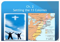 Ch. 2 Settling the 13 Colonies Setting the Scene The _________sent noblemen, soldiers, slaves and priest. The _________permitted only Catholics _____________allowed anyone Reasons the English Came to the New World 1. Personal __________ 2. _______________ 3. Jobs 4. Political Freedom 5. ___________Freedom 6. Adventure CHRISTIAN FREEDOM One common definition understood freedom less as a political or social status than as a moral or spiritual condition. Freedom meant abandoning the life of sin to embrace the teachings of Christ. “Christian liberty” had no connection to later ideas of religious toleration. The English monarchs had an established church (the Church of ___________or ____________Church) that decreed what forms of religious worship and belief were accepted. CHRISITAN FREEDOM Everyone in England was required to attend and pay ______________to support it. _________________faced persecution by the state as well as condemnation by church authorities. Religious uniformity was thought to be essential to public order. The religious wars that racked Europe centered on which religion would predominate in a kingdom, or region, not the right of individuals to choose which church in which to worship. English Settlements Made Permanent Raleigh’s expedition = last individual effort of colonization. _____________ companiescompanies worked with individuals to establish new institutions in a new land. The London Company a.k.a. the ____________Company established the 1st permanent English settlement (_______________________) 1607 – Jamestown is built near Chesapeake Bay along the James River. Unfortunately, it is built in a swampy area full of mosquitoes. What disease is spread by mosquitos? Starvation & Recovery • Government: Jamestown had a 13 man council that argued all the time. Before long, the colony was in peril. • 1610, only 60 colonist were alive. • Captain _____________takes over. • He feels that the settlers are too interested in gold. • He sets up stern rules, including a new work-to-eat policy. • 2 Thessalonians 3:10: everyone should earn his livelihood through diligent work. John Smith & the Indians Smith meets with the most powerful Indian chief in the area, Powhatan. __________________agrees to sell corn to the English. The English, however, take the corn violently. Before long the English and the Indians are involved in many bloody conflicts. One solution: _______________marries Pocahontas. Pocahontas dies _____ years later in England What happens next? Smith is injured, leaves the Jamestown colony and it begins to falter again. “______________________” (90% of the colony died) In 1612, the settlers of Jamestown begin to grow ___________________and it becomes a huge economic success. King James considers tobacco to be vile. Nevertheless, it becomes a huge fad in England. It becomes Jamestown’s CASH CROP, making the settlement lots of money. Colonist who paid their own way to VA received ____acres Representative Government Jamestown settlers could elect ___________________, or representatives. Their Assembly was called the House of Burgesses. Laws are established for the colony. This marks the start of ______________________ government in the New World. 3 Types of Colonies _______________Colony- a legal grant from the king to establish a colony. ______________ Colony- the king appointed a proprietor(s) to govern a colony. ______________ Colony- under direct control of a governor appointed by the crown. Representative History Magna Carta – 1215 – King John is forced to sign a document that states that monarchs, like everyone else, must obey the law. To raise taxes, the king must consult the Great Council (which later is called Parliament). House of Lords House of Commons Virginia Lifestyles _________________ Servants- colonist who signed an agreement to work 4-7 years in exchange for passage to America. Labor eventually expands to ____________________. New Arrivals in Virginia - Africans 1619 – First Africans arrive in VA. by __________________ships Colonists valued them for their agricultural skills. First African born in the English colonies – William 1644 – 300 Africans lived in Virginia Slaves for life Servants that would one day be free. Free Planters – at first they could own property, testify in court, and vote Later 1600s – Virginians allow slavery Slavery expands and free planters lose their rights. New England Colonies 2 Groups Most of the settlers who arrived in New England were searching for religious freedom. ________________________- disagreed with some of the practices of the Anglican Church. They hoped to purify the church from various Roman Catholic practices & ceremonies. ________________________- did not believe that the Anglican Church could be purified. They chose to separate themselves from the church. Pilgrims Seek Religious Freedom It was illegal to worship apart from the Anglican Church, a group of Separatists from ________________, Enlgand believed they would be safer in another country. ____________________= Separatists – they wanted to separate from the Church of England (Protestant). The Church was persecuting them with punishments such as arrest, fines, and executions. The Pilgrims Journey Some leave for Leyden, in the ______________________. The Dutch were tolerant of many religions. The Pilgrims weren’t happy there however, so they went back to England. Pilgrims Seek Religious Freedom So the ____________________ask, and are granted a charter to establish their own colony in Virginia. September 1620 – Over 100 men, women, and children board the Mayflower and head to North America. _______________- group of Englishmen not part of the Pilgrims on the Mayflower A storm sends them off-course and they land on the shore of Cape Cod, Massachusetts. Establish ___________________Colony The ________________________ Before they leave the boat for shore, the Pilgrims & Strangers set up an agreement called the Mayflow