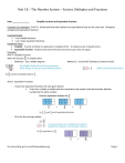 Unit 1B – The Number System – Factors, Multiples and Fractions Date Simplify Fractions and Equivalent Fractions Common Core Standard: 3.NF.A.3 Understand that two fractions are equivalent id they are the same size. Recognize and generate equivalent fractions. Learning Targets 1. I can simplify fractions. 2. I can create equivalent fractions. Important Terms Simplify: To write a fraction or expression in simplest form. To reduce or put in lowest terms. Equivalent Fraction: Fractions that name the same amount or part, they are equal. Examples: Part A: Simplify Fractions 18 Write the fraction 24 in simplest form. - Method 1: Use a ladder diagram. - Method 2: Use the GCF (Greatest Common Factor). Part B: Equivalent Fractions - Create two equivalent fractions for each given faction. To do this, multiply or divide both the numerator (top number) and denominator (bottom number) by the same number. - Fill in for the missing number. For more help, go to www.khanacademy.org Page 1 Unit 1B – The Number System – Factors, Multiples and Fractions Try This: Write each fraction in simplest form. 6 4 1) 8 2) 20 3) Find two equivalent fractions for each fraction. 2 1) 3 2) 3) 4 10 4) 10 35 4) 12 72 6 8 1 4 Find the missing numbers that make the fractions equivalent. 4 𝑥 2 40 1) 36 = 18 2) 7 = 𝑥 3) 70 100 7 =𝑥 4) 56 8 𝑥 =2 For more help, go to www.khanacademy.org Page 2 Unit 1B – The Number System – Factors, Multiples and Fractions Date Mixed Numbers and Improper Fractions Common Core Standard: Learning Targets 1. I can convert improper fractions into mixed numbers. 2. I can convert mixed numbers into improper fractions. Important Terms: 1. Numerator: The top number of a fraction and tells how many parts are being used. 2. Denominator: The bottom number of a fraction and tells how many parts make up the whole. 3. Improper Fraction: A fraction where the numerator is greater than or equal to the denominator. Example: 3 4 1 32 9 7 4. Proper Fraction: A fraction where the numerator is less than the denominator. Example: 5. Mixed Number: A number made up of a whole number and a fractional part. Example: Examples: Converting Improper Fractions to Mixed Numbers 15 Write 2 as a mixed number. Converting Mixed Numbers to Improper Fractions 1 Write 2 5 as an improper fraction. Try This: Write each improper fraction as a mixed number. 19 43 1) 5 2) 5 3) Write each mixed number as an improper fraction. 1 9 5) 9 6) 4 7) 18 4 11 For more help, go to www.khanacademy.org 108 9 3 5 4) 98 11 8) 11 4 9 Page 3 Unit 1B – The Number System – Factors, Multiples and Fractions Date Factors and Multiples Common Core Standard: 6.NS.B.4 Find the greatest common factor of two whole numbers less than or equal to 100 and the least common multiple of two whole numbers less than or equal to 12. Learning Targets 1. I can list all factor pairs for whole numbers between 1 and 100. 2. I can list the first 10 multiples of a given number between 1 and 12. Important Terms: 1. Factor: A number that is multiplied by another number to get a product. Example: the factor pairs of 6 are 1 and 6, 2 and 3. 2. Multiple: The product of any number and a whole number is a multiple of that number. Example: the first 10 multiples of 6 are 6, 12, 18, 24, 30, 36, 42, 48, 54, 60 Examples: Factor pairs: List all the factor pairs of 48. Answer in pairs: 1 and 48, 2 and 24, 3 and 16, 4 and 12, 6 and 8 Answer in numerical order: 1, 2, 3, 4, 6, 8, 12, 16, 24, 48 Multiples: List the first 10 multiples of 11. Answer: 11, 22, 33, 44, 55, 66, 77, 88, 99, 110 Try This: List all factors of the following numbers. You can list as pairs or in numerical order. 1) 35 2) 12 3) 54 4) 88 List the first 10 multiples of the following numbers. 5) 4 6) 6 For more help, go to www.khanacademy.org 7) 8 8) 9 Page 4 Unit 1B – The Number System – Factors, Multiples and Fractions Date Prime Factorization Common Core Standard: 4.OA.B.4 Determine whether a given whole number is prime or composite. 5.NBT.A.3 Read and write numbers in expanded form. Learning Targets 1. I can find the prime factorization of a given number. 2. I can write numbers in expanded and exponential form. Important Terms: 1. Prime Number: A whole number greater than 1 that has exactly two factors, 1 and itself. 2. Prime Factorization: A number written as the product of its prime factors. 3. Expanded Form: A number written as the sum of the values of its digits. 4. Exponential Form: A number is in its exponential form when it is written with a base and an exponent. Examples: Prime Numbers: List the first 10 prime numbers. Answer: 2, 3, 5, 7, 11, 13, 17, 19, 23, 29 Prime Factorization: Expanded Form: Write 236,536 in expanded form. Answer: 200,000 + 30,000 + 6000 + 500 + 30 + 6 Exponential Form: Write the following in exponential form. a. 2 × 2 × 2 answer: 2³ For more help, go to www.khanacademy.org b. 2 × 2 × 3 × 4 × 4 × 4 answer: 2² × 3 × 4³ Page 5 Unit 1B – The Number System – Factors, Multiples and Fractions Try This: Write the following numbers using expanded form. 1) 6587 2) 587,506 3) 4,485,123 4) 98,742 Find the prime factorization of the following numbers. Write your answer in exponential form when possible. 5) 99 6) 150 7) 840 8) 402 For more help, go to www.khanacademy.org 9) 249 10) 284 Page 6 Unit 1B – The Number System – Factors, Multiples and Fractions Date Greatest Common Factor (GCF) Common Core Standard: 6.NS.B.4 Find the greatest common factor of two whole numbers less than or equal to 100 and the least common multiple of two whole numbers less than or equal to 12. Learning Target: I can find the greatest common factor of two numbers. Key Terms Factor: A number that is multiplied by a number to get a product. For example, the factors of 6 are 1, 2, 3 and 6. Greatest Common Factor: The largest common factor of two or more numbers. This is sometimes referred to as the GCF. Methods 1. List the factors. 2. Use a Ladder Diagram Examples 1) Find the GFC of 16 an