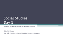 Social Studies Day 5 Interventions and Differentiation World Focus Dr. Bill Cranshaw, Social Studies Program Manager Changing our pedagogy •NOT AGE OR EXPERIENCE RELATED! Day 5 Overview • • • • • • PLU discussion Updates from Systems Social Studies DOE Updates Brief review days 1-4 Intervention Pyramid Differentiation in Social Studies Group Norms and Housekeeping Group Norms: • Ask questions ▫ When they occur ▫ Are no dumb questions • Work toward solutions ▫ Generally there are no right answers ▫ There is no state list of official concepts, tasks, or correct units • Honor confidentiality ▫ Discussions remain in training room Housekeeping: • Parking Lot ▫ ▫ ▫ ▫ Questions Concerns Needs Use yellow stickies • Phone calls ▫ Please restrict to emergencies • Restrooms ▫ Use as needed Professional Learning Units (PLUs) • Local systems award PLUs ▫ MUST bring form to sign FROM SYSTEM ▫ DOE does not provide PLU forms • Trainer will ONLY sign forms at end of day ▫ If you need to leave early for any reason, trainer will only sign for time you were actually in training • CANNOT sign forms retroactively • All information was in training letter that went to systems on June 13th, 2007. Group Discussion: Local System Updates • Take a few minutes to introduce yourself and get to know the teachers at your table. • Share with your group: ▫ How did your system handle GPS training last year? Are there plans to change this year? ▫ What organization is your system using for the curriculum (locally developed, DOE, other)? i.e., curriculum map, pacing, tasks, etc. • Please complete the survey on pg. 27 7 Online Training • • • • Available through www.georgiastandards.org At no cost to systems Click on “Training” in the top right corner Essentially follows the state face to face training that you are receiving today ▫ Intended to be a supplement to face to face training, NOT A SUBSTITUTE ▫ If you choose to use this option, you will become the on-line facilitator Feedback and follow up with participants very important Day 6 • EXTREMELY important that you bring student work samples • Should be from a culminating performance task • Will work better if you have multiple samples • Written work is easiest logistically, but it does not have to be written DOE Updates DOE GPS Updates • 6-8th Grade, World Geography, American Government/Civics, Economics, World History, United States History are ALL GPS • Tests have been developed and aligned with GPS • CRCT and EOCT are purely based on GPS material • GHSGT will be dually aligned • Will be converting 2 electives to GPS • Adding more tasks • Developing interventions for tasks DOE GPS Updates: Frameworks • Several units posted for each GPS course 6-12 • Remaining units in development and will be posted by end of semester • www.georgiastandards.org • Click on “Social Studies” and click on “frameworks” What’s In A Framework? • Essentially, everything that was discussed last year in training • All courses have a curriculum map, consistent themes and enduring understandings (even through different grade levels), balanced assessment plan, and a sample performance task with rubric and resources • Sample units are on page 28 and 35 of your Facilitator’s Guide Graduation Rule • Old Rule ▫ Different diplomas and requirements (CP or TC) ▫ 22 or 24 credits, if want with distinction ▫ Social Studies US History 1 World Area Studies 1 (CP World History required) American Gov’t ½ Econ ½ • New Rule ▫ Single diploma with single set of requirements ▫ 23 units all students ▫ Social Studies US History 1 World History 1 American Gov’t ½ Econ ½ May teach AG and Ec for 1 unit of credit. EOCTs • US History and Econ ▫ No plans at present to add any more • Are completely based on the GPS • Study guides ▫ Only QCC are posted, DO NOT use!! ▫ GPS are being developed, but not finished • Content Descriptions ▫ Are complete and posted for Social Studies • Econ EOCT ▫ Mid-semester administration grades in Dec ▫ Insufficient data to set standards until Dec. EOCT Domain Percentages Standards 1-5 Standards 6-10 Standards 11-14 Standards 15-20 Standards 21-25 GHSGT • Domains ▫ ▫ ▫ ▫ ▫ US History to 1865 (26%) US History from 1865 (25%) World History (18%) American Government (18%) World Geography (13%) • Core Skills are gone ▫ Are to be taught in context ▫ Will be assessed as applicable to the content ▫ Will not be reported separately Social Studies Training Videos • Developed Unit 1 ▫ Explains the importance of teaching Enduring Understandings at the beginning of the course ▫ Shows actual classroom instruction • Plans ▫ Videos demonstrating content unit instruction ▫ Production early next year Review of Days 1-4 Standards Based Education Model (one or more) Standards Elements Stage 1 Identify Desired Results (Big Ideas) Enduring Understandings Essential Questions GPS Skills and Knowledge All above, plus Tasks Student Work Teacher Commentary All above Stage 2 Determine Acceptable Evidence (Design Balanced Assessments) (To assess student progress toward desired results) Stage 3 Plan Learning Experiences and Instruction (to support student success on assessments, leading to desired results) Importance of conceptual teaching • Important to give students the BIG ideas and enduring understandings at the beginning so they can organize new knowledge • Must teach them initially and continually use throughout the course • Every lesson should reinforce a concept/enduring understanding • EUs must be consistent in a course Group Discussion: Concepts in your classroom. • How are you implementing conceptual teaching this year? • What concepts are you using? • How are you ensuring student understanding? • What techniques/strategies have you tried to help students organize the knowledge? • Please pre