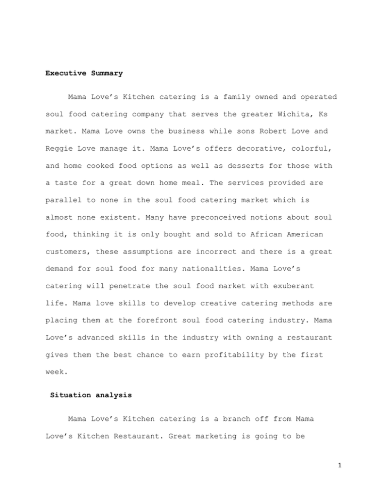 Executive Summary Mama Love’s Kitchen catering is a family owned and operated soul food catering company that serves the greater Wichita, Ks market. Mama Love owns the business while sons Robert Love and Reggie Love manage it. Mama Love’s offers decorative, colorful, and home cooked food options as well as desserts for those with a taste for a great down home meal. The services provided are parallel to none in the soul food catering market which is almost none existent. Many have preconceived notions about soul food, thinking it is only bought and sold to African American customers, these assumptions are incorrect and there is a great demand for soul food for many nationalities. Mama Love’s catering will penetrate the soul food market with exuberant life. Mama love skills to develop creative catering methods are placing them at the forefront soul food catering industry. Mama Love’s advanced skills in the industry with owning a restaurant gives them the best chance to earn profitability by the first week. Situation analysis Mama Love’s Kitchen catering is a branch off from Mama Love’s Kitchen Restaurant. Great marketing is going to be 1 intricate in the success and profitability of this business. Mama Love’s offers great down home foods catering to an array of events including weddings, parties, and mass social events. Mama Love’s is looking to create a market where one does not exist. The market need is high quality, exceptional, creative, and decorative soul food catering, servicing the greater Wichita population. Mama Love’s will meet the large demand with creative innovative ways in preparing and serving soul food meals. Mama Love’s possesses an abundant amount of information about our market. Mama Love’s will diligently work and process information to find ways to easier understand our target market, their needs and what we can do to improve our service. Target Markets Target Middle class customers Upper class customers Other 2 The pie graph above represents our target market. In researching the target market we have learned that in the year 2000 Wichita had a population of 344,284. Being in the year 2007 it is estimated that there are 120,000 more people. 45% of the chart is middle class customers; this is where majority of our market is. While upper class customers make up 35% of our markets. While the rest of the community holds the last 20%. Geographic Our immediate target market is the greater Wichita, Ks area with a population estimated to be 464,000. A 50 mile geographic area for catering services. Our target market population is 53,248. Demographics Families Household income over 48,000 Churches Market Needs Mama Love’s Kitchen Catering is very interested in learning and catering to market needs. Creating a market and knowing market needs is difficult, ye t Mama Love’s feels they have found several points of concentrated interest. 3 Selection: Wide array of soul food menu items. Equipment: Top of the line in order to keep food fresh and warm when traveling long distances. Customer Service: Unparallel service catering to the customers every need with undivided attention. Pricing: Mama Love’s vows to have intense competitive pricing with all catering companies Trends With introducing a new market, there are no trends that directly relate to our soul food catering market. Yet the catering market has developed trends that may indirectly or directly help Mama Love’s develop their catering service. Food Quality: Mama Love’s is a quality organization. Catering high quality food is our main priority. High quality food will produce better soul food which will increase revenue. Creativity: Mama Love’s as well as other catering services have improved catering by applying new and creative ways in preparing and serving food. Catering has transformed eating simple meals into extravagant and lavish dining experience. SWOT Analysis 4 Strengths Strong community ties because of Mama Love’s Kitchen the restaurant. Customer Service Great Food Great Customers Have catered parties to test the market Customer allegiance Weaknesses Limited marketing and financial resources No professional Family owned and operated only limited employees schooling Opportunities Penetrating a none a nonexistent market The ability for franchising Threats High cost of foods Economy taking a dive Other soul food catering services trying to penetrate the market 5 Employee wages High liability insurance Product Focus Points of difference What sets Mama Love’s Kitchen Catering apart from others is their relationship with the customers. Our great food is secondary to the great customer service that we try to display and provide. Soul food is rarely sold by caters because everyone does not know how to prepare it well. Our unique decorations and creative preparations of meals place Mama Love’s Kitchen Catering at the upper echelon of the catering food market. Position of product Mama Love’s Kitchen Catering Serving the greater Wichita area is a soul food catering service. Weddings, parties, church conventions, and meetings are venues Mama Love’s entertain. Soul food often gets misconstrued as black people food rather it is food that originated in the south and should be considered as southern food. Collard greens, macaroni and cheese, brisket, ribs, cornbread, roast, chicken are all key ingredients in making great soul food. Mama Love’s will need a base location in order to cook for our customers, located in old 6 town Mama Love’s is in the heart of the community and city. Our wide selection of food allows us to benefit our customer and supply there needs. The service provided is fairly expensive but, for what a customer receives it is very affordable. Mama Love’s has a plan on how to execute these objectives. We would like to have repeat customers from Mama Love’s Kitchen Restaurant, increase prices by 30%, put the competition to rest with excellent service as well as food. 