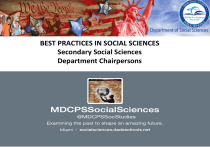 BEST PRACTICES IN SOCIAL SCIENCES Secondary Social Sciences Department Chairpersons AGENDA Topics….. • • • • • • • • • • Social Science curriculum updates. Resources on: M-DCPS Department of Social Sciences Website. Role Social Sciences plays in improving student literacy and writing skills. Social Science EOC’s- How we did? Lessons Learned? Where do we go from here? Special Programs, Curricular Mandates, Instructional Packets, and Competitions Financial Literacy Field Trip Opportunities Pedagogy- Overview of Best Practices Department Chairpersons’ Expectations My Learning Plan Overview of Website www.socialsciences.dadesch ools.net Look for: – – – – – – – – – Current News Pacing Guides/ Lessons Quick link icons Best Practices Quick Start Weekly Briefings Civics & U.S. History Modules Digital Projects Instructional Packets Documents Overview of Website- new this year www.socialsciences.dad eschools.net Look for: • Civics in a Snap K-5 • History Labs (6, 7, 8, 9, 11) • Local History • Digital Projects for 8th grade (plus 7th and 9th from 2014-15). Support Modules: NEED MORE TRAFFIC! Look for under Current News: • Civics EOC Middle School Support Modules • U.S. History High School Support Modules Support Modules: Sample Module 1: Civics Support Modules: Sample Module 1: U.S. History Overview of Website- Weekly Briefings www.socialsciences.dadesch ools.net Look for: • PD Announcements • Program Updates • Competitions • Instructional Resources • EOC Updates • Special Events • 29 thus far! Overview of Website- Weekly Briefings 7th grade Civics EOC Updates • Briefing #18085 • 7th grade Civics EOC Reminders and Updates Overview of Website- Weekly Briefings 11th grade U.S. History EOC Updates • Briefing #18084 • 11thgrade U.S. History EOC Reminders and Updates Pacing Guide Overview • • Pacing guides for social sciences courses can be found on our website socialsciences.dadeschools.net Pacing guides include: – – – – – – Course description Highlighting to emphasize key benchmarks General Internet resources Course themes History Lab instructions Breakdown of topics to be taught: • • • • • • • Topic name Pacing and dates Essential questions Essential content Benchmarks Links to lesson plans and history labs, if applicable Instructional tools: – – – – – FL Standards activity Vocabulary Technology links Suggested activities Assessment, ELL, etc. – Links to Discovery Ed. resources by topic – Links to NBC Learn resources Scavenger Hunt Activity • Use the Social Sciences website and the pacing guide for your grade level and subject area to answer the scavenger hunt questions. • Best Practice: Have your department members do the scavenger hunt to familiarize themselves with the format/structure/resources of the pacing guides. • You can find the scavenger hunt, along with this presentation, under Current News: Secondary Department Chairpersons. Digital Convergence www.socialsciences.d adeschools.net Alsohttp://digital.dadesch ools.net Look for: • Lessons/projects embedded into 7th, 8th, and 9th grade pacing guides. • Discuss Best Practices. What are the Literacy Florida Standards? 1. Balancing Informational and Literary Text 2. Building Knowledge in the Disciplines in the 1 & 2: Non-fiction Texts Authentic Texts 3: Higher Level of Text Complexity Paired Passages 4&5: Focus on command of evidence from text: rubrics and prompts 6: Academic Vocabulary 3. Staircase of Complexity 4. Text-based Answers 5. Writing from Sources 6. Academic Vocabulary Defining the Literacy Balancing Informational & Literary Text Knowledge in the Disciplines Students read a true balance of informational and literary texts. (SS example: students read a historian’s account of Florida’s role in the Civil War). Shift 3 Staircase of Complexity Students read the central, grade appropriate text around which instruction is centered. Teachers are patient, create more time and space and support in the curriculum for close reading. (SS example: Instruction MAY require students to read same text multiple X’s) Shift 4 Text-based Answers Students engage in rich and rigorous evidence based conversations about text. (SS example: Questions are about the TEXT) Shift 5 Writing from Sources Writing emphasizes use of evidence from sources to inform or make an argument. (SS example: In written response to an essential ?, students must use evidence from text) Shift 6 Academic Vocabulary Students constantly build the transferable vocabulary they need to access grade level complex texts. This can be done effectively by spiraling like content in increasingly complex texts. (SS example: Civil War relevant vocabulary from text is learned through the text analysis experience). Shift 1 Shift 2 Students build knowledge about the world (domains/ content areas) through TEXT rather than the teacher or activities (SS example: The Civil War text/account is the base of instruction) EOC’s- Full Implementation How did we do? 7th grade Civics EOC 7th grade Civics EOC- by course FL_COURSE_ABBR_TITLE M/J Civics M/J Civics & Car Pl M/J Civics Adv M/J Civics Adv, Gifted M/J Civics Adv & CP M/J Civics Adv&Car P M/J Civics CCR Number Tested % L3-5 5358 8471 3667 1844 1329 4832 5 42% 37% 83% 96% 94% 85% 0% How did we do? 11th grade U.S. History EOC 11th grade U.S. History EOC- by course EOC . . . Lessons Learned 2015-16 Academic Year • Starting 4th year for US History • 30% of student’s grade • Weekly briefing 18084 • Starting 3rd year for Civics • 30% of student’s grade • Weekly briefing 18085 It is simple… • Use the item specifications to drive instruction • Stimuli-driven instruction based on the item specs Planning is essential… • Planning is essential for strategic instruction • Planning should take place by using an array of resources • But using the Item Specs is pivotal There is no magic resource… • 