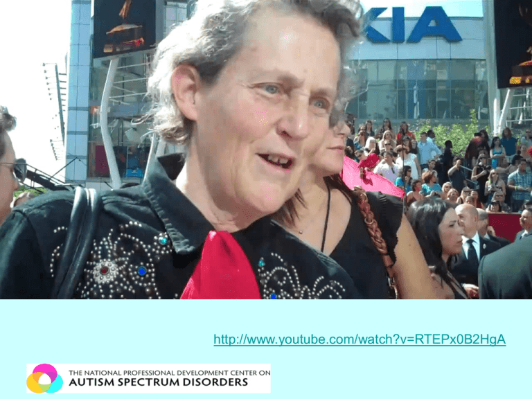 http://www.youtube.com/watch?v=RTEPx0B2HgA Evidenced Based Practices for Children and Youth with ASD Number of students Michigan Students with an ASD Eligibility Label 16000 14000 12000 10000 8000 6000 4000 2000 0 14,760 1,208 19 19 19 19 19 19 19 19 19 19 19 20 20 20 20 20 20 20 20 20 20 20 89 90 91 92 93 94 95 96 97 98 99 00 01 02 03 04 05 06 07 08 09 10 National Professional Development Center on Autism Spectrum Disorders A multi-university center to promote the use of evidencebased practices for children and adolescents with ASD NPDC Sites • FPG Child Development Institute, University of North Carolina at Chapel Hill; PI: Sam Odom and Ann Cox • Waisman Center, University of Wisconsin- Madison PIs: Len Abbeduto and Linda Tuchman-Ginsberg • M.I.N.D. Institute, University of California at Davis; PI: Sally J. Rogers www.fpg.unc.edu/~autismPDC Goals of the NPDC • Promote optimal learning for preschoolers, elementary and secondary students with ASD and support for their families through use of evidence-based practices (EBP) • Increase state capacity to implement EBPs in early identification, intervention, and education • Increase the number of highly qualified personnel serving children with ASD through sustainable technical assistance and professional development NPDC and State Involvement • 5 year project: total number of states: 12 • Work with each state for 2 years Year 1 : master content and process, working with NPDC staff Year 2 : begin training additional state personnel with NPDC staff support Years 3+ : state continues activities Cohort 1 Cohort 2 Cohort 3 Who Is Involved? State Interagency NPDC team Planning Group School Site Teams Training teams for school sites Families Children Admin School com What Does NPDC Provide? Professional Development Technical Assistance Evaluation EPB Content Development Content Development Goal: to translate information about evidence-based practices from research into practical resources for service providers Content Development Define criteria for “evidence” Identify evidence-based practices in lit Define how to do them Web-based Module Contents • Pre-Test/Post-Test • Contextual Information • Step by Step Instructions • Case Examples • Video Examples • Implementation Check List • Evidence-Base • Resources Collaboration with OCALI and NATTAP for Module Development • AIM http://autisminternetmodules.org/index.php Content Development Products •Project Website •Assessment Instruments •Autism Program Environment Rating Scale (APERS) •Autism Evidence-Based Practices Self Inventory •Fidelity Implementation Checklists (BRIEFS) •Web-based Modules: How to do each EBP •Online Course Autism 101 What Does NPDC Provide? Professional Development Technical Assistance Evaluation EPB Content Development Professional Development Goals: Provide training to state professional development providers Provide training activities to practitioners in participating states Support school sites that model evidence-based practices Professional Development •To those on the model site teams, local training teams, and state training team: •Online introductory course on ASD •All materials: APERS, GAS, EBP training modules, BRIEFS •Intensive Summer Training •TA support for model sites and local training teams •2 years of training, technical assistance Professional Development Intensive Summer Institute 1. Increase knowledge of EBP 2. Identify elements of high quality programs 3. Build networking, collaboration and skills of members of state autism training team 4. Develop plans for model sites and for dissemination across state National Professional Development Center on ASD Professional Development Technical Assistance Content Development Evaluation NPDC Collaboration with State Partners Goals: Develop outreach program Provide ongoing site-based training Establish a network of professional development sites, trainees, and national consultants NPDC Collaboration with State Partners Begins with Support for Strategic Planning Activities State Interagency Planning Group stakeholders NPDC Staff Liaison person Provides Support to Local Training Teams Provides Year 1 Training Provides consultation and TA during Year 1 -2 Supports the team during Year 2 Training Team takes over training Year 3 and after Provides Support to Model Site personnel Provides Year 1 Training Provides consultation/TA during Years 1-2 Supports them with Year 2 Training Team takes over Year 3 and after What Does NPDC Provide? Professional Development Technical Assistance Evaluation EPB Content Development Evaluation: Goals: Assist trainees in establishing a system for implementing EBP Collect follow-up data on use of evidence-based practices, practitioner skills, and child and family outcomes Evaluation •Content •Professional Development •Technical Assistance •Outcomes •Child •Family •Practitioner •Systems Who has GAS? Goal Attainment Scaling Summarizing progress on IEP objectives Acknowledgements • Dr. Sam Odom, PI of the NPDC, Frank Porter Graham Center, UNC Chapel Hill Problem • Child MC – age 4 years – has 9 IEP goals in 5 developmental domains that involve 4 benchmarks each. • End of year IEP meeting – mother asks, “Overall, how much progress did he make on his plan this year?” • How can the classroom teacher easily summarize? Problem • School District has added additional funds to support all 36 students in inclusive education in High Point middle school in some general ed classes. • At end of year, asks Resource Teacher for summary of progress of these 36 children so that they can compare progress of included children to progress of center based children at the other middle school in district. • How can the Resource Teacher easily summarize progress of the 36 students? An answer? Goal Attainment Scaling Goal Attainment Scaling (GAS) • What is it? A method for measuring amount of progress made on a goal, 