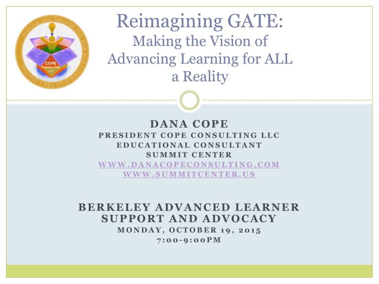 Reimagining GATE: Making the Vision of Advancing Learning for ALL a Reality DANA COPE PRESIDENT COPE CONSULTING LLC EDUCATIONAL CONSULTANT SUMMIT CENTER WWW.DANACOPECONSULTING.COM WWW.SUMMITCENTER.US BERKELEY ADVANCED LEARNER SUPPORT AND ADVOCACY MONDAY, OCTOBER 19, 2015 7:00-9:00PM How Advanced Learner Programs and Services was Born What was What happened What is It began with a vision The Importance of Vision "You've got to think about big things while you're doing small things, so that all the small things go in the right direction." Alvin Toffler School District Visions “…assures opportunities for every student to learn and meet the challenges of the future” (Fairfield Suisun) “…responsive and challenging education for every student.” (Calistoga JUSD) “…all students…college and career ready by the time they graduate from high school. (Sonoma VUSD) What do these visions share? Each student All learners Every child NVUSD’s VISION Transforming lives by instilling 21st century skills and inspiring lifelong learning in every student. In a district with over 18,000 students… All Means All “Determine that the thing can and shall be done and then we shall find the way." Abraham Lincoln District ADVISORY Team Assistant Superintendent Elena Toscano encouraged the team to: Imagine, dream, vision Budget Rank items D.A.C. Recommendations to the Board for GATE K-12 Action Items - 2008 1. Teacher on Special Assignment (TOSA) 2. Provide Professional Learning & GATE Certification 3. Establish a Universal Screening using the Cognitive Abilities Test 4. Training and Support in Differentiation for all teachers 5. Timely Communication to GATE Parents, Teachers, and Administrators Opportunity “We are all faced with a series of great opportunities brilliantly disguised as impossible situations.” “Learn everything you can, anytime you can, from anyone you can - there will always come a time when you will be grateful you did.” 2009 The Journey Begins! Gifted Best Practices Professional Development Co-Sponsored by NVUSD & NCOE October 2009 – June 2010 NVUSD Teachers and TOSA - year long training with Dr. Susan Daniels and Sandy Simpson Course One: Introduction to Teaching the Gifted and Talented and Best Practices that will Benefit ALL Students Course Two: Differentiated Curriculum and Instruction Course Three: Creativity, Thinking and Problem Solving Profiles of Gifted Learners The Ah-ha Moment! 2009 GATE Open House Parents & teachers gathered and brainstormed “Hopes and Dreams for the Future of GATE.” No more “lottery losers” Get resources to classrooms More communication Standardize offerings so no confusion in transition from K-5 to 6-8 to 9-12 GATE Education Code 52200-52212 …develop unique educational opportunities for high- achieving and underachieving pupils…who have been identified as gifted and talented …ensure pupils from economically disadvantaged and varying cultural backgrounds are provided full participation in these opportunities. GATE curricular components are required to be planned and organized as integrated differentiated learning experiences within the school day. Understanding what was? What did NVUSD GATE provide pre-2009 ? 4th & 5th - After-school academies (63 turned away) 6th- 8th - Varied (advanced classes - open to all) 9th-12th - AP/ Honors (open to all) Why was this confusing? If a student were striving or struggling - nothing during the day? THEN opportunity after-school? Should Accelerated learners “hang out” during the day because after-school classes await? Wouldn’t ALL students benefit from enrichment? Is this GATE or simply good education for all? Back to Our District Vision All students need access to intervention and support if needs not met Every student should get what every student needs and keep moving forward Outliers As teachers we can meet the needs of about 80% of our students. When we have outliers at either end, we need to be flexible and ‘think outside the box’ to meet needs. Identifying our Advanced Learning Outliers In 2010 we began providing Universal Screening to all 1,300+ 3rd graders using the CogAT (Cognitive Abilities Test) This has enabled us to Raise awareness of our advanced outliers at each school site 2) Identify some of our Twice-Exceptional students that scored advanced in one area and average to below average in another area. (e.g. discrepancy between verbal and quantitative reasoning) 1) 2011-Data Analysis Uncovers Inequities In 2011-12 ALPS Identified 1,935 students 76.9% came from English at home families 23.1% came from Non-English at home families It was evident that we were not equitably identifying English Learners for ALPS. Collaboration between ELL Services and ALPS was established! Phone Call to Riverside Publishing! Hot Topic Riverside recommendation Met with Ivan Chaidez director of English Learner Services to get his input Established a focus group of teachers to gather input on the identification process The Research Journey began… References for Changing English Learners ALPS Qualification “Assessing Limited English Proficient Students for Eligibility for Gifted Programs”- Florida Technical Assistance Paper Catching Up or Leading the Way copy write 2009- Yong Zhao CDE-EL Institute 2009- “Changing the Face of Giftedness-Alternate Methods for Identifying English Learners” Santa Ana Unified School District Outliers- copy write 2008-Malcom Gladwell Teaching with Poverty in Mind copy write 2009-Eric Jensen Working with Gifted English Learners copy write 2006-Michael S. Matthews Ph.D. Language Development and Academic Learning J. Cummins (1991) “While many children develop native speaker fluency with in two years of immersion in the target language, it takes 5-7 years for a child to be working on an academic level with native speakers.” BICS-Basic Interpersonal Communication Skills Example-Conversational ability in another language CALPS- Cognitive Academic Linguist