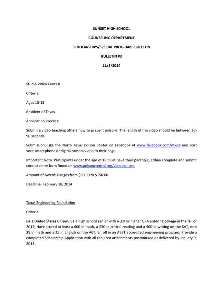 SUNSET HIGH SCHOOL COUNSELING DEPARTMENT SCHOLARSHIPS/SPECIAL PROGRAMS BULLETIN BULLETIN #3 11/3/2014 Studio Video Contest Criteria: Ages 13-18 Resident of Texas Application Process: Submit a video teaching others how to prevent poisons. The length of the video should be between 3090 seconds. Submission: Like the North Texas Poison Center on Facebook at www.facebook.com/ntxpe and post your smart phone or digital camera video to their page. Important Note: Participants under the age of 18 must have their parent/guardian complete and submit contest entry form found on www.poisoncontrol.org/videocontest Amount of Award: Ranges from $50.00 to $150.00 Deadline: February 18, 2014 Texas Engineering Foundation Criteria: Be a United States Citizen; Be a high school senior with a 3.0 or higher GPA entering college in the fall of 2015; Have scored at least a 600 in math, a 550 in critical reading and a 500 in writing on the SAT, or a 29 in math and a 25 in English on the ACT; Enroll in an ABET accredited engineering program; Provide a completed Scholarship Application with all required attachments postmarked or delivered by January 9, 2015. Application Process: Complete the Scholarship Application Form Secure and attach all required components of the application: Essay, Two recommendation letters, Official transcripts Amount of Award: Four individual, one time scholarships of $2,000. Deadline: Submissions must be postmarked by or submitted to your local chapter scholarship coordinator by January 9, 2015. Carr P. Collins Scholars Program Criteria: Recipients must participate in a program of community service approved by Baylor University for one semester during each academic year. They must also attend special seminars each semester as well as an annual dinner held in their honor. In addition, Collins Scholars must maintain a relation with Baylor and the Carr P. Collins Scholars Program by mentoring future scholarship recipients and illustrating the program’s positive results. Students must be unconditionally admitted to the University; be in the top quarter of their graduating class; have a minimum score of 1250 (combined Critical Reading and Math) on the SAT or a minimum score of 28 on the ACT; have completed a balanced college preparatory program including history, science and a foreign language; be a bona fide resident of the state of Texas. Application Process: Students must submit: Completed scholarship application Resume of high school honors, awards, achievements and extracurricular activities Handwritten personal essay of no more than 500 words Nomination from a teacher, counselor or principal. Application is available online at: baylor.edu/admissions/CarrPCollins Amount of Award: Minimum of $4,950 their freshman year, renewable for three additional years provided they meet program requirements. Deadline: January 31, 2015 Regency Go Cosmo! Scholarship Criteria: Scholarship is available for high school seniors graduating before June 30, 2015 Application Process: Submit a side-by side photo collage of your self-makeover including a before and after photo. Only one submission will be accepted per person. Amount of Award: $5,000 Deadline: Runs from October 1-December 4. Forty Acres Scholars Program Criteria: Graduating Seniors who are considering attendance to UT-Austin Applicants can apply even if they have not yet been admitted to the University Application Process: Applicants must select to apply for the Forty Acres Scholars Program. All applicants will automatically be considered for available Named and Chapter Scholarships. Application is available at Scholarships.TexasExes.org Amount of Award: Full-ride merit scholarship Deadline: December 1, 2014 Latino History Essay Competition (Sponsored by UIL) Criteria: The Latino History Competition is open to all students in grades 9-12 attending UIL member high schools. Application Process: Entry forms, contest guidelines and other important information are available on the UIL website. uiltexas.org/academics or uiltexas.org/tilf Theme for Essay: History and cultural legacies of Latinos in Texas history Deadline: March 2, 2015 The Barbara Jordan Historical Essay Competition (Sponsored by UIL) Criteria: The Barbara Jordan Historical Essay Competition is open to all students in grades 9-12 attending UIL member high schools. Application Process: Application Process: Entry forms, contest guidelines and other important information are available on the UIL website. uiltexas.org/academics or uiltexas.org/tilf Theme: African American in Texas: Past and Present Deadline: March 2, 2015 Elliot T Bowers Scholarship (Sam Houston State University Honors Program) Criteria: Each student admitted to the Honors College in Sam Houston State University receives the scholarship. Requirements to apply to the Honors College: SAT Composite Score(critical reading plus math) of 1200 or above, or ACT Composite of 27 or above, or Ranked in the top 10% of their high school graduation class For additional information, please view their website at www.shsu.edu Amount of Award: $2,800 Texas PTA High School Senior Scholarship Criteria: Applicant must be a graduating high school senior from a school in Texas. Applicant must be enrolled in a high school with a local PTA/PTSA , and be a member of that same PTA/PTSA. Applicant must plan to be enrolled full-time in an accredited college or university or a technical institute in the summer or fall semester immediately following high school graduation. Applicant cannot have an immediate family member on the Texas PTA Board of Directors or staff. Application Process: All documents should be submitted in Microsoft Word or PDF format, in order to qualify, the applicant must complete the online application which includes: A resume, limited to one page, listing school activities, community involvement, special recognitions and awards the applicant received in high school. Also, list any work experience during the high school years. A 300-w