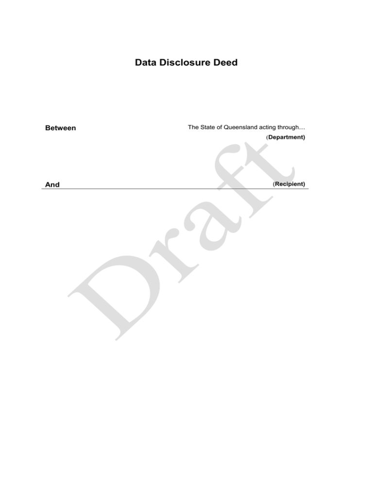 Data Disclosure Deed Between The State of Queensland acting through… (Department) And (Recipient) Table of Contents 1 BACKGROUND 4 2 DEFINITIONS AND INTERPRETATION 4 3 TERM 7 4 DEPARTMENT’S OBLIGATIONS 7 5 RECIPIENT’S OBLIGATIONS 7 6 CONFIDENTIALITY 8 7 PERSONAL INFORMATION 9 8 RETURN OR DESTRUCTION OF DATA 10 9 COMPLIANCE WITH LAWS 11 10 NOTIFICATION OF BREACH 11 11 INTELLECTUAL PROPERTY 12 12 PAYMENT AND GST 12 13 INSURANCES 13 14 INDEMNITY 14 15 DISPUTE RESOLUTION 14 16 TERMINATION 14 17 LEGAL RELATIONSHIP 15 18 ASSIGNMENT AND NOVATION 15 19 TRUSTS 15 20 NOTICES 16 21 GOVERNING LAW 16 22 SEVERABILITY 16 23 VARIATION 17 24 WAIVER 17 25 COSTS 17 26 FURTHER ASSURANCES 17 27 ENTIRE AGREEMENT 17 29 CLAUSES SURVIVING THIS DEED 17 Data Disclosure Deed The State of Queensland acting through Between (Department) And 1 Background 1.1 The Department is the holder of the Data. 1.2 The Recipient proposes to use and/or disclose the Data for [defined]; and 1.3 The Department has agreed to disclose the Data to the Recipient on the terms contained in this Deed. THE PARTIES AGREE AS FOLLOWS 2 Definitions and Interpretation Definitions 2.1 In this Deed the following definitions apply: (a) Authorised Recipient means the entity described in Item 3 of Schedule 1. (b) Authorised Third Party: means a party listed in Schedule 3. (c) Business Day: means any day that is not a Saturday, Sunday or public holiday in Brisbane, Queensland. (d) Claim: includes (and is not limited to) any claim, action, demand, application, proceeding, judgment, enforcement hearing and enforcement order. (e) Commercialisation: means to develop, manufacture, sell, hire or otherwise exploit for financial gain or other advantage any: i product; ii process or information; iii service; iv licence or sub-licence; v joint venture; vi any arrangement similar to the preceding sub-paragraphs involving a third party. (f) Commencement Date: means the date the Deed is entered into (g) Deed: means this document and all schedules and attachments to it. (h) Department: means the State of Queensland represented by and any officers, employees, agents and contractors of. (i) Fee: means any monetary amount (if applicable) that is required to be paid under this Deed, as described in Item Error! Reference source not found. of Schedule 1. (j) GST Law: means A New Tax System (Goods and Services Tax) Act 1999 (Cth), any regulations passed under that Act or any rulings or determinations made by the Australian Tax Office about its interpretation. (k) In Confidence Information: means any information in the possession or control of the Department which: i by its nature is confidential; ii is received on the understanding that it is confidential; or iii is marked as being confidential. In Confidence Information may include: iv confidential information as defined by … v Intellectual Property Rights belonging to the Department; vi any other information which can be classified under the law of equity as confidential information; and vii the terms of this Deed; but does not include information: (l) viii that is in the public domain as at the date of this Deed; ix that is subsequently placed in the public domain other than by breach of this Deed; or x that is subsequently obtained by a third party and which is not otherwise governed by an obligation of confidence. Intellectual Property Rights: means all registered and unregistered rights in Australia and throughout the world for: i copyright; ii trade or service marks; iii designs; iv patents; v semiconductors or circuit layouts; vi source codes and object codes; vii trade, business or company names; viii indications of source or appellations of origin; ix trade secrets; x know-how and confidential information; xi the rights to registration of any of the above; and xii the right to bring an action for infringement of any of the above; but excludes moral rights. (m) 2.2 Law: means: i common law; ii the law of equity; or iii Federal, State or Local Government statute, regulation, ordinance in force from time to time. (n) Loss: includes (and is not limited to) any loss, liability, tax, prohibition, penalty, fine, expense, injury or damage to persons or property. (o) Personal Information: has the same meaning as personal information in section 12 of the Information Privacy Act 2009 (Qld). (p) Project: means the project described in Item 1 of Schedule 1. (q) Purpose: means the purpose described in Item 2 of Schedule 1 for which the Data is required. (r) Recipient: means …and includes officers, employees and agents (s) Tax Invoice: has the meaning given to it under GST Law. In this Deed (unless the context otherwise requires): (a) words importing a gender include any other gender; (b) words in the singular include the plural and vice versa; (c) all dollar amounts refer to Australian currency; (d) a reference to any legislation includes any subordinate legislation made under it and any legislation amending, consolidating or replacing it; (e) a reference to an individual or person includes a corporation, authority, association, joint venture (whether incorporated or unincorporated), partnership, trust or other legal entity; (f) a reference to a document (including this Deed) is to that document as varied, novated, ratified or replaced from time to time; (g) a reference to “consent” means prior written consent; (h) a reference to “includes” in any form is not a word of limitation; (i) clause headings have been included for convenience only and are not intended to affect the meaning or interpretation of this Deed; (j) if any expression is defined, other grammatical forms of that expression will have corresponding meanings; and (k) unless the context otherwise requires, if there is any inconsistency between: i the operative provisions in this Deed; and ii any schedules or attachments to the operative provisions or any document incorporated into the Deed, the operative provisions in this Deed will prevail to the 