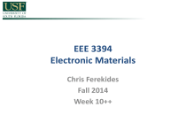 EEE 3394 Electronic Materials Chris Ferekides Fall 2014 Week 10++ Equilibrium Carrier Concentrations REM: gC(E)d(E) f(E) represents the number of available states (cm-3) in the energy interval E+dE. is the probability a state is occupied by an electron; (1-f(E) holes); gC(E)f(E)d(E) gives the number of electrons (cm-3) in the interval E+dE; Therefore the TOTAL number of electrons n (and holes p) in the conduction band (and in the valence band) can be obtained by integrating the relationships: no ETO P g C (E)f(E)dE EC gc (E) po EV g V (E)[1 f(E)]dE EBotom m * n 2m (E Ec ) * n 2 3 gv (E) mp* 2mp* (Ev E) 2 3 Equilibrium Carrier Concentrations no = let m * n 2m p2 E - E C dE * E top n 3 ò EC 1+ e (E - E C ) h= kT Þ no = m * n (E-E F ) (E F - E C ) hC = kT and * n 2m (kT) π2 3 3 kT 2 ¥ 1 h 2dh ò 1+ eh h - C 0 The integral is called the Fermi-Dirac integral of order ½ (F1/2(ηC)) and can be found in tables. Equilibrium Carrier Concentrations Solving the above integrals yield: no = NC 2 p F1 (hC ) 2 po = N V 2 p F1 (hV ) 2 …where NC and NV are the effective densities of states in the conduction and valence bands respectively. Note: Effective Density of States: if all electron (hole) states were located at EC (EV). 2 ×π × m*n kT 3 2 NC = 2[ ] 2 h N V = 2[ 2π × m*p kT h2 ] 3 2 When does n=p g(E) (E Ec)1/2 Ec+c E E E [1 f(E)] CB Area = nE (E )dE n For electrons Ec Ec nE(E) Ev pE(E) EF EF Ev For holes Area = p VB 0 g(E) f(E) nE(E) or pE(E) Equilibrium Carrier Concentrations Note: Previous relationships are GENERAL! Yet inconvenient to calculate every time. HOWEVER, if EF is not “close” to the conduction band or valence band i.e. E V + 3kT £ E F £ EC - 3kT …then the Equilibrium Electron and Hole Concentrations can be expressed as: n o = NCe-(EC -EF ) kT po = N Ve-(EF -EV ) kT When the Fermi Level is too close to the Conduction (or Valence) Band, or lies within the Conduction (or Valence) Band, the semiconductor is said to be Degenerate; i.e. Heavily Doped, with the electron (or hole) concentration being very high. Intrinsic Fermi Level Note: Ei is the Fermi Level (energy) in an intrinsic semiconductor. In intrinsic semiconductors the electron and hole concentrations are equal. n = p = ni …then n i = NC e -(EC -E i ) kT pi = N Ve Ec …solving for NV and NC NC = n i e (EC -E i ) kT Ec N V = n ie (E i -E V ) kT …finally.. n = n ie(EF -Ei ) kT CB -(E i -E V ) kT p = nie(Ei -EF ) kT EFp Ev EFi Ec EFn Ev Ev VB np product What is ni2 and the product np equal to??? pi = N Ve-(Ei -E V ) kT n i = NCe-(EC -Ei ) kT n 2i = NCN Ve-(EC -EF ) kT = NCN Ve-EG kT Þ n i = NC N V e-EG …also .. 2kT n o = n ie(EF -Ei ) kT po = n ie(Ei -EF ) kT Þ n o po = n 2 i REMEMBER: ALL OF THE ABOVE WERE CALCULATED ASSUMING EQUILIBRIUM CONDITIONS AND NONDEGENERATE SEMICONDUCTORS. Charge Neutrality A uniformly doped semiconductor under equilibrium conditions is charge-neutral; i.e. the NET charge is equal to zero. (WHY?) Are there any charges inside the semiconductor? Electrons, holes, ionized acceptors, ionized donors. …therefore … ep - en + eN+D - eN-A = 0 Note: Number of ionized Donors: ND+ Number of ionized Acceptors: NAAt room temperature complete ionization will be assumed. ND+ = ND N A- = N A Calculating n & p np = n 2i p - n + ND - NA = 0 p = n 2i n n 2 - n(ND - NA ) - n 2i = 0 …therefore … ù N D - N A éæ N D - N A ö 2 n= + êç + ni ú ÷ ø 2 2 ëè û 2 1 2 ù N A - N D éæ N A - N D ö 2 2 p = ni n = + êç + ni ú ÷ ø 2 2 ëè û 2 1 2 The above equations are general expressions and can be simplified for most practical applications. Calculating n & p (1) Intrinsic semiconductors ND=NA=0 n=p=ni (2) Doped Semiconductors: ND-NA>>ni or NA-ND>>ni The above is usually true since the controlled doping of semiconductors yields more donors than acceptors, and since typical intentional dopants are at least 1014 (rem: ni=1010 for Si). For N D ññN A and N D ññn i n » ND p » n 2i ND For N A ññN D and N A ññn i p » NA n » n 2i N A Calculating n & p (3) Doped with ni>>ND (or ni>>NA) The semiconductor is considered intrinsic. At high enough temperatures all semiconductors are intrinsic. (4) Compensated Semiconductor: When ND or NA are comparable or equal; keep both concentrations and use general expressions. ù N D - N A éæ N D - N A ö 2 n= + êç + ni ú ÷ ø 2 2 ëè û 2 1 2 ù N A - N D éæ N A - N D ö 2 2 p = ni n = + êç + ni ú ÷ ø 2 2 ëè û 2 1 2 General Expressions for n and p ù N D - N A éæ N D - N A ö 2 n= + êç + ni ú ÷ ø 2 2 ëè û 2 1 2 ù N A - N D éæ N A - N D ö 2 2 p = ni n = + êç + ni ú ÷ ø 2 2 ëè û 2 (1) What happens when ND>>NA & ND>>ni?? (2) What happens when NA>>ND & NA>>ni?? (3) What happens when ni >> NA & ND?? 1 2 Temperature Dependence of n (or p) T < Ts Ts < T < Ti T > Ti CB EF As+ As As Eg As + + + + EF As As As As EF As+ As+ As+ As+ VB (a)T=T1 (b)T=T2 (c)T=T3 (a) Below Ts, the electron concentration is controlled by the ionization of the donors. (b) Between Ts and Ti, the electron concentration is equal to the concentration of donors since they would all have ionized. (c) At high temperatures, thermally generated electrons from the VB exceed the number of electrons from ionized donors and the semiconductor behaves as if intrinsic. From Principles of Electronic Materials and Devices, Third Edition, S.O. Kasap (© McGraw-Hill, 2005) Temperature dependence of n and p Þ n i = NC N V e-EG 2kT Fermi Level (Energy) Note: Derivations will be based on equations derived previously that relate n, p, and EF; given one of these three variables one can calculate the others. (1) Intrinsic semiconductors ND=NA=0 n=p=ni NCe(Ei -EC ) kT = N Ve(EV -Ei ) kT Ei = E C + E V kT æ N V ö + ln ç 2 2 è N C ÷ø Note: The Fermi Level for intrinsic semiconductors is located “near” mid gap! ….. also … æ NV ö æ m ö çè N ÷ø = çè m ÷ø C * p * n Note: 3 2 æ m*p ö EC + EV 3 Ei = + kTln ç * ÷ 2 4 è mn ø The fermi level is exact