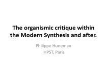 The organismic critique within the Modern Synthesis and after. Philippe Huneman IHPST, Paris Questions about the Modern Synthesis (MS) - Is It over ? Has it been replaced ? Should it be over / extended ? But also : - Did it really exist as a synthesis (i.e., as a unity)? - What was the nature of such unity (theory, set of models, etc.) My 2 independent projects 1. Understand the relations between the emerging philosophy of biology (in the 60s) and the Modern Synthesis (role of Mayr in setting the debates : autonomy claims, reductionnism, evolutionism-centered view, etc.) 2. Assess the current critique of the MS from the view point of the organisms -> today : what about the MS on this issue? The space of controversies Genes Mostly natural selection ( adaptationnism) • Dawkins Dawkins • Lyn Genes Not only natural selection (no adaptationnism) Organisms Mostly natural selection ( adaptationnism) Mayr Lynch Michod Mayr Organisms • Gould Not only natural selection (no adptationnism) Gould The space of controversies Genes Mostly natural selection ( adaptationnism) • Dawkins Dawkins Optimisation line • Lyn Organisms Mostly natural selection ( adaptationnism) Mayr Genes Not only natural selection (no adaptationnism) Mayr • Lynch Michod Organisms Not only natural selection (no Gould adaptationnism) Gould Organismic line • Question : what does it owe to the « Modern Synthesis » (as a not necessarily synthetic set of books, papers, etc.?) • Outline – Evolutionary organicism, then and now – Population genetics and the Modern Synthese(s) I. EVOLUTIONARY ORGANICISM, THEN AND NOW ? A 2 decades-long critique of suborganismic/adaptationist biology - Gould (1983): the « hardening of the Synthesis » - Walsh (2010) The triumph of « suborganismal biology » (= MS) and the recent prospects for « organismal » biology (phenotypic plasticity, adaptivity of organisms) What is crucial : the status of adaptation. (Depew 2010, on the duality (UK /US) of the Synthesis; the « hardening » is the triumph of the former) Received view : an adaptation = a (trait) result(ing) from natural selection Challenges : adaptation as changing the environment (Odling-Smee et al. 2003); adaptation as adaptive plasticity (Walsh 2003, 2010, West-Eberhardt...) Old problem : how to get the adaptedness of organisms ? The current organismic critique of MS, fourfold (after Huneman HPLS 2010) Niche construction Newman and Muller Evo-devo Bauplan ? WestEberhardt, adaptive plasticity But: organismic critique is not new Indeed it was a crucial moment in the consolidation/ aftermath of the MS: Ernst Mayr, “Where Are We?” Cold Spring Harbor Symposium on Quantitative Biology 24 (1959): 1–14. Ernst Mayr, “Cause and Effect in Biology” Science 134 (1961): 1501–06; Theodosius Dobzhansky, “Biology, Molecular and Organismic,” American Zoologist 4 (1964): 443–52. Sewall Wright, “Gene and Organism,” The American Naturalist 87, no. 832 (1953): 5–18. George Gaylord Simpson, “The Status of the Study of Organisms,” American Scientist 50, (1962): 36–45. case of Waddington left aside here Is this a last stage of the MS ? A first round of interpretation ? Organicism, 60s. • The level of organicism is emphasized as proper to biology • Especially against the rise of Molecular Biology Arguments by Wright (levels) and Mayr (2 causes) were crucially influential … Essential idea, 1. • Biology is hierarchised. Reduction, in Nagel’s sense (Dobzhansky, Mayr cite Nagel 1961) does not work. Each level is not deducible from the precedings Wright, 1953 Mayr 1955 • Critique of « beanbag genetics » One- or two-loci model are unable to capture the complexity of causal interactions in evolutionary dynamics Evolutionary thinking is holistic and interactionist - Dobzhansky • “Talking about traits as though they were independent entities is responsible for much confusion in biological and especially in evolutionary thought” (1970, 65). • “A change in the genotype alters the reaction norm, and some of the alterations may enable the new genotype to produce a harmonious response where the ancestral has been a failure … Selection deals not with the genotype as such, but with its dynamic properties, its reaction norm, which is the sole criterion of fitness in the struggle for existence.” (1937, 170). Essential idea, 2. (Mayr). • What’s proper to biology is evolutionary style explanations. (« ultimate ») • « Nothing in biology makes sense etc. » (Dobzhansky 1964.) The strategy. (1) + (2) = the proper biological (= evolutionary) level is organism (and beyond). MAYR Notice : curiously, evolutionary explanation and organicism are tied (whereas, one could think that evolutionary explanations are levelindependent) • • A first reason : genes are too close to chemistry (via molecular biology) A second reason : critique of genetic atomism (as misleading abstraction); interactionism: concrete complexity occurs at the organismic level In biology, a second kind of explanation may be added to the first, or reductionist explanation, made in terms of physical, chemical and mechanical principles. This second form of explanation, which can be called compositionist in contrast to reductionist, is in terms of adaptive usefulness of structures and processes to the whole organism and to the species of which it is a part, and still further, in terms of ecological function in which the species occurs. (Simpson 1964) II.2. MAYR’S ORGANICISM Mayr ? “It is hard to exaggerate the significance of Mayr's defense of the proximate/ultimate distinction in establishing philosophy of biology as a legitimate special area of inquiry” (Beatty 1994) Most quoted author in Hull’s classical « What philosophy of biology is not ? » (19 occurrences) Critique of genetic atomism Two polemic stances: 1942-53, downplay the role of geneticists in the founding of modern evolutionary biology 1955-later (after the discovery of DN