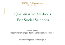 SKEMA – Ph.D programme 2010 – 2011 Quantitative Methods For Social Sciences Lionel Nesta Observatoire Français des Conjonctures Economiques Lionel.nesta@ofce.sciences-po.fr Objective of The Course The objective of the class is to provide students with a set of techniques to analyze quantitative data. It concerns the application of quantitative and statistical approaches as developed in the social sciences, for future decision makers, policy markers, stake holders, managers, etc. All courses are computer-based classes using the STATA statistical package. The objective is to reach levels of competence which provide the students with skills to both read and understand the work of others and to carry out one's own research. Examples Rise in biotechnology Should the EU fund fundamental research in biotechnology? Has biotechnology increased the productivity of firm-level R&D? Did it increase the speed of discovery in pharmaceutical R&D? Increasing university-industry collaborations Does it facilitate innovation by firms? Does it increase the production of new knowledge by academics? Does it modify the fundamental/applied nature of research? Examples Economic (productivity) Growth Does it come mainly from new firms or improving existing firms? Is market selection operating correctly? Why do good firms exit the market? How does the organisation of knowledge impact on performance? How do knowledge stock and specialisation impact on productivity? How do firms enter into new technological fields? Do firms diversify in new technologies/businesses purposively? Structure of the Class Part 1 : Descriptive Statistics Part 2 : Statistical Inference Part 3 : Relationship Between Variables Part 4 : Ordinary Least Squares (OLS) Part 5 : Extension to OLS Part 6 : Qualitative Dependent variables Structure of the Class Part 1 : Descriptive Statistics Mean, variance, standard deviation Data management Part 2 : Statistical Inference Part 3 : Relationship Between Variables Part 4 : Ordinary Least Squares (OLS) Part 5 : Extension to OLS Part 6 : Qualitative Dependent variables Structure of the Class Part 1 : Descriptive Statistics Part 2 : Statistical Inference Distributions Comparison of means Part 3 : Relationship Between Variables Part 4 : Ordinary Least Squares (OLS) Part 5 : Extension to OLS Part 6 : Qualitative Dependent variables Structure of the Class Part 1 : Descriptive Statistics Part 2 : Statistical Inference Part 3 : Relationship Between Variables ANOVA, Chi-Square Correlation Part 4 : Ordinary Least Squares (OLS) Part 5 : Extension to OLS Part 6 : Qualitative Dependent variables Structure of the Class Part 1 : Descriptive Statistics Part 2 : Statistical Inference Part 3 : Relationship Between Variables Part 4 : Ordinary Least Squares (OLS) Correlation coefficient, simple regression Multiple regression Part 5 : Extension to OLS Part 6 : Qualitative Dependent variables Structure of the Class Part 1 : Descriptive Statistics Part 2 : Statistical Inference Part 3 : Relationship Between Variables Part 4 : Ordinary Least Squares (OLS) Part 5 : Extension to OLS Regressions diagnostics Qualitative explanatory variables Part 6 : Qualitative Dependent variables Structure of the Class Part 1 : Descriptive Statistics Part 2 : Statistical Inference Part 3 : Relationship Between Variables Part 4 : Ordinary Least Squares (OLS) Part 5 : Extension to OLS Part 6 : Qualitative Dependent variables Linear probability model Maximum likelihood (logit, probit) Part 1 Descriptive Statistics Types of Data Descriptive statistics is the branch of statistics which gathers all techniques used to describe and summarize quantitative and qualitative data. Quantitative data Continuous Measured on a scale (value its the range) The size of the number reflect the amount of the variable Age; wage, sales; height, weight; GDP Qualitative data Discrete, categorical The number reflect the category of the variable Type of work; gender; nationality Descriptive Statistics All means are good to summarize data in a synthetic way: graphs; charts; tables. Quantitative data Graphs: scatter plots; line plots; histograms Central tendency Dispersion Qualitative data Graphs: pie graphs; histograms Tables, frequency, percentage, cumulative percentage Cross tables Central Tendency and Dispersion A distribution is an ordered set of numbers showing how many times each occurred, from the lowest to the highest number or the reverse Central tendency: measures of the degree to which scores are clustered around the mean of a distribution Dispersion: measures the fluctuations around the characteristics of central tendency In other words, the characteristics of central tendency produce stylized facts, when the characteristics of dispersion look at the representativeness of a given stylized fact. Central Tendency The mode The most frequent score in distribution is called the mode. The median The middle value of all observed values, when 50% of observed value are higher and 50% of observed value are lower than the median The mean The sum of all of the values divided by the number of value 1 X N i n x i 1 i The mode, the mean and the median ore equal if and only of the distribution is symmetrical and unimodal. Dispersion The range Difference between the maximum and minimum values R xmax xmin The variance Average of the squared differences between data points and the mean (average) quadratic deviation i n 2 x i 1 i X 2 N The standard deviation Square root of variance, therefore measures the spread of data about the mean, measured in the same units as the data in 2 x i 1 i X N 2 Research Productivity in the Bio-pharmaceutical Industry EU Framework Programme 7 Stylised Facts about Modern Biotech 1. 2. Innovations emerge from uncertain, complex processes involving knowledge and markets: Roles of networks. Economic value is created in many ways – globally and in geographical agglomerations 3. Various linkages exist among diverse actors (LDFs, DBFs, Univ, Venture Cap
