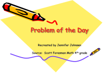 Problem of the Day Recreated by Jennifer Johnsen Source: Scott Foresman Math 4th grade Problem of the Day 1-1 Tell what information is not needed. Then solve. Sue collected 73 bugs and Vern collected 65 bugs, including 47 with wings. How man of Vern’s bugs did not have wings? Problem of the Day 1-2 How many more milligrams of calcium does one orange have than one banana? Fruit Apple Banana Orange Peach Milligrams of Calcium in Fruit Milligrams of Calcium 10 7 52 4 Problem of the Day 1-3 The sum of my digits is 13. My hundreds place is 3 less than 5. My ones place is 4 more than 3. My thousands place is even. What 4-digit numbers can I be? Problem of the Day 1-4 How many more lines of symmetry does Figure A have than Figure B? (Hint: Use objects.) Rectangle Square Problem of the Day 1-5 Heather, Erin, and Greg are going to the movies. List the different ways they could sit in a row. How many ways could Erin and Greg sit next to each other? Problem of the Day 1-6 Tell the operation needed to solve the problem. Toby, Neal, and Quinn each gave canned food to the Food Drive. How many cans did they give altogether? Problem of the Day 1-7 If you took a shape out of this box without looking, which shape would you be most likely to pick? Which shape would you be least likely to pick? Explain. Problem of the Day 1-8 How many more miles did Montel ride than Vicky? Train Rides Montel Vicky Monday 15 miles 18 miles Tuesday 22 miles 13 miles Problem of the Day 1-9 How many triangles can you find in the picture? What other shapes can you find? (Hint: Draw a picture.) Problem of the Day 1-10 Makena’s turtle crawled 1 foot, 3 inches. Whit’s turtle crawled 16 inches. Ryan’s turtle crawled 11 inches. Which turtle crawled the furthest? (Hint: 12 inches = 1 foot) Problem of the Day 1-11 Write a number sentence. Solve. Lacy bought a hat and a wrench. How much money did she spend? $9 $12 Problem of the Day 1-12 Mayan Numerals Value Symbol 1 The Mayan civilization (A.D. 5 300 to 900) used these symbols to represent numbers. Copy and complete the table. Value 3 4 7 Symbol Value 9 10 13 Symbol Value 14 15 19 Symbol Problem of the Day 1-13 Mr. Cho bought 75 apples, 55 oranges, and some pears. After he sold 3 oranges, he had 212 pieces of fruit left. How many pears did Mr. Cho buy? Problem of the Day 1-14 Jason had $0.87 in his pocket. He took out 3 quarters. List all of the possible combinations of coins he could have left in his pocket. (Hint: Make an organized list.) Problem of the Day 2-1 Ezra has an apple, a pear, a banana, and an orange. He can take only two pieces of fruit on his field trip. What different combinations of fruit can he take? Problem of the Day 2-2 Draw a picture to show the main idea. Solve. The animal rescue association put this ad in the newspaper: How many animals need adopting? Available for Immediate Adoption: 29 cats 15 dogs Problem of the Day 2-3 Place these stadiums in order from least to greatest according to their seating capacity. Stadium Seats Stadium S 66,944 Stadium B 65,600 Stadium J 66,321 Stadium R 56,127 Stadium T 65,675 Stadium V 65,352 Problem of the Day 2-4 Dennis had $9 on Monday. He earned $3 on Tuesday for mowing the yard. On Friday he spent $4 at a bookstore. How much did he have then? Problem of the Day 2-5 Sally made 8 bookmarks. Each bookmark was made with 3 ribbons. How many ribbons did she use? (Hint: Make a table.) Problem of the Day 2-6 Mrs. Taylor makes hummingbird food. She uses 4 cups of water for every 1 cup of sugar. How many cups of water does she need if she has 5 cups of sugar? Problem of the Day 2-7 What information is needed to solve the problem? In a football game, the winning team passed for 47 more yards than the losing team. How many yards did the winning team pass for? Problem of the Day 2-8 Cinco de Mayo is a Mexican holiday. It helps people remember the victory of the Mexican Army over the French at the Battle of Puebla in 1862. How long has it been since the Battle of Puebla? Problem of the Day 2-9 Vincent has 383 football cards and 439 baseball cards. How many more does he need to have 1,000 sports cards? Problem of the Day 2-10 How did the number of tickets sold change over the week? (Hint: Make a bar graph.) High School Football Tickets Sold Day Tickets Monday 12 Tuesday 23 Wednesday 35 Thursday 40 Friday 55 Problem of the Day 2-11 Between which two years did Trevor grow the most? (Hint: Make a line graph.) Trevor’s Height Year Height Year 1 30 inches Year 2 35 inches Year 3 38 inches Year 4 41 inches Year 5 43 inches Problem of the Day 2-12 Write an expression. Find its value. Roger found 6 shells. Tom found 8 more shells than Roger. How many shells did Tom find? Problem of the Day 2-13 How many right angles are in each figure below? Figure B Figure A Figure C Problem of the Day 2-14 Carrie bought a soccer ball and a bat. How much change should she get from $10.00? $3.49 $3.49 $2.89 Problem of the Day 3-1 In which step will the number 200,000 appear? (Hint: Look for a pattern.) Step 1: 194,000 Step 2: 195,000 Step 3: 196,000; and so on. Problem of the Day 3-2 Look for a pattern. Draw the next two shapes. Problem of the Day 3-3 Write a number expression. Give its value. Antonio had $134 in his savings account. He put in $67 more. How much was in Antonio’s account then? Problem of the Day 3-4 The country of Indonesia is a group of islands between Asia and Australia. It has an area of 704,400 square miles and the 4th greatest population in the world, 228,437,870 people. Write the word form for each number. Problem of the Day 3-5 Jason bought 4 packages of pencils and 3 packages of pencil erasers. How many extra erasers did he have? 8 erasers per package 5 pencils per package Problem of the Day 3-6 Lee and Amy fed their dog Sox 24 days in a row. Lee fed Sox two days more than Amy. How many days did each feed Sox? (Hint: Try, check, and revise.) Problem of the Day 3-7 Mr. Carter spent $16 for museum admission. He had 3 people with h