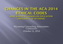 Wyoming Counseling AssociationConference October 11, 2014 1. An overview of significant changes in the 2014 ACA counseling ethical codes. 2. Be able to apply the new codes to several counseling situations (Values; Technology; Supervision). 3. Increase awareness of important changes in ethical practices—especially values, boundaries, and technology. Have you ever made a mistake? If yes, what was it (or identify someone else’s mistake). What makes a mistake a mistake? If you could have redone, what would have you needed to have avoided this? Share with person next to you. What did you discover about mistakes? Means--to miss the mark http://www.ted.com/talks/kathryn_schulz_o n_being_wrong.html 17 min Kathryn Schulz: On being wrong | Video on Talks. Kathryn Schulz: On being wrong. Filmed Mar 2011 • Posted Apr 2011 • TED2011. TED2011 ... www.ted.com/talks/kathryn_schul… Professional—to profess to do (Ponton & Duba, 2009) Ethics make a profession, a profession… Counseling is a professional relationship that empowers diverse individuals, families, and groups to accomplish mental health, wellness, education, and career goals. …..a basic framework and that each participating organization is welcome to add a statement that fleshes out the particular specialty or area of focus. ACA Codes-(APGA,1961)-Ist codes-generic 1993-7 ACA divisions developed own codes Thus in 1995 broader Codes were created 5 revisions since 1961 ( every 7-10 years) 2011-taskforce (11) to update 2005 code Most recent-2014 Why??? Education Accountability/protection Catalyst to better practice/Ethical guide Guidelines for regulatory bodies and Associations Professional identity Establishes principles/best practices Other 1. Sets forth the ethical obligations of ACA members and provides guidance intended to inform the ethical practice of professional counselors. 2. Identifies ethical considerations relevant to professional counselors and counselors-in-training. 3. Enables the association to clarify for current and prospective members, and for those served by members, the nature of the ethical responsibilities held in common by its members. 4. Serves as an ethical guide designed to assist members in constructing a course of action that best serves those utilizing counseling services and establishes expectations of conduct with a primary emphasis on the role of the professional counselor. 5. Helps to support the mission of ACA. 6. The standards contained serve as the basis for processing inquiries and ethics complaints concerning ACA members Problem—If possible or likely--don’t do!! Codes/Laws Principles (Autonomy, Beneficence, Nonmalfeasance, Fidelity, Veracity, Justice) Emotional and Values Awareness Consult (with 3 peers)-Document Collaborate with Client Consequences –Consider Worst Possible Outcomes Choose/Evaluate Course of Action Implement Evaluate Crossing The Murky Moral Terrain Of Ethics with Mark Matousek-New Dimensions Radio—We are hard wired (brain) to: 1. Avoid Harm (Avoidance) and Care 2. Justice and Fairness 3. In Group Loyalty (Us/Them) 4. Authority and Respect 5. Sacredness and Purity Through an exploratory survey in 2012 of a representative sample (n=316) of licensed and certified counseling and social work mental health professionals (N=1,324) in Wyoming ethical issues and training needs were identified by the providers. The intended goal was to obtain direct feedback about ethical issues and ethical training needs from practitioners themselves who work in rural settings. Three primary ethical issues: Dual relationships Confidentiality Competence Three primary ethical training needs: Boundaries State Rules and Regulations Supervision Expanded glossary Preamble-5 values/6 principles and 6 purposes defined 9 sections (previously 8) Informed consent, boundaries, values, referral Multiculturalism infused Added technology section Professional values are an important way of living out an ethical commitment. The following are core professional values of the counseling profession: 1. enhancing human development throughout the life span; 2. honoring diversity and embracing a multicultural approach in support of the worth, dignity, potential, and uniqueness of people within their social and cultural contexts; 3. promoting social justice; 4. safeguarding the integrity of the counselor–client relationship; and 5. practicing in a competent and ethical manner. These professional values provide a conceptual basis for the ethical principles enumerated below. These principles are the foundation for ethical behavior and decision making. The fundamental principles of professional ethical behavior are • autonomy, or fostering the right to control the direction of one’s life; • nonmaleficence, or avoiding actions that cause harm; • beneficence, or working for the good of the individual and society by promoting mental health and well-being; • justice, or treating individuals equitably and fostering fairness and equality; • fidelity, or honoring commitments and keeping promises, including fulfilling one’s responsibilities of trust in professional relationships; and • veracity, or dealing truthfully with individuals with whom counselors come into professional contact. Counselors acknowledge that resolving ethical issues is a process; ethical reasoning includes consideration of professional values, professional ethical principles, and ethical standards…. Through a chosen ethical decision-making process and evaluation of the context of the situation, counselors work collaboratively with clients to make decisions that promote clients’ growth and development I.1.b. Ethical Decision Making When counselors are faced with an ethical dilemma, they use and document, as appropriate, an ethical decision making model that may include, but is not limited to, consultation; consideration of relevant ethical standards, principles, and laws; generation of potential courses of action; deliberation of risks a