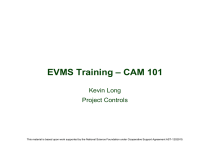 EVMS Training – CAM 101 Kevin Long Project Controls This material is based upon work supported by the National Science Foundation under Cooperative Support Agreement AST-1202910. Outline Session 1(~1.5 hrs) Earned Value Management (EVM) Organization Planning, Scheduling & Budgeting Analysis and Management Reporting Change Control Session 2 (~1.75 hrs) eCAM Usage Session 3 (~1.5 hrs) Jira integration Actuals and invoicing Kevin Long, 25 March 2015, Slide 2 Earned Value Management (EVM) Definition Definition • A systematic project management process that results in an integrated plan against which performance is measured objectively • A systematic approach for calibrating the heath of a project Application • Work is planned, budgeted, & scheduled in time-phased increments • Takes into consideration risk, uncertainties, & assumptions • Involves project manager, control account managers (CAM), contractors, customers, etc Objective • Provide both the government and contractors the ability to examine detailed schedule information, critical program and technical milestones, and cost data The ANSI/EIA-748-C contains a set of 32 Guidelines that defines the requirements that an Earned Value Management System (EVMS) must meet Kevin Long, 25 March 2015, Slide 3 Earned Value Management (EVM) Why Use EVM? Earned Value Management System (EVMS) is required by NSF to strengthen the overall performance of project management and the acquisition of capital assets EVMS allows both government and contractor managers to gain significant insights into technical, cost, and schedule progress of contracts and projects Earned Value provides a concise and timely view of project progress, enabling early forecasting and resolution of cost and schedule issues. When the performance indices (CPI and SPI) are analyzed over time, potential future issues, which can be resolved through immediate action, are clearly identified. This makes Earned Value a very powerful tool for forecasting and mitigating risks. Kevin Long, 25 March 2015, Slide 4 Earned Value Management(EVM) System [1] • Plan all project work » Objectively assess progress at the performance level » Accomplished work is from planned tasks progressed » The budgeted cost of the work quantifies the amount of accomplishment » Summarize data for progressively higher levels of project management » Analyze significant deviations form the baseline plan » Forecast impacts on cost and schedule » Maintain the baseline $ time Kevin Long, 25 March 2015, Slide 5 Earned Value Management(EVM) System [2] Cost Variance (CV) CV=EV-Actual CV SV $ Favorable or unfavorable Schedule Variance (SV) SV = EV – Budget (Planned) Ahead or behind time Kevin Long, 25 March 2015, Slide 6 Earned Value Management (EVM) Acronyms » BCWS (Budgeted Cost Of Work Scheduled) – Value of work planned to be accomplished during a given period of time. How much work should be done? Also called planned value (PV) » BCWP (Budgeted Cost Of Work Performed) – Value of work accomplished or earned value. How much work is done? Also called earned value (EV) » ACWP (Actual Cost Of Work Performed) – Cost of work accomplished or actual cost. How much did it cost? Also called actual cost (AC) » TPC (Total Project Cost) – Sum of all project costs (including contingency). How much could it all cost? » BAC (Budget At Completion) – Sum of all budgets thru any given level (without contingency). What was the total job supposed to cost? » ETC (Estimate To Completion) – Estimated value of the authorized work remaining to be completed. How much will the remaining work cost? » EAC (Estimate At Completion) – Estimate of total cost of all authorized work thru project completion. What do we now expect the total job to cost? » SV & CV (Schedule Variance & Cost Variance) – Measure of cost & schedule performance on a project. How far ahead or behind cost or schedule am I? » SPI & CPI (Schedule Performance Index & Cost Performance Index) – Schedule & cost efficiency representing the ratio of work performed to work scheduled or costed. How efficiently am I accomplishing work? » Grab a Gold Card Here https://acc.dau.mil/gc Kevin Long, 25 March 2015, Slide 7 Earned Value Management (EVM) Role as a Control Account Manager (CAM) The CAM plays a critical role in an earned value management system A CAM can manage multiple accounts A CAM maintains responsibility for each individual control account (CA) that represents the work assigned to one responsible organizational entity (or integrated work team) for a single program WBS element A CAM is responsible for the planning, coordination and achievement of all work within a CA and provides a single authority for all scope, technical and cost issues for the CA The next slides will introduce the processes and tools that can help the CAM to achieve their goals and report work progress Kevin Long, 25 March 2015, Slide 8 Earned Value Management (EVM) Role as a Control Account Manager (CAM) Am I on schedule? How do I provide schedule status and changes to the IMS? How are the budget and the schedule linked? What is Earned Value reporting and why are we doing it on LSST? What is a Control Account and Work Package? What is my budget ? How much have I spent to date and how does it compare to my baseline plan? What happens if I do not spend all my budget? When is a change request needed and how are change requests processed? Kevin Long, 25 March 2015, Slide 9 Organization Implementation Phase • Organize the Work • Authorize the Work • Schedule the Work • Budget the Work • Set the PMB Kevin Long, 25 March 2015, Slide 10 Organization Work Breakdown Structure (WBS) The LSST WBS is a product-oriented, hierarchical outline of individual scopes of work required to accomplish the LSST Project Level 4 WBS elements are assigned to individual Control Account Manager (CAM) as control accounts A CAM can manage multiple accounts Work Breakdown Structure (WBS)