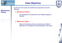 Class Objectives Industrial Engineering By the end of the class, the students are expected to know the following: Maintenance History Maintenance History The progression of maintenance over different stages of histories Maintenance Types Maintenance Types Types of maintenance that are currently used, fields of applications, advantages and disadvantages of each type. 1 Industrial Engineering Maintenance History Maintenance Definition British Standard Glossary of (3811:1993) defined maintenance as: terms Maintenance Types the combination of all technical and administrative actions, including supervision actions, intended to retain an item in, or restore it to, a state in which it can perform a required function. 2 Industrial Engineering Maintenance Definition Maintenance History Maintenance Types maintenance is a set of organised activities that are carried out in order to keep an item in its best operational condition with minimum cost acquired. 3 Industrial Engineering Maintenance Activities Maintenance History Activities of maintenance function could be Maintenance Types either repair or replacement activities, which are necessary for an item to reach its acceptable productivity condition and these activities, should be carried out with a minimum possible cost. 4 Maintenance History Industrial Engineering Maintenance History In the period of pre-World War II, people thought of maintenance as an added cost to the plant which did not increase the value of finished production. Maintenance Types Therefore, the maintenance at that era was restricted to fixing the unit when it breaks because it was the cheapest alternative. 5 Maintenance History Industrial Engineering During and after World War II at the time when the advances of engineering and scientific technology developed, people developed other types of maintenance, which were much cheaper such as preventive maintenance. Maintenance History Maintenance Types In addition, people in this era classified maintenance as a function of the production system. 6 Industrial Engineering Maintenance History Nowadays, Maintenance History increased awareness of such issues as environment safety, quality of product and services makes maintenance one of the most important functions that contribute to the success of the industry. Maintenance Types World-class companies are in continuous need of a very well organised maintenance programme to compete world-wide 7 Maintenance History Industrial Engineering Maintenance History Development of Maintenance Maintenance Types -Term terotechnology introduced. -Recognition of need to present equipment failures. -Models for preventive maintenance developed. -Increased awareness of: -Environment -Safety -Quality -Need for reliable equipment. -Reduction in costs. Fix the equipment when it breaks Time Pre-World War II Post-World War II 1980 Onwards Figure 2.2 Maintenance History (Adapted From Shenoy, Bhadury 1998) 8 Industrial Engineering Maintenance History Maintenance Types Maintenance Objectives Maintenance objectives should be consistent with and subordinate to production goals. The relation between maintenance objectives and production goals is reflected in the action of keeping production machines and facilities in the best possible condition. 9 Industrial Engineering Maintenance Objectives Maintenance History Maximising production or increasing facilities availability at the lowest cost and at the highest quality and safety standards. Maintenance Types Reducing breakdowns and emergency shutdowns. Optimising resources utilisation. Reducing downtime. Improving spares stock control. 10 Industrial Engineering Maintenance History Maintenance Objectives Improving equipment efficiency and reducing scrap rate. Minimising energy usage. Optimising the useful life of equipment. Providing reliable cost and budgetary control. Identifying and implementing cost reductions. Maintenance Types 11 Industrial Engineering Maintenance History Maintenance Objectives PLANT Maximising Production Minimising Energy Usage Maintenance Types Optimising Useful Life of Equipment Providing Budgetary Control Optimising Resources Utilisation M A I N T E N A N C E Reduce Breakdowns Reduce Downtime Improving Equipment Efficiency Improving Inventory Control Implementing Cost Reduction Figure 2.3 Maintenance Objectives 12 Maintenance Types Industrial Engineering Maintenance History Maintenance Types Run to Failure Maintenance (RTF) Preventive Maintenance (PM) Corrective Maintenance (CM) Improvement Maintenance (IM) Predictive Maintenance (PDM) 13 Maintenance Types Industrial Engineering Run to Failure Maintenance (RTF) Maintenance History Maintenance Types The required repair, replacement, or restore action performed on a machine or a facility after the occurrence of a failure in order to bring this machine or facility to at least its minimum acceptable condition. It is the oldest type of maintenance and it is subdivided into two types: Emergency maintenance: it is carried out as fast as possible in order to bring a failed machine or facility to a safe and operationally efficient condition. Breakdown maintenance: it is performed after the occurrence of an advanced considered failure for which advanced provision has been made in the form of repair method, spares, materials, labour and equipment. 14 Maintenance Types Industrial Engineering RTF Disadvantages Maintenance History Maintenance Types Its activities are expensive in terms of both direct and indirect cost. Using this type of maintenance, the occurrence of a failure in a component can cause failures in other components in the same equipment, which leads to low production availability. Its activities are very difficult to plan and schedule in advance. RTF Advantages The failure of a component in a system is unpredictable. The cost of performing run to failure maintenance activities is lower than performing other activities of other types of maintenance. The equipment failure priority is too low