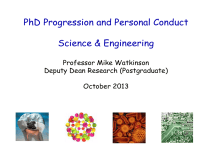 PhD Progression and Personal Conduct Science & Engineering Professor Mike Watkinson Deputy Dean Research (Postgraduate) October 2013 Session Structure 1. The Faculty 2. The Doctoral College 3. Progression through the Degree 4. Advice to new PhD students 5. Ethics Session Structure 1. The Faculty 2. The Doctoral College 3. Progression through the Degree 4. Advice to new PhD students 5. Ethics Vision Our vision for the Faculty is that it should: • Be recognised as one of the leading science and engineering faculties in the UK, contributing in full to Queen Mary’s ambition to be ranked in the top 10 universities in the UK • Have an international reputation as a centre of cutting edge research and education, which attracts the best staff and students, and gives them the freedom to excel • Offer students an education responsive to their personal aspirations and career ambitions, and prepares them for leading roles in society in the future • Have a culture of flexibility and innovation, which embraces diversity, which empowers academic leadership and where excellence is rewarded. The Faculty’s Schools • • • • • Biological & Chemical Sciences Electronic Engineering & Computer Science Engineering and Materials Science Mathematical Sciences Physics & Astronomy Key Facts: S&E • ca. 4,000 students (inc. 655 postgraduates) • 260 academic staff • £75 million annual turnover • Annual research grant income of over £20 million • We have three National Teaching Fellows amongst other awards for innovation in Teaching & Learning Excellent People • Professor Ursula Martin - elected as a Fellow of the Institute of Mathematics awarded a CBE • Professor Yang Hao - awarded a £5m EPSRC platform grant • Professor Peter Kalmus - made an Honorary Fellow of the Institute of Physics • Professor Peter McOwan - awarded the 2011 IET Mountbatten Medal (promoting Computer Science to diverse audiences) • Dr Matt Parker - winner of 2011 Joshua Phillips Award for Innovation in Science Engagement • Dr Akram Alomainy - winner of British Science Association Award Lecture Research Centres within S&E • • • • • • • • • • • • • • • • • • Centre for Life Sciences Theoretical Computer Science Antennas & Electromagnetics Group Qmedia Multimedia & Vision Group Centre for Digital Music Nanovision Centre Materials Research Institute Institute of Bioengineering Centre for Discrete Mathematics Centre for Research in String Theory Particle Physics Research Centre Astronomy Unit Centre for Condensed Matter & Materials Physics River Communities Group Centre for Aquatic & Terrestrial Environments Maths Research Centre Centre for Intelligent Sensing Session Structure 1. The Faculty 2. The Doctoral College 3. Progression through the Degree 4. Advice to new PhD students 5. Ethics Academic Structure Professor Bill Spence Director and Vice Principal for Research Professor Joy Hinson Deputy Director SMD Professor Jon May HSS Directors of Graduate Studies PhD Supervisors Professor Mike Watkinson S&E Support Structure Dr Jo Cordy Centre for Academic and Professional Development Dr Ian Forristal Centre for Academic and Professional Development Dr Tracy Bussoli QMUL Careers Research Student and Postdoc - Networking • We want to encourage networking within and across department boundaries. • School research open days, poster competitions, internal student organised conferences….. • Annual Doctoral College Debate • Cohort days • Three minute thesis……. Session Structure 1. The Faculty 2. The Doctoral College 3. Progression through the Degree 4. Advice to new PhD students 5. Ethics PhD Thesis • The thesis must form a distinct contribution to knowledge of the subject and afford evidence of originality, shown by the discovery of new facts or by the exercise of independent critical power. • Be of a standard to merit publication in whole or in part or in a revised form (for example, as a monograph or as a number of articles in learned journals). • Be the work of the candidate Submitting on time Possible Problems • • • • Slow start Never satisfied Distracted from main line of research Getting a job before thesis complete Monitoring Progression • • • • 4 Month light touch review 9 month review 24 month review 36 months submit thesis • QM target is for 85% submission within 4 years Case study Maria started her PhD three months ago. It hasn’t turned out quite as she expected. Maria’s supervisor is very busy travelling to conferences and she rarely sees him. Although they had a meeting when Maria started and she thought she understood what she was meant to do, she hasn’t had a formal meeting since then and she feels completely lost. Nothing that she tries seems to work out and she feels that she is pursuing dead ends. Her project seems hopeless. She is dreading writing the 9 month report. What should Maria do? Reference: Joy Hinson, 2011 Session Structure 1. The Faculty 2. The Doctoral College 3. Progression through the Degree 4. Advice to new PhD students 5. Ethics Supervisor - Student - Relationship Supervisor’s Responsibilities? Interacting with your Supervisor “One of the hallmarks of outstanding supervisors appeared .... to be that their students felt driven very hard to impress them.” Supervisor - Student - Relationship Student’s Responsibilities? • Talk to your supervisor and get them to give an account what they believe to be your thesis 'challenge‘. Repeat it back to them in your own words. Continue this process until you arrive at an agreed formulation that they accept and you understand. Test out your ability to articulate it on as many people as you can. • Find some of your supervisor's former students. Ask them about how to get the best value from your supervisor. Get the low down on likes and dislikes. Get any hints on how to 'manage' your supervisor. • Ask your supervisor for the best thesis that they have su