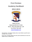 First Christian Academy Handbook 2012-2013 9184 Ford Ave Richmond Hill, GA 31324 Work: (912) 756-3407 ext. 124 Fax: (912) 756-2163 www.fcaeagles.org Vision Statement: First Christian Academy strives to teach children to grow like Jesus in knowledge, service, and wisdom. But Jesus said, “Let the little children come to Me, and do not forbid them; for of such is the kingdom of heaven.” (Matthew 19:14) Table of Contents Letter from the Pastor 3 Introduction, Mission Statement, Vision Statement, Our Philosophy of Education 4 Our Commitment to Parents 5 School Calendar 6 Academic Program 7 Spiritual Program, Electives 8 Admissions Policy, After Care Services 9 Attendance Requirements, Binding Arbitration 10 Bullying, Car Line Procedures, Care of Property, Child Abuse Reporter, Church Attendance 11 Classroom Assignments, Crisis Management, Discipline 12 Discrimination and Harassment, Dismissal, Special Needs, Field Trips, Finances 14 Grading Scale, Hair and Dress Code 15 Health and Wellness 17 Homework 18 Honor Roll, Lost and Found, Lunch Program 19 Media Center-Library, Money, Parent Chaperones, Parent-School Communication 20 Parent-School Relationship, Parent-Teacher Organization (PTO), Parties 21 Pets, Photography and Publicity, Promotion, Re-enrollment, Retention, School Office 22 School Supplies/Textbooks, Solicitation and Distribution 22 Technology 23 Telephones, Testing Program (Standardized), Toys, Withdrawal from School 24 2 First Christian Academy – Student Handbook 2012-2013 Letter From the Pastor On behalf of First Baptist Church Richmond Hill, I would like to take a moment to thank you for entrusting your child’s care and education to First Christian Academy. Proverbs 22:6 says, “Train up a child in the way he should go, and when he is old he will not depart from it.” This verse in scripture is referring to the parental duty of making sure your children are taught the way of the Lord. Our desire is for the school to come alongside you and to help you educate and shape your children in such a way that they have a real connection with God, their Creator, which lasts a lifetime. First Baptist Church understands how important it is for children to have a biblical world view. That’s why we have chosen to partner with FCA. Also, we would love to have you and your family visit our Sunday worship services anytime. We have a traditional service at 8:30 a.m. and a contemporary service at 11:00 a.m. You are also welcome to contact me and set up an appointment to discuss how we might be able to minister to you and your family. I would love to get to know you so that I can pray specifically for you and your family. Again, thank you for entrusting your children’s care and education with FCA and we look forward to serving our Lord together by serving your children. May God richly bless you and your family. In His Service, Scott Speer Pastor- FBC Richmond Hill 3 First Christian Academy – Student Handbook 2012-2013 PURPOSE OF HANDBOOK The purpose of this handbook is to inform parents, students, and prospective students of our policies, procedures, and philosophy in providing the highest quality Christian education for every student who attends First Christian Academy. While no one book could cover every circumstance that we may encounter, this handbook will attempt to cover the main issues that will be of most concern. Any issue not covered in this handbook will be left to the discretion of the administration. We trust that this handbook will provide you with the information that you desire to know. We want every parent and student well informed with our policies. Please pay close attention to all of the information in the handbook. MISSION STATEMENT The purpose of First Christian Academy is to glorify God by developing the active and creative thinking of His children. We stress the total development of each child: spiritual, moral, intellectual, social, emotional, and physical. The role of First Christian Academy is to help each child come into confident possession of his or her God-given talents. We assist parents in developing responsible young leaders who have courage to act on their beliefs and have compassion for others. We engage with challenging academics and scripture so that our pupils will become active citizens and responsible stewards of our world by serving Jesus Christ. VISION STATEMENT First Christian Academy strives to teach children to grow like Jesus in knowledge, service and wisdom. OUR PHILOSOPHY OF EDUCATION We understand that wisdom and knowledge come from God. Man’s education is complete only when God and His word are at the center of all learning. “The fear of the Lord is the beginning of knowledge” (Proverbs 1:7). As Christian educators, we are concerned with the total person: the intellectual, spiritual, physical, and social being. We believe the needs of the total person can only be met as approached from a Christian or Biblical philosophy. “Yet for us there is but one God, the Father, from whom all things came and for whom we live; and there is but one Lord, Jesus Christ, through whom all things came and through whom we live” (I Corinthians 8:6). There is much responsibility upon us to train our students in the right way. The Bible tells us in Proverbs 22:6 to “Start children off on the way they should go, and even when they are old they will not turn from it.” We want to provide the best academic training possible while also developing a Christ-like character in every student. Christ must be at the center of all our endeavors. Realizing this, we know He expects our best in all that we do. We will continually strive for excellence in every area because our desire is to bring honor and glory to God in all things. We will provide the best textbooks that are available while remembering that God’s word is the most important book our students will ever read. Knowledge of the word of God will instill into our students the desire to do their 