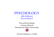 PSYCHOLOGY (8th Edition) David Myers PowerPoint Slides Aneeq Ahmad Henderson State University Worth Publishers, © 2006 1 Nature, Nurture, and Human Diversity Chapter 3 2 Nature, Nurture, and Human Diversity Behavior Genetics: Predicting Individual Differences Genes: Our Codes for Life Twin Studies Temperament Studies Heritability Gene-Environment Interaction The New Frontier: Molecular Genetics 3 Nature, Nurture, and Human Diversity Evolutionary Psychology: Understanding Human Nature Natural Selection An Evolutionary Explanation of Human Sexuality Critiquing the Evolutionary Perspective 4 Nature, Nurture, and Human Diversity Parents and Peers Parents and Early Experiences Peer Influence Cultural Influences Variations Across Cultures Culture and the Self 5 Nature, Nurture, and Human Diversity Cultural Influences Culture and Child-Rearing Developmental Similarities Across Groups Gender Development Gender Similarities and Differences 6 Nature, Nurture, and Human Diversity Gender Development The Nature of Gender The Nurture of Gender Reflections on Nature and Nurture 7 Nature, Nurture, and Human Diversity Similarities Differences Genes: Same set of chromosomes Genes: Genetic anomalies may make us different Biology: Organs and body functions same Biology: May change during development Brain: Same brain architecture Brain: Asymmetry of brain across genders Behaviors: Speak language Behavior: Speak different languages 8 Behavior Genetics: Predicting Individual Differences Behavior Geneticists study our differences and weigh the relative effects of heredity and environment. 9 Genes: Our Codes for Life Chromosomes containing DNA (deoxyribonucleic acid) are situated in the nucleus of a cell. 10 Genes: Our Codes for Life Segments within DNA consist of genes that make proteins to determine our development. https://w ww.youtu be.com/w atch?v=z wibgNGe 4aY What is DNA and how it 11 works Genome Genome is the set of complete instructions for making an organism, containing all the genes in that organism. Thus, the human genome makes us human, and the genome for drosophila makes it a common house fly. 12 Twin Biology Studying the effects of heredity and environment on two sets of twins, identical and fraternal, has come in handy. 13 Twins and Procedures Behavior geneticists’ study effects of shared and unique environments on total or partial genetic makeup. 14 Separated Twins A number of studies compared identical twins raised separately from birth, or close thereafter, and found numerous similarities. Separated Twins Personality, Intelligence Abilities, Attitudes Interests, Fears Brain Waves, Heart Rate 15 Separated Twins Critics of separated twin studies note that such similarities can be found between strangers. Researchers point out that differences between fraternal twins are greater than identical twins. Bob Sacha 16 Youtube: Identical Separation • http://www.youtube.com/watch?v=1gwnzW 4jOMI 17 Adoption Studies Adoption studies, as opposed to twin studies, suggest that adoptees (who may be biologically unrelated) tend to be different from their adoptive parents and siblings. 18 Adoptive Studies Adoptive studies strongly point to the simple fact that biologically related children turn out to be different in a family. So investigators ask: Do siblings have differing experiences? Do siblings, despite sharing half of their genes, have different combinations of the other half of their genes? Ultimate question: Does parenting have an effect? 19 Parenting Parenting does have an effect on biologically related and unrelated children. Parenting Influences children’s Attitudes, Values Manners, Beliefs Faith, Politics 20 Temperament Studies Temperament refers to a person’s stable emotional reactivity and intensity. Identical twins express similar temperaments, suggesting heredity predisposes temperament. 21 Heritability Heritability refers to the extent to which the differences among people are attributable to genes. 22 Group Differences If genetic influences help explain individual diversity in traits, can the same be said about group differences? Not necessarily. Individual differences in weight and height are heritable and yet nutritional influences have made westerners heavier and taller than their ancestors were a century ago. 23 Nature and Nurture Some human traits are fixed, such as having two eyes. However, most psychological traits are liable to change with environmental experience. Genes provide choices for the organism to change its form or traits when environmental variables change. Therefore, genes are pliable or self-regulating. 24 Gene-Environment Interaction Genes can influence traits which affect responses, and environment can affect gene activity. For example, a genetic predisposition that makes a child restless and hyperactive evokes an angry response from his parents. A stressful environment can trigger genes to manufacture neurotransmitters leading to depression. EPI Genetics http://www.youtube.com/watch?v=Xjq5eEslJhw 25 Gene-Environment Interaction Genes and environment affect our traits individually, but more important are their interactive effects. Alessia Pierdomenico/Reuters/Corbis Rex Features People respond differently to Rowan Atkinson (Mr. Bean) than Orlando bloom. 26 The New Frontier: Molecular Genetics Molecular genetics is a branch extension of behavior genetics that asks the question, “Do genes influence behavior?” 27 Molecular Genetics: Promises and Perils Molecular geneticists are trying to identify genes that put people at risk for disorders. With this kind of knowledge, parents can decide to abort pregnancies in which the fetus is suspected of having such disorders. However, this opens up a real concern regarding ethical issues involving such choices. 28 Evolutionary Psychology: Understanding Human Nature Molecular genetics studies why we as organisms are distinct. Evolutionary psychology studies why we as humans are alike. In particular, it studies the evolut