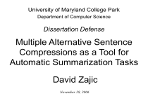 University of Maryland College Park Department of Computer Science Dissertation Defense Multiple Alternative Sentence Compressions as a Tool for Automatic Summarization Tasks David Zajic November 28, 2006 Intuition • A newspaper editor was found dead in a hotel room in this Pacific resort city a day after his paper ran articles about organized crime and corruption in the city government. The body of the editor, Misael Tamayo Hernández, of the daily El Despertar de la Costa, was found early Friday with his hands tied behind his back in a room at the Venus Motel… Intuition • A newspaper editor was found dead in a hotel room in this Pacific resort city a day after his paper ran articles about organized crime and corruption in the city government. • Newspaper editor found dead in Pacific resort city Intuition • A newspaper editor was found dead in a hotel room in this Pacific resort city a day after his paper ran articles about organized crime and corruption in the city government. • Paper ran articles about corruption in government Intuition • A newspaper editor was found dead in a hotel room in this Pacific resort city a day after his paper ran articles about organized crime and corruption in the city government. • Hernández, Zihuatanjo: Newspaper editor found dead in Pacific resort city Intuition • A newspaper editor was found dead in a hotel room in this Pacific resort city a day after his paper ran articles about organized crime and corruption in the city government. • Newspaper Editor Killed in Mexico – (A) Newspaper Editor (was) killed in Mexico Talk Roadmap • Introduction • Automatic Summarization under MASC framework – HMM Hedge, Trimmer, Topiary – Single Document, Multi-document – Experimental evidence supporting hypotheses • Review of Evaluations • Conclusion • Future Work Introduction • Automatic Summarization – Distillation of important information from a source into an abridged form – Extractive Summarization: select sentences with important content from the document – Limitations • Sentences contain mixture of relevant, nonrelevant information • Sentences partially redundant to rest of summary Introduction • Multiple Alternative Sentence Compressions (MASC) – Framework for Automatic Text Summarization – Generation of many sentence compressions of source sentences to serve as candidates – Select from candidates using weighted features to generate summary – Environment for testing hypotheses Introduction • Hypotheses – Extractive summarization systems can create better summaries using larger pool of compressed candidates – Sentence selectors choose better summary candidates using larger sets of features – For Headline Generation, combination of fluent text and topics better than either alone Introduction • Sentence Compression – HMM Hedge – Trimmer – Topiary • Sentence Selection – Lead Sentence for Headline Generation – Maximal Marginal Relevance for Multidocument Summarization Summarization Tasks • Single Document Summarization – – – – Very short: Headline Generation Single sentence 75 characters DUC2002, 2003, 2004 • Query-focused Multi-Document Summarization – Multiple sentences – 100 – 250 words – DUC2005, 2006 Headline Generation • Newspaper Headlines – Natural example of human summarization – Three criteria for a good headline: • Summarize a story • Make people want to read it • Fit in specified space – Headlinese: compressed form of English Introduction • Headline Types: Eye-Catcher • Indicative • Informative • Under God Under Fire • Pledge of Allegiance • U.S. Court Decides Pledge of Allegiance Unconstitutional Talk Roadmap • Introduction • Automatic Summarization under MASC framework – HMM Hedge, Trimmer, Topiary – Single Document, Multi-document – Experimental evidence supporting hypotheses • Review of Evaluations • Conclusion • Future Work General Architecture Document Compression HMM Hedge Trimmer Topiary Candidates Selection Summary Lead Sentence Selection Maximal Marginal Relevance Sentence Compression • Selecting words in order from a sentence – Or window of words • Human Studies – Humans can almost always do this for written news – Bias for words from within a single sentence – Bias for words early in document Sentence Compression • Two implementations of select-words-inorder – Statistical Method: HMM Hedge (Headline Generation) – Syntactic Method: Trimmer Talk Roadmap • Introduction • Automatic Summarization under MASC framework – HMM Hedge, Trimmer, Topiary – Single Document, Multi-document – Experimental evidence supporting hypotheses • Review of Evaluations • Conclusion • Future Work HMM Hedge Architecture Single Compression Headline Language Model General Language Model HMM Hedge Document Part of Speech Tagger Verb Tags Selection Summary HMM Hedge Noisy Channel Model • • • • Underlying method: select words in order Sentences are observed data Headlines are unobserved data Noisy channel adds words to headlines to create sentences President signed legislation On Tuesday the President signed the controversial legislation at a private ceremony HMM Hedge Noisy Channel Model • Probability of Headline estimated with bigram model of Headlinese • Probability of observed Sentence given unobserved Headline (the channel model) estimated by unigram model of General English HMM Hedge • Decoding parameters to mimic Headlines – Groups of contiguous words, clumpiness – Size of gaps between words, gappiness – Sentence position of words – Require verb HMM Hedge • Adaptation to Multi-candidate compression • Finds the 5 most likely headlines for summary lengths 5 to 15 words of document sentences Automatic Evaluation • Recall Oriented Understudy of Gisting Evaluation (Rouge) – Rouge Recall: ratio of matching candidate n-gram count to reference n-gram count – Rouge Precis
