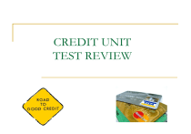 CREDIT UNIT TEST REVIEW CREDIT TEST REVIEW _________________ is an arrangement to receive cash, goods, or services now and pay for them in the future. CREDIT When credit is used for personal needs it is referred to as _________ ________. CONSUMER CREDIT CREDIT TEST REVIEW An entity that that lends money is called an _______________. CREDITOR List two great reasons to use credit Save money Purchase items that we cannot afford on a cash basis CREDIT TEST REVIEW What are three factors to consider before using credit? Is there a down payment? Do you want to use savings instead of credit? Can you afford the item? Could you use the credit in a better way? Can you put off buying the item for a while? What are the opportunity costs of postponing the purchase? What are the costs of using credit? CREDIT TEST REVIEW What are three advantages to using credit? Allows you to enjoy goods and services now and pay for them later. Safer than cash Easy to track spending Rewards and perks etc… CREDIT TEST REVIEW A one time loan that will be paid back over a specified period of time, in payments of equal amounts. CLOSED END CREDIT List some examples of items that are usually purchased with closed-end credit: HOUSES, VEHICLES, FURNITURE CREDIT TEST REVIEW Used for the purchase of merchandise, typically requires a down payment with remaining balance of loan being paid in installments. INSTALLMENT SALES CREDIT Money borrowed for personal reasons, does not necessarily require a down payment, balance is paid in installments. INSTALLMENT CASH CREDIT A loan that must be paid in full, by a specified day, typically within 30-90 days. SINGLE LUMP-SUM CREDIT CREDIT TEST REVIEW Credit as a loan with a certain limit on the amount of money you can borrow for a variety of goods and services. OPEN END CREDIT Examples of Open-End Credit: VISA, MASTERCARD, AMERICAN EXPRESS CREDIT TEST REVIEW After your application for credit is approved, you typically can begin to make purchases as long as you do not exceed the LINE OF CREDIT Payment amounts, dates, applicable charges, and all other pertinent information regarding your account will be determined by the TERMS OF AGREEMENT CREDIT TEST REVIEW Name two sources of commercial credit: Commercial Bank Credit Union Retail Stores etc… True or False: The average credit cardholder has more than six cards. TRUE CREDIT TEST REVIEW Many credit card companies offer a __________________, a time period during which no finance charges will be added to your account. GRACE PERIOD The total dollar amount you pay to use credit. FINANCE CHARGE CREDIT TEST REVIEW True or False: Generally, if the balance is paid in full prior to the due date, there will be no finance charge to pay. TRUE How are debit cards different than credit cards? Debit cards utilize cash in your checking account. Credit cards utilize borrowed money! CREDIT TEST REVIEW Method by which most credit cards calculate the finance charges for the period. It is found by adding each day’s balance and then dividing the total number of days in a billing cycle. AVERAGE DAILY BALANCE The cost of credit on a yearly basis. It is expressed as a percentage. ANNUAL PERCENTAGE RATE (APR) CREDIT TEST REVIEW The process of moving unpaid credit card debt from one issuer to another. Often comes with a fee of some form. BALANCE TRANSFER A charge by the lender for using the credit card to obtain cash. Can be a flat rate or percentage (2%/$10). CASH ADVANCE FEE CREDIT TEST REVIEW The written statement provided to the cardholder outlining the terms and conditions. Required by Federal Reserve regulations. Must include the APR, monthly minimum payments formula, annual fee and cardholder’s rights in billing disputes. CARDHOLDER AGREEMENT CREDIT TEST REVIEW The minimum amount a cardholder can pay to keep the account from going into default. MINIMUM PAYMENT When a potential customer has passed a preliminary credit-information screening. Does not guarantee a line of credit. PRE-APPROVED CREDIT TEST REVIEW What are some ways you can apply for a credit card? In person, at a financial institution In person, through a promotional event like a sporting event or welcome week on a college campus By telephone Traditional mail Online CREDIT TEST REVIEW Outline of all of the specifics of your relationship with the creditor. TERMS AND CONDITIONS What are three things that you could find in your terms and conditions? Finance charges Due dates Specific lending policies Much, much more! CREDIT TEST REVIEW What are the 5 C’s: CHARACTER, CAPACITY, CAPITAL, COLLATERAL AND CONDITIONS. Which “C” attempts to measure what type of person you are when it comes to paying your bills? CHARACTER CREDIT TEST REVIEW How can creditors try to measure your character? References (Both personal and professional) Criminal background check Have you used credit before? How long have you lived at your current address? How long have you held your current job? CREDIT TEST REVIEW What “C” attempts to measure how much debt you can take on? CAPICITY What questions can a creditor ask to try to assess your capacity? What is your job and how much is your salary? Do you have other sources of income? What are your current debts? CREDIT TEST REVIEW A common ratio used to calculate capacity: DEBT PAYMENTS-TO-INCOME RATIO This ratio is calculated as follows: Total Monthly Debt (not inc. housing) Monthly Net Income It is highly recommended to keep this ratio under ????? 20% CREDIT TEST REVIEW Stuart just received his first job offer after graduating from beauty school. His expected monthly income is $2,500. The only debt payments he has are school loan payments of $375 a month. What is his Debt Payments-to-Income Ratio? Debt Payments ÷ Monthly Net Income $375 ÷ $2,500 = .15 15% CREDIT TEST REVIEW Any item of value that you own ASSET Examples of Assets Cash Property Personal possessions Investments CREDIT TEST REVIEW Which “C” is represented by taking the total value of your assets and subtr