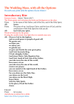 The Wedding Mass, with all the Options (In each case, print only the option of your choice) Introductory Rite Entrance hymn: (insert “Hymn title”) The Priest greets and welcomes the bride and bridegroom at the altar. Priest: In the name of the Father, and of the Son, and of the Holy Spirit. All: Amen. Priest: The grace of our Lord Jesus Christ, and the love of God, and the communion of the Holy Spirit be with you all. All: And with your spirit. Words of welcome by the priest. If using the candle ritual, they light the two outside ones now. All: Glory to God in the highest, and on earth peace to people of good will. We praise you, we bless you, we adore you, we glorify you, we give you thanks for your great glory, Lord God, heavenly King, O God, almighty Father. Lord Jesus Christ, Only Begotten Son, Lord God, Lamb of God, Son of the Father, you take away the sins of the world, have mercy on us; you take away the sins of the world, receive our prayer; you are seated at the right hand of the Father, have mercy on us. For you alone are the Holy One, you alone are the Lord, you alone are the Most High, Jesus Christ, with the Holy Spirit, in the glory of God the Father. Amen. COLLECT Priest: Let us pray. And all pray in silence for a while. Select one of the 6 prayers below option 1 Priest: All: option 2 Priest: All: option 3 Priest: All: option 4 Priest: All: option 5 Priest: Hear our prayers, O Lord, and in your kindness uphold what you have established for the increase of the human race, so that the union you have created may be kept safe by your assistance. Through our Lord Jesus Christ, your Son, who lives and reigns with you in the unity of the Holy Spirit, one God, for ever and ever. Amen. O God, who in creating the human race willed that man and wife should be one, join, we pray, in a bond of inseparable love these your servants who are to be united in the covenant of Marriage, so that, as you make their love fruitful, they may become, by your grace, witnesses to charity itself. Through our Lord Jesus Christ, your Son, who lives and reigns with you in the unity of the Holy Spirit, one God, for ever and ever. Amen. Hear our prayers, O Lord, and in your kindness pour out your grace on these your servants (N. and N.), that, coming together before your altar, they may be confirmed in love for one another. Through our Lord Jesus Christ, your Son, who lives and reigns with you in the unity of the Holy Spirit, one God, for ever and ever. Amen. O God, who consecrated the bond of Marriage by so great a mystery that in the wedding covenant you foreshadow the Sacrament of Christ and his Church, grant, we pray, to these your servants, that what they receive in faith they may live out in deeds. Through our Lord Jesus Christ, your Son, who lives and reigns with you in the unity of the Holy Spirit, one God, for ever and ever. Amen. Grant, we pray, almighty God, that these your servants, All: option 6 Priest: All: now to be joined by the Sacrament of Matrimony, may grow in the faith they profess and enrich your Church with faithful offspring. Through our Lord Jesus Christ, your Son, who lives and reigns with you in the unity of the Holy Spirit, one God, for ever and ever. Amen. O God, who since the beginning of the world have blessed the increase of offspring, show favour to our supplications and pour forth the help of your blessing on these your servants (N. and N.), so that in the union of Marriage they may be bound together in mutual affection, in likeness of mind, and in shared holiness. Through our Lord Jesus Christ, your Son, who lives and reigns with you in the unity of the Holy Spirit, one God, for ever and ever. Amen. The Liturgy of the Word First Reading Insert your chosen text from Insert text of the first reading Reader: The word of the Lord. All: Thanks be to God. Responsorial Psalm (usually sung) If read, insert text of the Psalm Second Reading Insert your chosen text from Insert text of the second reading Reader: The word of the Lord. All: Thanks be to God. Alleluia (usually sung) Priest: The Lord be with you. All: And with your spirit. Priest: A reading from the holy Gospel according to N.. All: Glory to you, O Lord. Insert your chosen text from Insert text of the Gospel Priest: The Gospel of the Lord. All: Praise to you, Lord Jesus Christ. Homily The Rite of Marriage The Priest now addresses the bride and bridegroom,, using one of the formulas below or similar words. ADDRESS Select one of the forms below 1 Priest: Dear children of God, you have come to this church so that the Lord may seal your love in the presence of the priest and this community. Christian marriage is a sacred union which enriches natural love. It binds those who enter it to be faithful to each other for ever; it creates between them a bond that endures for life and cannot be broken; it demands that they love and honour each other, that they accept from God the children he may give them, and bring them up in his love. To help them in their marriage the husband and wife receive the life-long grace of the sacrament. Priest: Is this your understanding of marriage? Both: It is. 2 Priest: Dear children of God, you have come to this church so that the Lord may seal your love in the presence of the priest and this community. Christ blesses this love. He has already consecrated you in baptism; now, by a special sacrament, he strengthens you to fulfil the duties of your married live. N. and N., you are about to celebrate this sacrament. Have you come here of your own free will and choice and without compulsion to marry each other? Both: We have. Priest: Will you love and honour each other in marriage all the days of your life? Both: We will. Priest: Are you willing to accept with love the children God may send you and bring them up in accordance with the law of Christ and his Church? Both: We are. 3 Priest: Dear children of God, you have come today to pledge your love before God and before the Church here present in the 