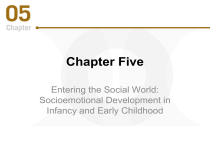 Chapter Five Entering the Social World: Socioemotional Development in Infancy and Early Childhood 5.1 Trust & Attachment: Learning Objectives • What are Erikson’s first three stages of psychosocial development? • How do infants form emotional attachments to mother, father, and other significant people in their lives? • What are the different varieties of attachment relationships, how do they arise, and what are their consequences? • Is attachment jeopardized when parents of infants and young children are employed outside of the home? Erikson’s Stages of Early Psychosocial Development • Each of 8 stages involves a unique challenge – Successful resolution results in a particular strength of psychosocial development – Failure may stunt development, the relevant strength, and impede resolution of future challenges • Three of his stages and strengths are relevant to infancy and the preschool years Erikson’s Stages (cont’d) • Basic trust vs. mistrust (infancy) – Infants depend on caregivers to meet their needs and provide comfort – If needs are not met, the child develops wariness and a lack of comfort – When caregivers responsively and consistently meet these needs, the child develops a basic sense of trust and openness – Hope: the strength involving openness to new experience, tempered by wariness that discomfort or danger may arise; acquired with a proper balance of trust and mistrust Erikson’s Stages (cont’d) • Autonomy vs. doubt (1-3 years) – Children realize they can have control over their own actions and act independently – If autonomy is not achieved, children can feel ashamed of their capabilities and start to doubt them – Will: a strength involving children’s knowledge that they can act on their world intentionally but within limits; arises from a blend of autonomy, shame, and doubt Erikson’s Stages (cont’d) • Initiative vs. guilt (3-5 years) – Guilt can arise when taking initiative places children in conflict with others or when they pursue their own ambitions without cooperating with others – Initiative may develop when children successfully play with different roles (e.g., as a parent) and explore possibilities for themselves – Purpose: a strength involving balance between individual initiative and a willingness to cooperate with others The Growth of Attachment • Attachment to caregivers is a critical aspect of Erikson’s first stage (basic trust vs. mistrust) • Evolutionary psychology: many human behaviors are successful adaptations to the environment – Humans are social beings who also form parent-child attachments – These are adaptations promoting survival to the reproductive years, thereby sustaining the species’ existence The Growth of Attachment (cont’d) • Attachment: an enduring socioemotional relationship with an adult – Ensures survival – Likeliest when the caregiver is responsive and caring – Often formed with mothers, because they usually are primary caregivers – Can occur with any responsive and caring person • Bowlby proposed four stages of attachment Steps Toward Attachment • Preattachment stage (birth to 6-8 weeks) – Infants rapidly learn to recognize their mothers – Infants display many behaviors that elicit adult caregiving (e.g., crying, smiling) • Attachment in the making (6-8 weeks to 6-8 months) – Infants behave differently toward familiar versus unfamiliar adults – Infants are more easily consoled by familiar adults and act happier in their presence Steps Toward Attachment (cont’d) • True attachment (6-8 months to 18 months) – Infants have singled out a “special” adult as their secure and stable socioemotional base • Reciprocal relationships (18 months on) – Toddlers act as true partners in the relationship, taking initiatives in interaction – Can anticipate that parents will return after a separation, which benefits coping – Toddlers begin to understands parents’ feelings and goals • May use these to guide their own behavior (e.g., social referencing) Father-Infant Relationships • Attachment to fathers tends to follow that with mothers • Fathers tend to spend more time playing with children than taking care of them • Fathers play with children differently than mothers (more rough and tumble) – Mothers more often read to children and talk with them • Children tend to seek out the father for a playmate; mothers are preferred for comfort Forms of Attachment • Ainsworth’s Strange Situation paradigm – Three phases (~3 minutes each) • Child and mother first occupy an unfamiliar room filled with toys • Mother leaves room momentarily • Mother then returns to room – Observe child’s reactions during each – Classified four types of attachment • Three were insecure types (least frequent) • One is secure (frequent) Four Types of Attachment Relationships • Secure attachment (60-65%): baby may or may not cry upon separation; wants to be with mom upon her return and stops crying • Avoidant attachment (20%): baby not upset by separation; ignores or looks away when mom returns • Resistant attachment (10-15%): separation upsets baby; remains upset after mom’s return and is difficult to console • Disorganized attachment (5-10%): separation and return confuse the baby; reacts in contradictory ways (e.g., seeking proximity to the returned mom, but not looking at her) Strange Situation Paradigm Criticisms • Cultures may vary in what they consider appropriate responses to separation and reunion; ergo, we cannot rely on these alone • Attachment Q-set: observers watch moms and children interact at home, then rate numerous attachment-related behaviors to form a total score – Scores from Strange Situation and Q-set correlate highly and both predict later quality of relationship (e.g., insecurely attached infants later report anger with parents and low intimacy with them) Consequences of Attachment • Environmental insta