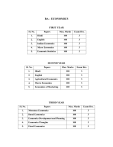 BA - ECONOMICS FIRST YEAR Sl. No. Papers Max. Marks Exam Hrs. 1. Hindi 100 3 2. English 100 3 3. Indian Economics 100 3 4. Micro Economics 100 3 5. Economic Statistics 100 3 SECOND YEAR Sl. No. Papers Max. Marks Exam Hrs. 1. Hindi 100 3 2. English 100 3 3. Agricultural Economics 100 3 4. Macro Economics 100 3 5. Economics of Marketing 100 3 THIRD YEAR Sl. No. Papers Max. Marks Exam Hrs. 1. Monetary Economics 100 3 2. Rural Economics 100 3 3. Economics Development and Planning 100 3 4. Economics Thoughts 100 3 5. Fiscal Economics 100 3 FIRST YEAR Paper – 1 Hindi Paper – 2 ENGLISH PAPER – I Detailed Text PROSE 1. In Prison – Jawaharlal Nehru 2. What is Science? – George Orwell 3. On Marriages – Nirad Chaudari 4. The Luncheon – N. Somerset Maugham 5. The Mourners – V. S. Naipaul 6. The Plane Crash – Juliane Koepcke 7. Better Late – R.K. Narayan POETRY 1. Polonius’ Advice t his Son – William Shakespeare 2. Every Town a Home Town - Kaniyan Purkunran 3. The Village Schoolmaster – Oliver Goldsmith 4. The Solitary Reaper – William Wordsworth 5. On his Blindness – John Milton 6. The Tyger – William Blake Non-Detailed Text : THE GIFTS AND OTHER STORIES abridged and simplified by Anthony Toyne – Oxford University Press, 1997. The following stories 1. The Gifts – O. Henry 2. The Two Friends – Guy de Maupassant 3. The Bear Hunt – Leo Tolstoy 4. The Goblins and the Grave Digger – Charles Dickens 5. The Nightingale and the Rose – Oscar Wilde GRAMMER 1. Articles and Prepositions 2. Infinitives and Gerunds 3. Five basic sentence patterns (SV SVC, SVO, SVOO, SVOC(A)) 4. Arranging the component parts so as to form a sentence 5. Language work at the end of all lessons 6. Language work at the end of all lessons 7. Question Tag, Active and Passive Voice 8. Degrees of Comparison COMPOSITION 1. Letter Writing (Formal and Informal) 2. Developing the hints 3. Comprehension 4. Writing Telegram 5. Completion of a passage 6. Precis Writing PAPER – III INDIAN ECONOMICS UNIT – I: AGRICULTURAL ECONOMY Agriculture in the National Economy - Causes for low Agricultural Productivity Agricultural Marketing - Food Problem - Green Revolution. UNIT – II: INDUSTRIAL ECONOMY Large scale industries (Iron and Steel, Cotton, Sugar) - Industrial Policy - New Economic Policy - Privatization –Liberalization. NIT - III: DEMOGRAPHY Population problem and policy – unemployment: Nature, Causes and Remedies – poverty: Nature, Causes, Measurement and Eradication – National Income – National Income: Trends, Estimation and Limitation. UNIT – IV: FOREIGN TRADE Foreign Trade: Importance, Volume, Composition and Direction – Export and Import Policy – Balance of Payments: Disequilibrium, Causes and Remedies. UNIT – V: PLANNING Economic Planning – Objectives – Strategy – Four decades of planning in India - Ninth Plan – Financial Resources for the plans – Public Sector in Indian Planning. TEXT BOOK: Ruddar Dot and K.P.M. Sundaram : Indian Economy PAPER – IV MICRO ECONOMICS UNIT – I: BASIC CONCEPTS AND PROBLEMS Definition and Scope of Economics: Smith, Marshall and Robbins – Approaches to Economic Analysis: Micro and Macro Analysis – Introduction and Deductive Methods – Nature of Economic laws. UNIT – II: CARDINAL UTILITY ANALYSIS Law of diminishing marginal utility – law of Equi – Marginal Utility – Law of Demand: Downward sloping curve – Exceptional demand curve – Conditions of demand – Types of demand – Extension and Contraction Vs decrease in demand – Elasticity of demand: Types and Measurement. UNIT – III: ORDINAL UTILITY ANALYSIS Indifference curve: Properties – Consumer’s Equilibrium – Income Effect, Price Effect and Substitution Effect –Indifference curve technique Vs Marshallian Utility Analysis – Consumer’s surplus - Uses of indifference curve. UNIT – IV: FACTOR ANALYSIS Factors of Production - Land: Meaning and importance – Labour: Meaning, Peculiarities, efficiency, division of Labour – Theories of Population – Capital: Meaning, Types – Capital Formation – Functions of an Entrepreneur. UNIT – V: SUPPLY ANALYSIS Production possibility Curve – Production Function – Economics of scale: Internal and External Economics – Law of Variable proportions – Returns to scale – Producer’s equilibrium – Concept of Cost: Relation between total, average cost, short run and long run cost – law of supply. TEXT BOOK: Dr. R. CAUVERY et al- MICRO ECONOMIC THEORY. PAPER – V ECONOMIC STATISTICS UNIT – I: Statistics – Meaning – Definition - Function and Scope of Statistics – Methods of Collection Data – Classification of Data: Objective and Types – Tabulation – Frequency Distribution – Sampling and Survey. UNIT – II: Types of Bar Diagrams and Pie Diagrams – Graphs of Frequency Distribution: Histogram, Frequency Polygon, and Smoothed Frequency Curve – Orgives – Lorenz Curve. UNIT – III : Mean – Median – Mode – Measures of Dispersion: Range, Mean Deviation, Standard Deviation, Variance and Coefficient of Variation – Concepts of Skew ness and Kurtosis. UNIT IV Correction- types of correction-uses, measures of correction. Lineal sample correctionkarl pearson’s coefficietn of correlation- rank correlation. Simple regression analysis. Regressi9n equations. Relationship between regression coefficient and correlation coefficient UNIT V Index numbers. Definition of index numbers, uses problems, methods of construction of index numbers. Test of index numbers. Chain and fixed base index cost of luring index number. TEXT BOOK: Bhagavathi and Pillai : Statistics S.P Gupta : Statistics SECOND YEAR Paper – VI Hindi Paper – VII ENGLISH PAPER – II Detailed Text PROSE 8. A Visit to India – Julian Huxley 9. University Days – James Thurber 10. I Have a Dream – Martin Luther King 11. The Story Teller – H.H. Munro (Saki) 12. George Bernard Shaw – Bertrand Russel 13. Only then shall w