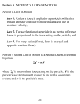 Lecture 5. NEWTON’S LAWS OF MOTION Newton’s Laws of Motion Law 1. Unless a force is applied to a particle it will either remain at rest or continue to move in a straight line at constant velocity, Law 2. The acceleration of a particle in an inertial reference frame is proportional to the force acting on the particle, and Law 3. For every action (force), there is an equal and opposite reaction (force). Newton’s second Law of Motion is a Second-Order Differential Equation where is the resultant force acting on the particle, is the particle’s acceleration with respect to an inertial coordinate system, and m is the particle’s mass. 60 Figure 3.1 A car located in the X, Y (inertial) system by IX and a particle located in the x, y system by ix. A particle in the car can be located by The equation of motion, is correct. However, because the x, y system is not inertial. 61 X, Y,Z Inertial coordinate system 3-D Version of Newton’s 2nd Law of Motion Using the Energy-integral substitution 62 Multiplying the equations by dX, dY, dZ , respectively, and adding gives This “work-energy” equation is an integrated form of Newton’s second law of motion . The expressions are fully equivalent and are not independent. The central task of dynamics is deriving equations of motion for particles and rigid bodies using either Newton’s second law of motion or the work-energy equation. 63 Constant Acceleration: Free-Fall of a Particle Without Drag Figure 3.3 Particle acted on by its weight and located by Y (left) and (right) Equation of Motion using Y Let us consider rewriting Newton’s law in terms of the new coordinate . Note that . From the free-body diagram, the equation of motion using is This equation conveys the same physical message as the differential equation for Y ; namely, the particle has a constant 64 acceleration downwards of g, the acceleration of gravity. Time Solution for the D. Eq. of motion for Y, Integrating once with respect to time gives where is the initial (time second time w.r.t. time gives ) velocity. Integrating a where is the initial (time are the “initial conditions.” ) position. and The solution can also be developed more formally via the following steps: a. Solve the homogeneous equation (obtained by setting the right-hand side to zero) with the solution as 65 b. Determine a particular solution to the original equation that satisfies the right-hand side. By inspection, the right-hand side is satisfied by the particular solution . Substituting this result nets , and The complete solution is the sum of the particular and homogeneous solution as The constants A and B are solved in terms of the initial conditions starting with Continuing, netting 66 and the complete solution — satisfying the initial conditions — is which duplicates our original results. Engineering Analysis Task: If the particle is released from rest ( ) at , how fast will it be going when it hits the ground ( )? Solution a. When the particle hits the ground at time , Solving for , 67 Solving for , Solution b. Using the energy-integral substitution, changes the differential equation to Multiplying through by dY and integrating gives Since , is Solution c. There is no energy dissipation; hence, we can work directly from the conservation of mechanical energy equation, 68 where is the kinetic energy. The potential energy of the particle is its weight w times the vertical distance above a horizontal datum. Choosing ground as datum gives and The weight is a conservative force, and in the differential equation is , pointing in the direction. Strictly speaking, a conservative force is defined as a force that is the negative of its gradient with respect to a potential function V. For this simple example, with Hence (as noted above) the potential energy function for gravity is the weight times the distance above a datum plane; i.e., 69 Acceleration as a Function of Displacement: Spring Forces Figure 3.5 (a) Particle being held prior to release, (b) Y coordinate defining m’s position below the release point, ( c) Spring reaction force Particle suspended by a spring and acted on by its weight. The spring is undeflected at ; i.e., (zero spring force). The spring force has a sign that is the opposite from the displacement Y, and it acts to restore the particle to the position . 70 Figure 3.5 (d) Free-body diagram for , (e) Free-body diagram for From the free-body diagram of figure 3.5d, Newton’s second law of motion gives the differential equation of motion, (3.13) Figure 3.5d-e shows that for 71 and Deriving the Equation of Motion for Motion about Equilibrium Figure 3.5 (a) Mass m in equilibrium, (b) Equilibrium freebody diagram, (c) General-position free-body diagram Figure 3.5c applies for m displaced the distance y below the equilibrium point. The additional spring displacement generates the spring reaction force , and yields the following equation of motion. (3.14) 72 This result holds for a linear spring and shows that w is eliminated, leaving only the perturbed spring force ky. MORE EQUILIBRIUM, 1 MASS - 2 SPRINGS Figure 3.6 (a) Equilibrium, (b) Equilibrium with spring 1 in tension and spring 2 in compression, (c) Equilibrium with both springs in tension, (d) Equilibrium with both springs in compression 73 Spring 1 in tension, spring 2 in compression Figure 3.6b, equilibrium starting from undeflected springs: Figure 3.6c, Equilibrium with both springs in tension, Figure 3.6c, Equilibrium with both springs in compression, CONCLUDE: For linear springs, the weight drops out of the equation of motion. Natural Frequency Definition and calculation 74 Dividing by m gives where and ωn is the undamped natural frequency. Students frequently have trouble in getting the dimensions correct in calculating the undamped natural frequency. Starting with the ft-lb-sec system, k has the units lb/ft. The mass has the derived units of slugs. From , The dimensions for ωn are 75 Starting with the SI system using m-k
