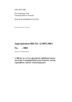 2002-2003-2004 The Parliament of the Commonwealth of Australia HOUSE OF REPRESENTATIVES Presented and read a first time Appropriation Bill (No. 4) 2003-2004 No. , 2004 (Finance and Administration) A Bill for an Act to appropriate additional money out of the Consolidated Revenue Fund for certain expenditure, and for related purposes Contents Part 1—Preliminary 1 2 3 4 5 1 Short title ........................................................................................... 1 Commencement ................................................................................. 2 Definitions ......................................................................................... 2 Portfolio Budget Statements and Portfolio Additional Estimates Statements ......................................................................... 3 Notional payments, receipts etc. ........................................................ 4 Part 2—Basic appropriations 6 7 8 9 10 11 12 5 Summary of basic appropriations ...................................................... 5 State payment items—basic appropriation ........................................ 5 Administered items—basic appropriation ......................................... 5 Administered assets and liabilities items—basic appropriation...................................................................................... 6 Other departmental items—basic appropriation ................................ 6 Reduction of appropriations upon request ......................................... 7 Reduction of appropriations from prior years upon request .............. 8 Part 3—Additions to basic appropriations 13 14 11 Other departmental items—adjustments and borrowings ................ 11 Advance to the Finance Minister—unforeseen expenditure etc. ................................................................................................... 11 Part 4—Miscellaneous 15 16 17 13 Crediting amounts to Special Accounts ........................................... 13 Conditions etc. applying to State payment items ............................. 13 Appropriation of the Consolidated Revenue Fund........................... 14 Schedule 1—Payments to or for the States 15 Schedule 2—Services for which money is appropriated 18 i Appropriation Bill (No. 4) 2003-2004 No. , 2004 3 A Bill for an Act to appropriate additional money out of the Consolidated Revenue Fund for certain expenditure, and for related purposes 4 The Parliament of Australia enacts: 1 2 5 6 7 8 Part 1—Preliminary 1 Short title This Act may be cited as the Appropriation Act (No. 4) 2003-2004. Appropriation Bill (No. 4) 2003-2004 No. , 2004 1 Part 1 Preliminary Section 2 1 2 Commencement This Act commences on the day on which it receives the Royal Assent. 2 3 4 3 Definitions 5 In this Act, unless the contrary intention appears: 6 administered assets and liabilities item means an amount set out in Schedule 2 in relation to an entity opposite the heading “Administered Assets and Liabilities”. 7 8 administered item means an amount set out in Schedule 2 opposite an outcome of an entity under the heading “New Administered Expenses”. 9 10 11 Agency has the same meaning as in the Financial Management and Accountability Act 1997. 12 13 Commonwealth authority has the same meaning as in the Commonwealth Authorities and Companies Act 1997. 14 15 17 Commonwealth company has the same meaning as in the Commonwealth Authorities and Companies Act 1997. 18 current year means the financial year ending on 30 June 2004. 19 entity means any of the following: (a) an Agency; (b) a Commonwealth authority; (c) a Commonwealth company. 16 20 21 22 24 expenditure means payments for expenses, acquiring assets, making loans or paying liabilities. 25 Finance Minister means the Minister administering this Act. 26 item means any of the following: (a) a State payment item; (b) an administered item; (c) an administered assets and liabilities item; 23 27 28 29 2 Appropriation Bill (No. 4) 2003-2004 No. , 2004 Preliminary Part 1 Section 4 1 2 3 4 5 6 7 8 9 10 11 12 13 14 15 16 17 18 19 20 21 22 23 24 25 26 27 28 29 30 31 32 (d) an other departmental item. other departmental item means an amount set out in Schedule 2 in relation to an entity: (a) opposite the heading “Equity Injections”; or (b) opposite the heading “Loans”; or (c) opposite the heading “Previous Years’ Outputs”. Portfolio Additional Estimates Statements means the Portfolio Additional Estimates Statements that were tabled in the Senate or the House of Representatives in relation to the Bill for this Act and the Bill for the Appropriation Act (No. 3) 2003-2004. Portfolio Budget Statements means the Portfolio Budget Statements that were tabled in the Senate or the House of Representatives in relation to the Bill for the Appropriation Act (No. 1) 2003-2004 and the Bill for the Appropriation Act (No. 2) 2003-2004. Special Account has the same meaning as in the Financial Management and Accountability Act 1997. State includes the Australian Capital Territory and the Northern Territory. State payment item means an amount set out in Schedule 2 opposite an outcome of an entity under the heading “Specific Payments to the States and Territories”. 4 Portfolio Budget Statements and Portfolio Additional Estimates Statements (1) The Portfolio Budget Statements and Portfolio Additional Estimates Statements are hereby declared to be relevant documents for the purposes of section 15AB of the Acts Interpretation Act 1901. Note: See paragraph 15AB(2)(g) of the Acts Interpretation Act 1901. (2) If the Portfolio Budget Statements or Portfolio Additional Estimates Statements indicate that activities of a particular kind were intended to be treated as activities in respect of a particular Appropriation Bill (No. 4) 2003-2004 No. , 2004 3 Part 1 Preliminary Section 5 outcome, then expenditure for the purpose of carrying out those activities is taken to be expen
