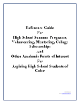 Reference Guide For High School Summer Programs, Volunteering, Mentoring, College Scholarships And Other Academic Points of Interest For Aspiring High School Students of Color Nicolas Lataillade GreenVerse, LLC Tel: 703.578.3395 E-Mail: Nicolas@GreenVersellc.com Table of Contents Table of Contents Table of Contents .....................................................................................................2 College & University Fairs & Festivals..................................................................6 Historically Black Colleges & Universities College Festival: .................................................... 6 T.C. Williams College Fair: ........................................................................................................ 6 College & University Scholarships .........................................................................6 General scholarship and loan information: ................................................................................. 6 100 Black Men of America Scholarship: .................................................................................... 7 Advancing Hispanic Excellence in Technology, Engineering. Math and Science (AHETEMS) Scholarship: ................................................................................................................................. 7 African American Future Achievers Scholarship Program: ....................................................... 7 American Chemical Society Scholars Program: ......................................................................... 7 American Society for Engineering Education (ASEE): .............................................................. 8 BlackExcel.org’s 100 Minority Scholarships: ............................................................................ 8 Carson Scholarship Fund: ........................................................................................................... 8 Children's Defense Fund - Beat the Odds Scholarship: .............................................................. 8 Colgate Palmolive Hispanic Scholarship Fund - Haz la U Educational Grant Scholarship Program: ...................................................................................................................................... 9 College Scholarships for Minority Student Scholarships: .......................................................... 9 CollegeToolkit.com: .................................................................................................................... 9 Esperanza Education Fund: ......................................................................................................... 9 Free Application for Federal Student Aid (FAFSA): ................................................................ 10 George Mason University EIP (Early Identification Program) Scholarship Program: ............. 10 Hispanic Association of Colleges and Universities (HACU) ................................................... 11 Hispanic College Fund: ............................................................................................................. 11 Hispanic Heritage Foundation Scholarships: ............................................................................ 11 Hispanic Scholarship Fund: ...................................................................................................... 11 Jackie Robinson Foundation Scholarship Program:.................................................................. 11 Link, Inc. 4 Year Scholarship: .................................................................................................. 11 MTTG JV Scholarship (McKissak & McKissak, Turner Tompkins, & Guilford, Inc Joint Venture):.................................................................................................................................... 12 NAACP (The National Association for the Advancement of Colored People) / UNCF (The United Negro College Fund): .................................................................................................... 12 National Society for Back Engineers High School Student Scholarships (NSBE): ................. 12 Nordstrom Ten4U Scholarship Program: .................................................................................. 13 Northern Virginia Urban League College Scholarship Fund (NVUL): .................................... 13 Posse Foundation, Inc.: ............................................................................................................. 14 Restoring Lives Community Development Corporation (RLCDC) Annual Scholarship Program: .................................................................................................................................... 15 Ron Brown Scholar Program: ................................................................................................... 15 Ronald McDonald House Charities (RMHC) Scholarships:..................................................... 16 Scholar Snapp:........................................................................................................................... 16 SMART (The Science, Mathematics and Research for Transformation) Scholarship for Service Program: .................................................................................................................................... 16 Society for Women Engineers (SWE): ..................................................................................... 16 Tailwheels Flight Scholarship Program: ................................................................................... 17 Torch Scholars Program ............................................................................................................ 17 Thurgood Marshall College Scholarship Fund: ........................................................................ 18 Tuskegee Airmen Scholarship Foundation: ................................