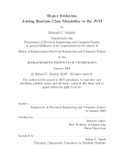 Object Evolution: Adding Runtime Class Mutability to the JVM by Richard C. Schalck Submitted to the Department of Electrical Engineering and Computer Science in partial fulfillment of the requirements for the degree of Master of Engineering in Electrical Engineering and Computer Science at the MASSACHUSETTS INSTITUTE OF TECHNOLOGY January 2005 c Richard C. Schalck, MMV. All rights reserved. The author hereby grants to MIT permission to reproduce and distribute publicly paper and electronic copies of this thesis and to grant others the right to do so. Author . . . . . . . . . . . . . . . . . . . . . . . . . . . . . . . . . . . . . . . . . . . . . . . . . . . . . . . . . . . . . . Department of Electrical Engineering and Computer Science 10 January 2005 Certified by . . . . . . . . . . . . . . . . . . . . . . . . . . . . . . . . . . . . . . . . . . . . . . . . . . . . . . . . . . Barbara Liskov Ford Professor of Engineering Thesis Supervisor Accepted by . . . . . . . . . . . . . . . . . . . . . . . . . . . . . . . . . . . . . . . . . . . . . . . . . . . . . . . . . Arthur C. Smith Chairman, Department Committee on Graduate Students 2 Object Evolution: Adding Runtime Class Mutability to the JVM by Richard C. Schalck Submitted to the Department of Electrical Engineering and Computer Science on 10 January 2005, in partial fulfillment of the requirements for the degree of Master of Engineering in Electrical Engineering and Computer Science Abstract This thesis proposes an extension to the Java programming language in which a program may specify that an object can change its class at runtime. The project proposes a programmer interface for using this new capability. Given the proposed interface, a particular strategy for implementing the interface is presented. The JVM portion of this strategy is detailed and implemented on top of an existing JVM. The modified JVM is tested using scenarios designed to verify the new runtime class mutability capability. Thesis Supervisor: Barbara Liskov Title: Ford Professor of Engineering 3 4 Acknowledgments My studies at MIT, including this thesis, have been supported by the Raytheon Advanced Study Scholarship Program. As such, I would like to thank Paul Weeks, Anthony Pellegrino, Joe McDougall, and Jeff Lewitzky for supporting my application to this program. A special thanks to Nina Caissie and Joe McDougall for helping with the transitions between work and school. I would also like to thank the DD(X) SITB Team at Raytheon for serving as a great review committee for my ideas, especially Dan Rasmussen and Ryan McLoughlin. I will always be indebted to the JikesRVM Project and its contributors. This thesis benefited immensely from the quality of the documentation, the quality of the code commenting, and the straightforward implementation of JikesRVM. I am very grateful to Barbara Liskov for her guidance on this project. Her questions always pointed me to the areas that needed more thought and elaboration. Finally, I would like to express my gratitude to my family for always supporting me in all of my academic work. 5 6 Contents 1 Motivation 9 2 Other Languages 13 2.1 Smalltalk . . . . . . . . . . . . . . . . . . . . . . . . . . . . . . . . . 13 2.2 CLOS . . . . . . . . . . . . . . . . . . . . . . . . . . . . . . . . . . . 14 3 Object Evolution 3.1 3.2 17 Programmer Interface . . . . . . . . . . . . . . . . . . . . . . . . . . . 17 3.1.1 Type Safety . . . . . . . . . . . . . . . . . . . . . . . . . . . . 18 3.1.2 Field Initialization . . . . . . . . . . . . . . . . . . . . . . . . 22 3.1.3 Controlling Evolution . . . . . . . . . . . . . . . . . . . . . . . 23 Design and Implementation . . . . . . . . . . . . . . . . . . . . . . . 25 3.2.1 Java, Java Compiler, and JVM . . . . . . . . . . . . . . . . . 25 3.2.2 JVM Selection . . . . . . . . . . . . . . . . . . . . . . . . . . . 27 3.2.3 Evolve Opcode . . . . . . . . . . . . . . . . . . . . . . . . . . 27 3.2.4 Object Representation . . . . . . . . . . . . . . . . . . . . . . 28 3.2.5 Runtime Stages and Transitions . . . . . . . . . . . . . . . . . 30 4 Test and Evaluation 4.1 39 Behavior . . . . . . . . . . . . . . . . . . . . . . . . . . . . . . . . . . 39 4.1.1 Methods and Fields . . . . . . . . . . . . . . . . . . . . . . . . 41 4.1.2 Recursive Methods . . . . . . . . . . . . . . . . . . . . . . . . 41 4.1.3 EvolveExceptions . . . . . . . . . . . . . . . . . . . . . . . . . 42 7 4.2 4.1.4 Hash Code . . . . . . . . . . . . . . . . . . . . . . . . . . . . . 42 4.1.5 Locking / Multiple Threads . . . . . . . . . . . . . . . . . . . 42 4.1.6 Garbage Collection Reconstitution . . . . . . . . . . . . . . . 43 4.1.7 Post Reconstitution . . . . . . . . . . . . . . . . . . . . . . . . 44 Performance . . . . . . . . . . . . . . . . . . . . . . . . . . . . . . . . 44 5 Conclusions and Future Work 5.1 5.2 49 Conclusions . . . . . . . . . . . . . . . . . . . . . . . . . . . . . . . . 49 5.1.1 Modeling Benefit . . . . . . . . . . . . . . . . . . . . . . . . . 49 5.1.2 Performance Considerations . . . . . . . . . . . . . . . . . . . 50 Future Work . . . . . . . . . . . . . . . . . . . . . . . . . . . . . . . . 51 8 Chapter 1 Motivation Many problem domains include mutable objects that change over time. Based on the interactions of the objects in the domain, the instance variables (or fields) of these objects are modified. However, in some domains, there are objects that change not only the values of the fields, but also the number and type of fields that the object carries. It may even be the case that the behavior of these objects (i.e. the object’s methods) may need to change over time. This situation is apparent in a domain that represents a group of humans and their interactions. In this domain, one might imagine many instances of a Human class. This class may have instance variables that include age, weight, etc. The values of these fields would likely change over time. In addition, as the Human became an adult, new inst