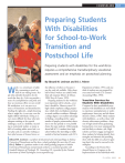 COUNSELING 101 Preparing Students With Disabilities for School-to-Work Transition and Postschool Life STOCK PHOTO IMAGE Preparing students with disabilities for the workforce requires a comprehensive transdisciplinary vocational assessment and an emphasis on postschool planning. By Edward M. Levinson and Eric J. Palmer ork is a central part of adult life, consuming as much as half of our waking hours. People often identify themselves by the work that they do. A job can provide a sense of accomplishment and pride and have an enormous effect on our overall life satisfaction, or it can serve as a source of frustration and dissatisfaction. Finding the right job—simply knowing what it might be—is not easy, even for highly skilled individuals. Doing so is even more difficult for those who lack adequate training or face special challenges, such as a disability. According to nationwide studies, as many as 66% of working adults never had a career plan and are currently working at their jobs because of chance factors or W the influence of others or because it was the only job available. Only about half of these workers are satisfied with their job situation (Brown & Minor, 1989; Hoyt & Lester, 1995). Preparing students for the workforce is an important role for schools—or at least it should be. However, most U.S. high schools emphasize college preparation, which often overshadows attention to actual workforce readiness. Although a college degree is an excellent advantage in finding a rewarding job for a great number of people, postsecondary education is not the optimal or even possible choice for many students. Unfortunately, about half of U.S. students leave high school without the knowledge or skills needed to find and maintain a job (U.S. Edward M. Levinson is a professor of educational and school psychology at Indiana University of Pennsylvania and has been a school psychologist for more than 25 years. Eric J. Palmer is a graduate student in the school psychology program at Indiana University of Pennsylvania and previously worked as a vocational specialist with Goodwill Industries of Pittsburgh, PA. Counseling 101 is provided by the National Association of School Psychologists (www.nasponline.org). Department of Labor, 1991), and onethird of students are not prepared for even entry-level work (U.S. General Accounting Office, 1993). Transition Services for Students With Disabilities Compared to their nondisabled peers, students with disabilities are more likely to experience unemployment or underemployment, lower pay, and job dissatisfaction (Dunn, 1996). Many students with disabilities—as well as those with chronic achievement problems—drop out of high school before graduating, leaving them even more unprepared for and less likely to obtain a job. High schools can better engage and support these students by helping identify their strengths and interests and providing them with the skills (or a plan for gaining them) they need to succeed in the workplace. According to the Twenty-First Annual Report to Congress on the Implementation of the Individuals with PL APRIL 2005 11 COUNSELING 101 Disabilities Education Act (U.S. Department of Education, 1999), only about one-fourth of students with disabilities graduate from high school with a diploma; however, these students were less likely to drop out of school and more likely to be competitively employed if they received adequate vocational education training in high school. Further, there are key legal entitlements—the Carl D. Perkins Vocational Act and the Individuals With Disabilities Education Act (IDEA)—that mandate workforce preparation for students with disabilities. School administrators should be familiar with these provisions for vocational assessment and training and ensure that school programs are consistent with these mandates. Of course, many students with disabilities do go to college and have great success, and school personnel should never downgrade their expectations for these students. It is important for principals to build the capacity of their staff members to help students and their parents accurately determine what vocational and life skills training is appropriate. The core elements of workforce preparation for students with disabilities are the same as those for their nondisabled peers—awareness of interests and aptitudes, exposure to career options, and assessing and building skills—but they require more extensive and individualized support from school personnel and other adults. Assessment and Planning: Keys to Successful Postschool Transitions Transdisciplinary Assessment A major ingredient of a successful school-to-work transition program is a comprehensive, transdisciplinary vocational assessment that integrates a variety of school and community agency personnel into the assessment process. The assessment process should include teachers, counselors, and psychologists—as well as representatives from community mental health/mental retardation, vocational rehabilitation, and social services agencies—who work together to identify relevant transition needs and plan appropriate services. Parents, state agencies, MANDATED VOCATIONAL SERVICES FOR STUDENTS WITH DISABILITIES Two key legislative acts that address workforce preparation of students are the Carl D. Perkins Vocational Education Act and the Individuals with Disabilities Education Act (IDEA). The purpose of the Perkins Act, which is currently in the process of being reauthorized, is to provide technical training and education to students who do not necessarily plan on going to college. The act requires schools to provide parents and students with: • Vocational education opportunities, which should be offered to the student by the beginning of ninth grade or one year before the student enters the grade in which vocational education is offered • Eligibility requirements for enrolling in vocational education. In addition, students with disabilitie