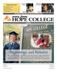 Inside This Issue Season in Review Reflections on Year One Please see page 14. Please see page 24. Outstanding Professor ................... 2 Art in the Family .............................. 3 Psych Alumni Confer .................... 12 TV Game Fame .............................. 16 PUBLISHED BY HOPE COLLEGE, HOLLAND, MICHIGAN 49423 news from HOPE COLLEGE June 2000 Beginnings and Returns More than 500 seniors started their post–Hope journeys. Nearly 1,000 alumni already on theirs came back. In either case, the weekend of May 5–7 was a chance to celebrate in a place with meaning and with friends who understood. Please see pages five through 11. Hope College 141 E. 12th St. Holland, MI 49423 ADDRESS SERVICE REQUESTED Non-Profit Organization U.S. Postage PAID Hope College Campus Notes Graham Peaslee receives H.O.P.E. Award Dr. Graham Peaslee has been presented the 36th annual “Hope Outstanding Professor Educator” (H.O.P.E.) award by the Class of 2000. Dr. Peaslee, an assistant professor of chemistry and of environmental science, was honored during the college’s annual Honors Convocation, held in Dimnent Memorial Chapel on Thursday, April 27. The award, first given in 1965, is presented by the graduating class to the professor who they feel epitomizes the best qualities of the Hope College educator. The recipient doesn’t know that the recognition is coming, and Dr. Peaslee’s colleagues needed to be creative to get him to attend: ironically, Hope’s outstanding professor–educator was teaching a class that met at the same time as the convocation. They thus concocted an “emergency”: that he needed to leave the class to help present some student awards. He dutifully complied, but... “That’s when I knew something was going on,” he told The Holland Sentinel for a story the next day. “They could have used anybody to help hand out awards.” Dr. Peaslee has been a member of the Hope faculty since 1993. He was the first recipient from either the department of chemistry or the department of geological and environmental sciences to receive the honor. He began his time at Hope as a National Science Foundation post–doctoral fellow and visiting assistant professor, was appointed assistant professor of chemistry in 1994 and was appointed assistant professor of environmental science in 1996. He has had approximately 100 refereed publications since 1983, including seven with 21 Hope undergraduate co–authors. His work at the college has been supported through a variety of external grants, including from the National Science Foundation for his research in heavy ion reactions, and he is or has been involved with a variety of national committees and organizations. Prior to joining the Hope faculty, Dr. Peaslee was a post–doctoral fellow at the National Superconducting Cyclotron Laboratory at MSU. He was also a post–doctoral fellow in the Nuclear Science Division at Lawrence Berkeley Laboratory. He completed his bachelor’s degree in chemistry in 1981 at Princeton University, and his doctorate in general physics in 1987 at the State University of New York at Stony Brook. His wife, Dr. Catherine Mader, is an associate professor of physics at Hope. “Quote, unquote” Quote, unquote is an eclectic sampling of things said at and about Hope College. This year’s Presidential Lecture Series considered the future of higher education with a focus on Hope, an on–going commemoration of the inaugural year of President James Bultman ’63. The final address, “Does Leadership Have a Future?,” was presented on Wednesday, March 29, by Max DePree ’48, chairman emeritus of Herman Miller Inc. and the author of books on leadership, as well as former chair of the college’s Board of Trustees. He presented and addressed six questions: “Who do we intend to be?,” “Are we, or are we not, made in God’s image?,” “In the company cafeteria, how good should the bagels be?,” “What will I die for?,” “Is the behavior of leaders public property?” and “What may a leader not delegate?” Excerpts follow from his discussion of the second question. “Well, you know I believe that when we ask questions about why our neighbors are losing hope, and why we find it so difficult to find common ground in our society, I believe one of the reasons it’s a mystery to us is because we don’t think enough about love. And also, I think we don’t think enough about the implication of being made in God’s image. If we are made in the image of God, can you imagine that the way we treat each other is a matter of indifference to God Himself? “I believe if leadership is to have a future, then surely two things have to be honored. “The first, I believe that personal relationships must be built on integrity and truth–telling... After the Berlin Wall fell, a noted East German philosopher, in one of his books, wrote that the key reason communism had to fall was because they practiced objective untruthfulness. Scares the daylights out of me, when I realize how we do it, too. “Number two of the two things that I believe need to be honored: I believe that followers and their needs have to be taken seriously. When you think about taking seriously the needs of anybody, or taking 2 anybody seriously, it’s important to understand that that’s always the first sign of respect. The first sign of respect is always whether or not you’re going to take me seriously. But this is a two–way street. Followers have to see themselves as integral to the work of leaders. And the quality of following strongly impacts the quality and effectiveness of leadership. “People often ask me about the origins of the human relations program and the diversity program at Herman Miller. I’d like to tell you a story about how that occurred. “In the late ’20s, my dad and the person that he worked most closely with, the number two man in the company, James Eppinger, came to the conclusion that they were going